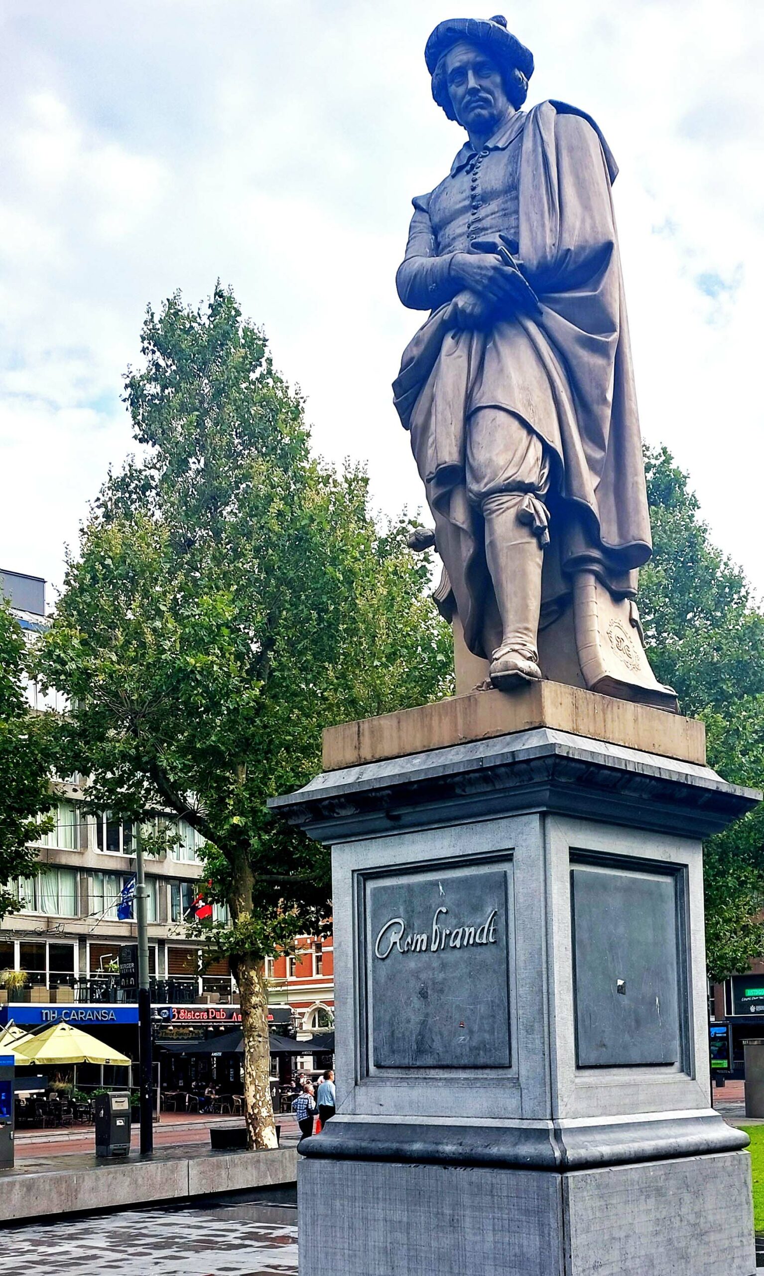 Deshalb fahren wir mit der 14er Tram zum Rembrandtplein. Und da steht er, einer der grĂ¶ĂŸten und bekanntesten Maler der Niederlande, in Gusseisen auf hohem Sockel inmitten des GetĂŒmmels am Plein.