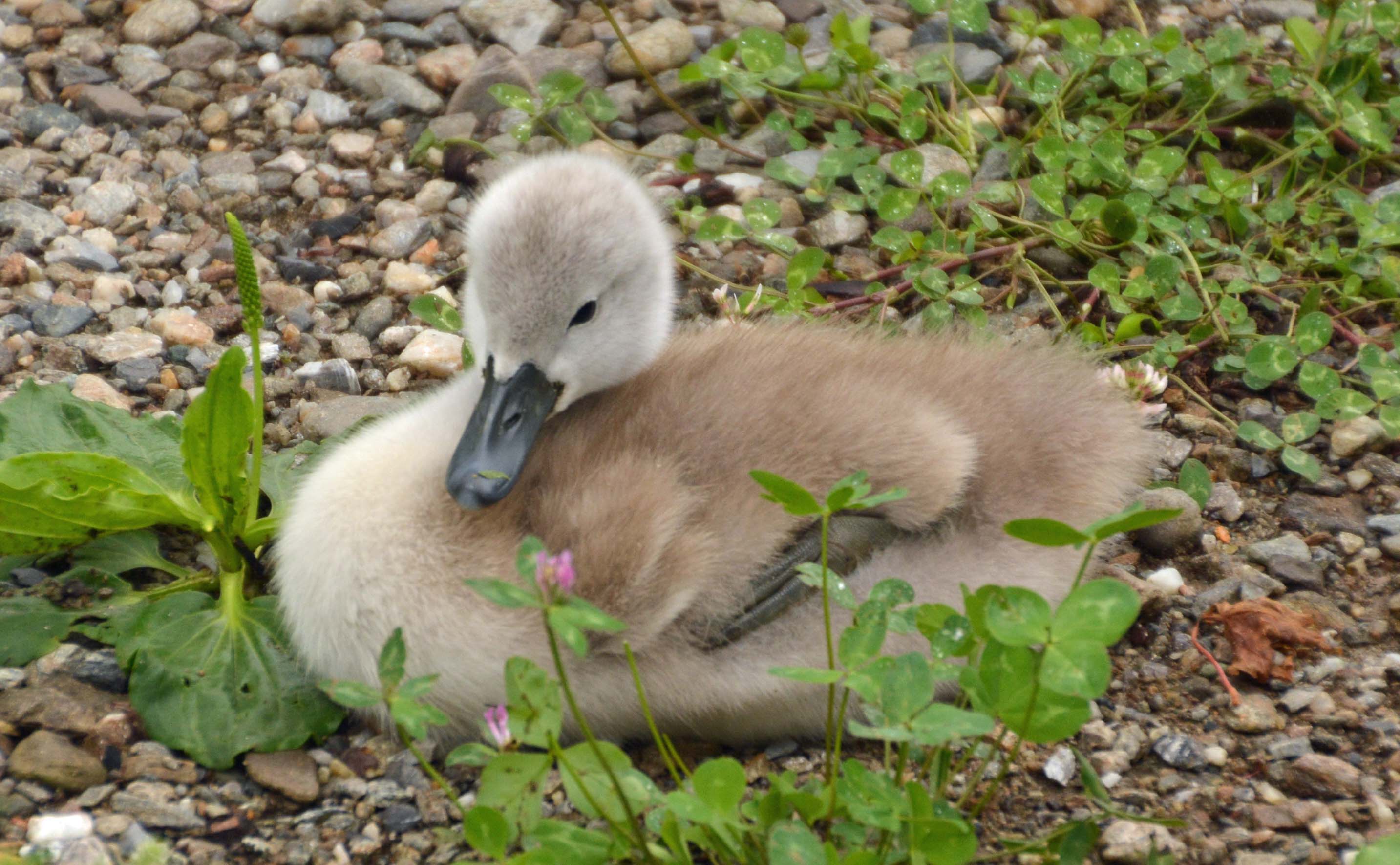 Eine Schwanenfamilie watschelt an uns vorbei.