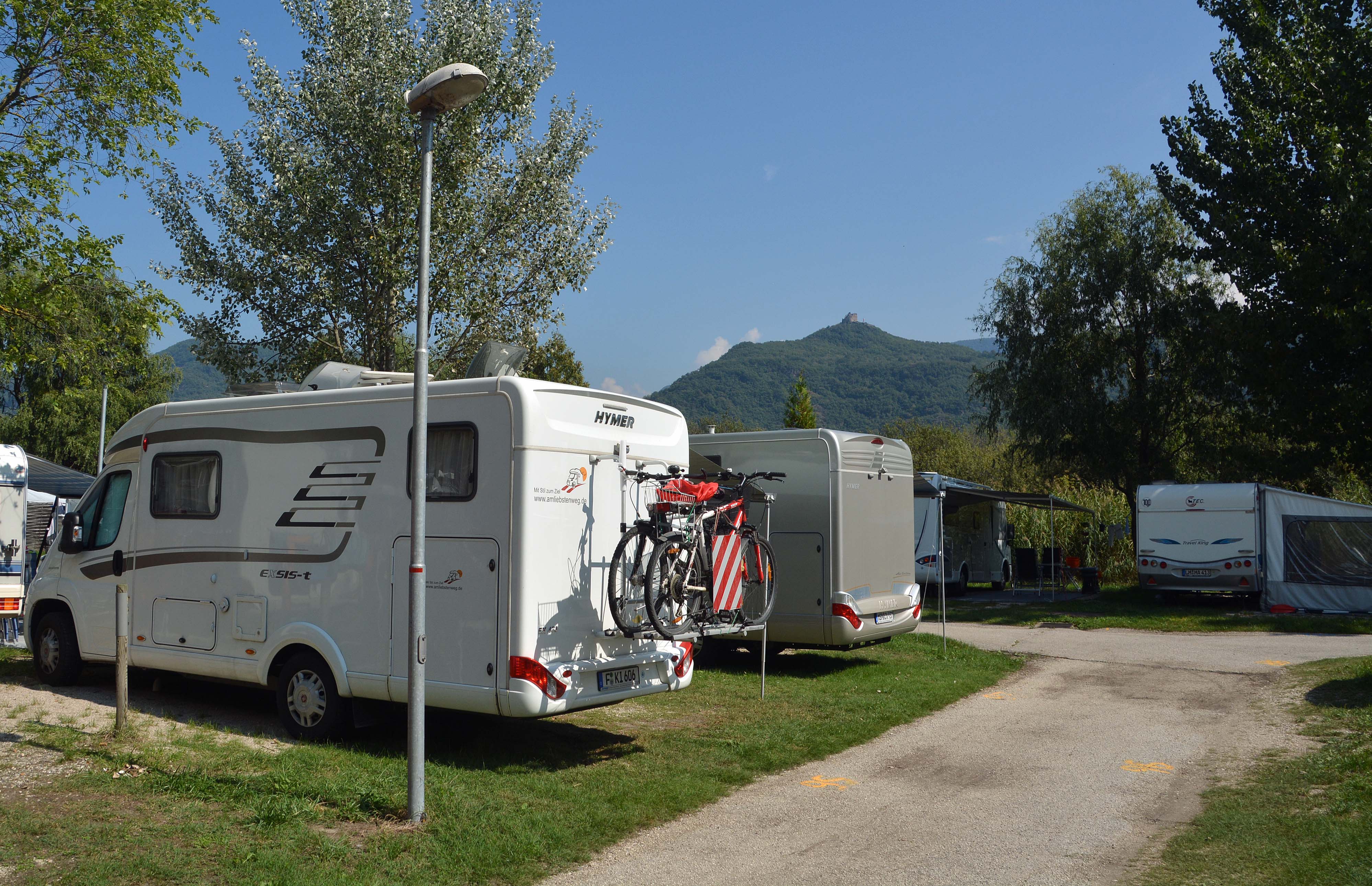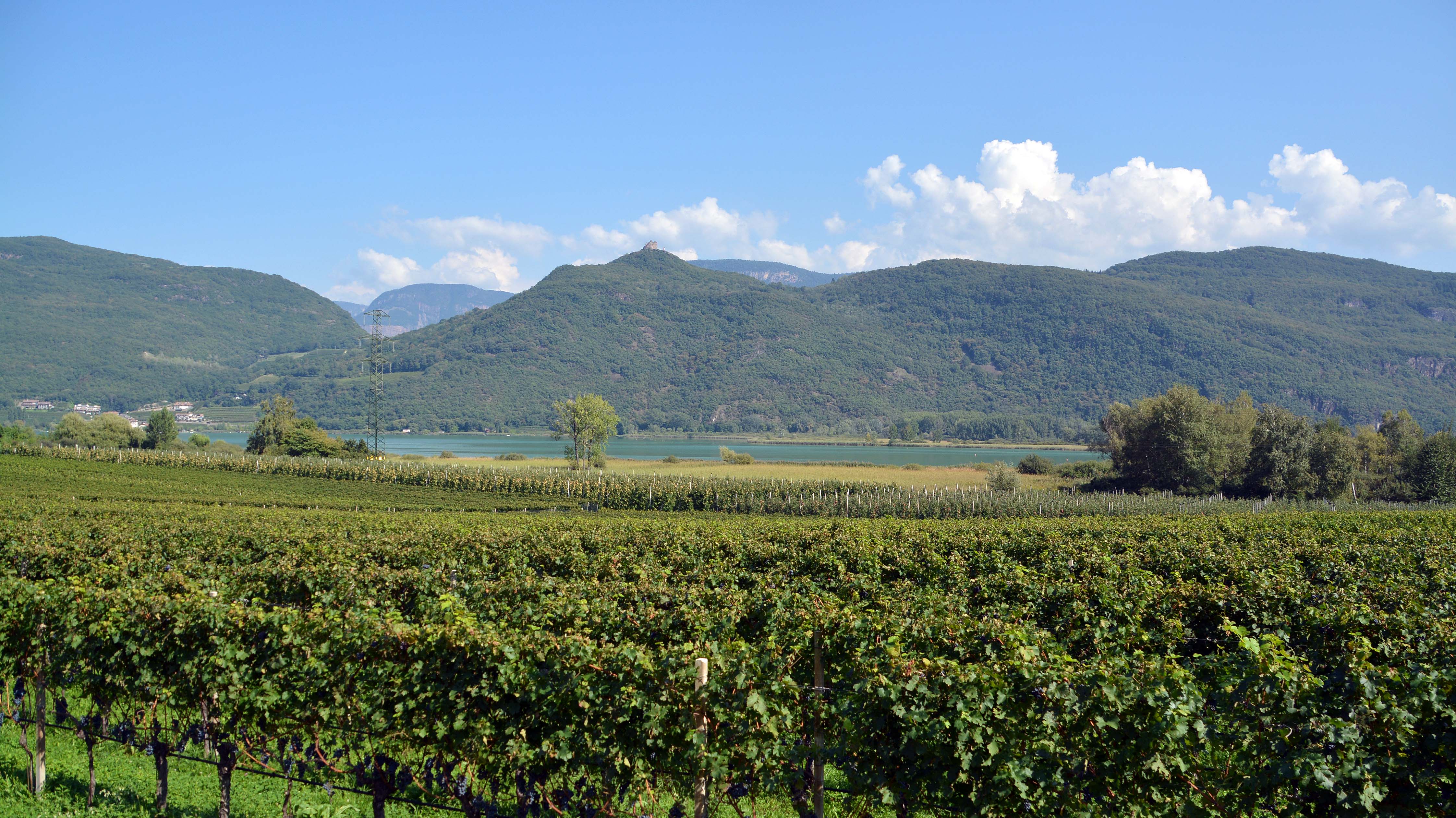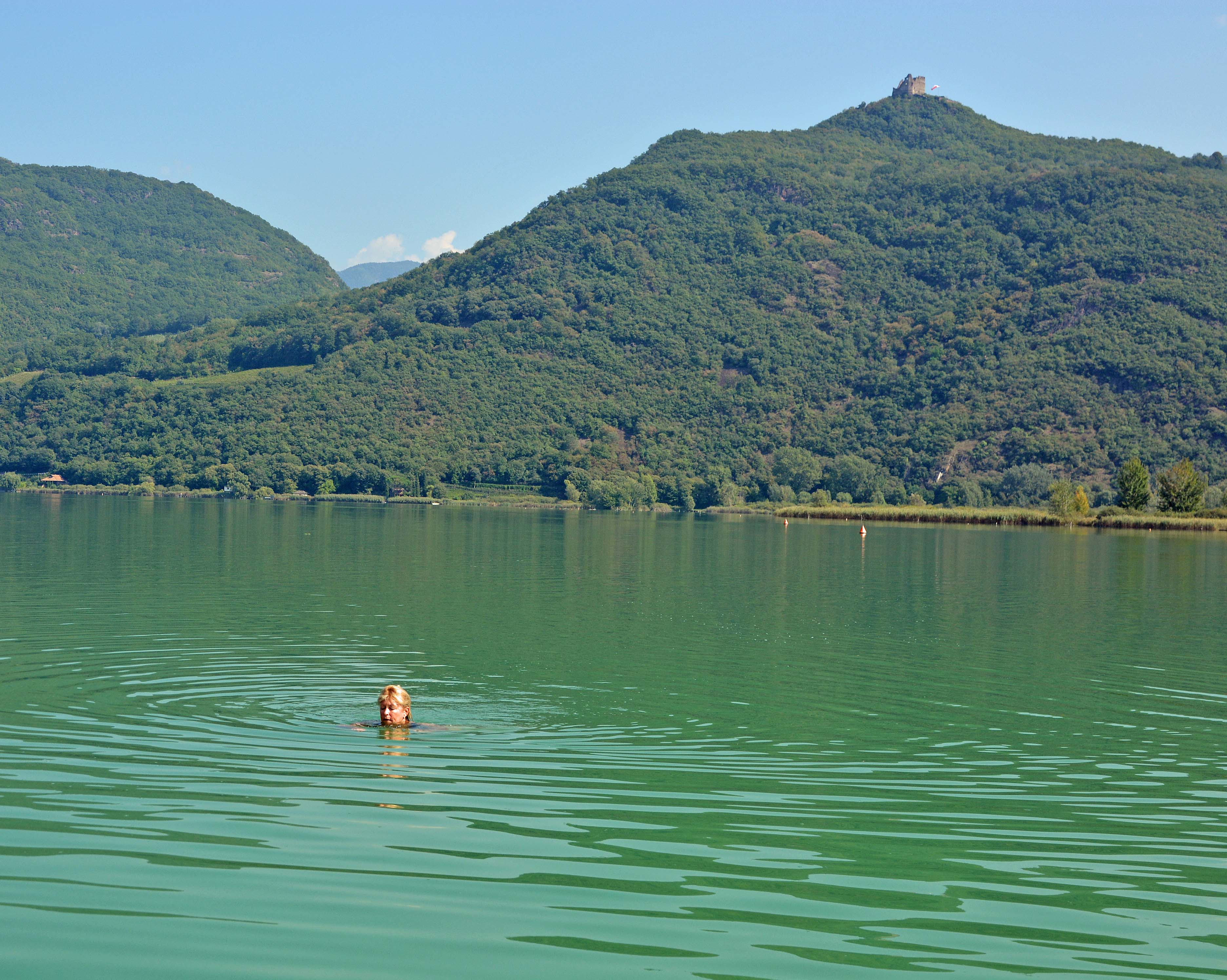 Die Sonne scheint, es ist herrlich warm, wir frühstücken gemütlich und nehmen das erste Bad im wärmsten Badesee der Alpen – genau gegenüber der Burgruine Leuchtenburg, dem inoffiziellen Wahrzeichen von ‚Caldaro al Lago‘.