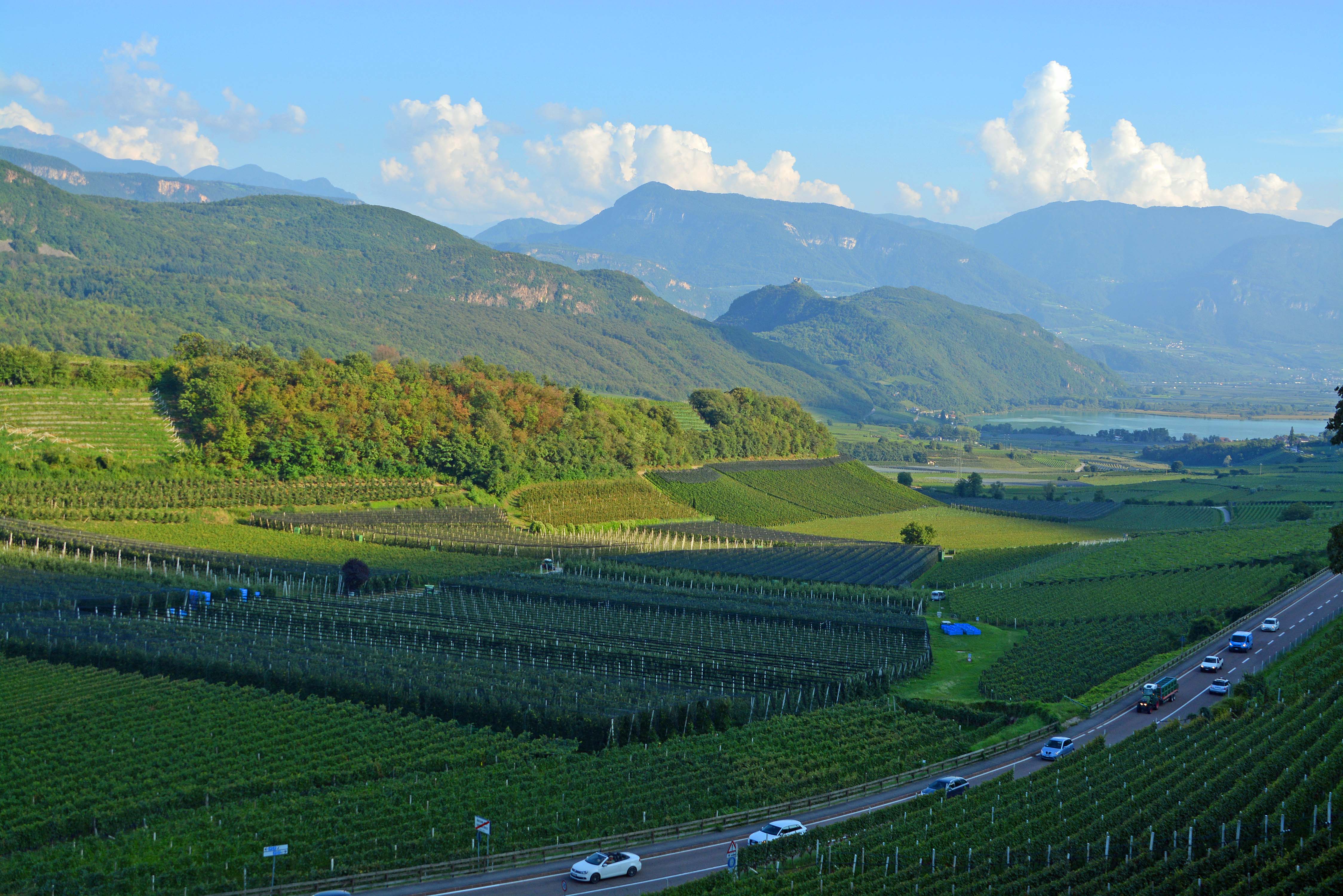 Wir sind angekommen in Südtirol – der nördlichsten Provinz Italiens. Hier gibt es das größte zusammenhängende Apfelanbaugebiet Europas. Kilometerweit ziehen sich die niedrigen Baumreihen schnurgerade durch die Täler. 85% des ‚Lands am Gebirg‘ liegt über 1000 Meter hoch. Und kilometerweit stehen die Weinreben. In diesem Gebiet haben die Römer erst die Lagerung des Weins in Holzfässern gelernt.