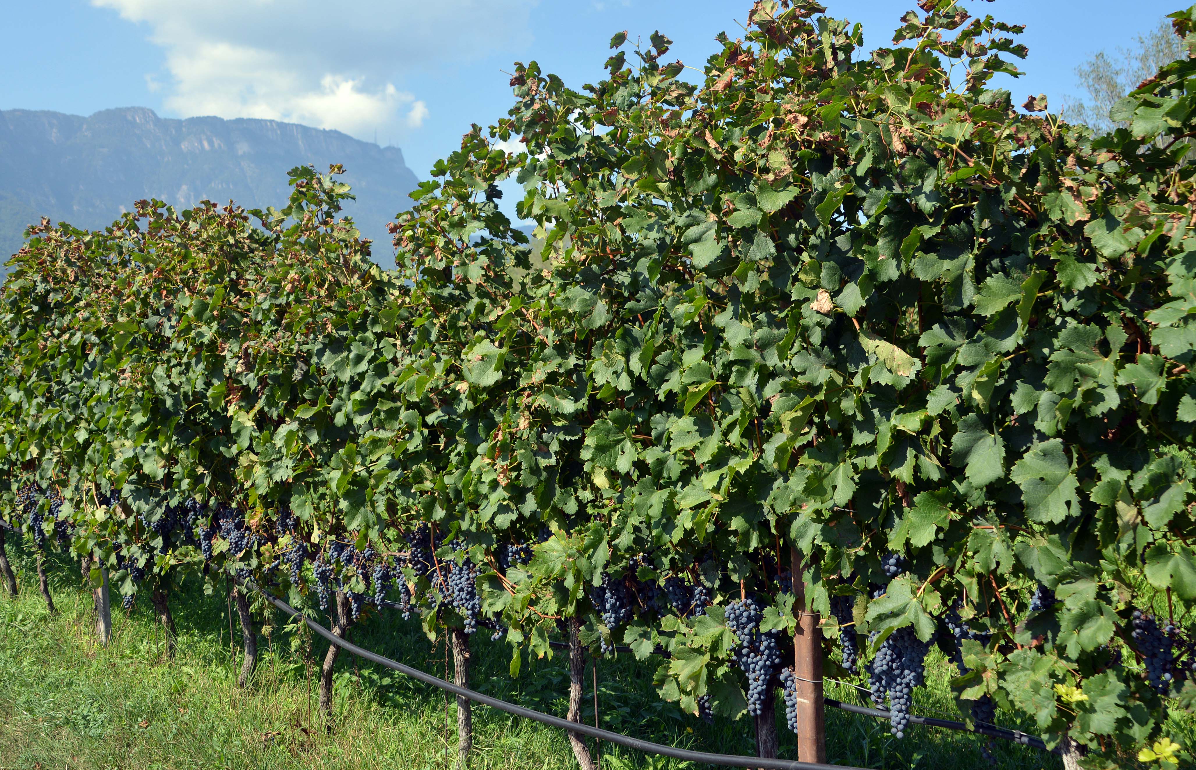 Am frühen Nachmittag wage ich mich mit dem Arbeitnehmer auf dem Rad die 250 Höhenmeter hinauf in den Weinort Kaltern an der Weinstraße. Es sind nur 6 Km, aber die haben es in sich. Schwülwarme Temperaturen und sengende Sonne tun ihr übriges. Ich japse nach Luft und kann die herrlichen Obstwiesen und Weinreben gar nicht richtig genießen. Den letzten Kilometer muss ich schieben, Klaus hilft und schleppt sogar die Kamera.