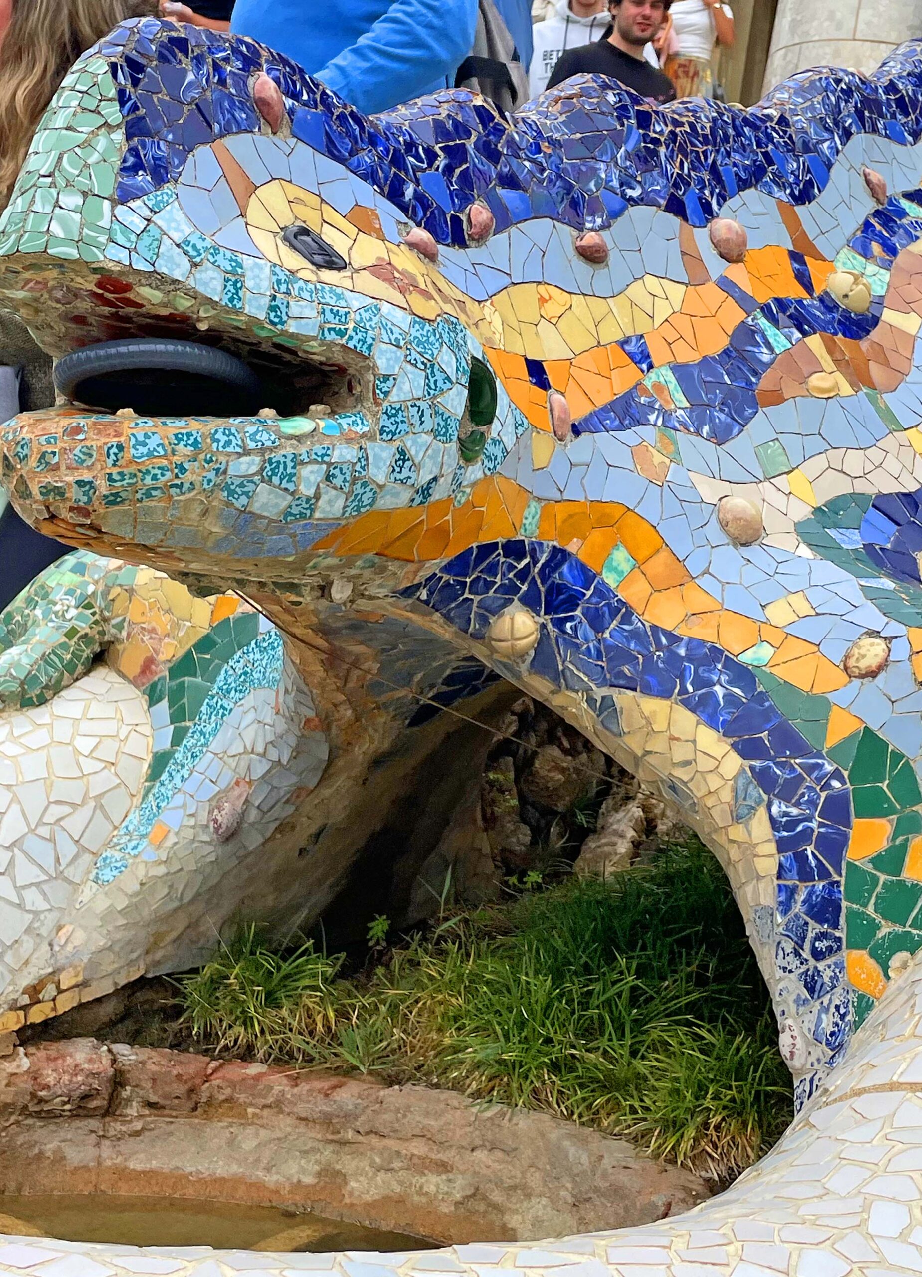 Von hier gelangen wir auf die ikonische Drachentreppe und zum umschwärmten Star des Parks, dem farbenfrohen zahnlosen Mosaikdrachen „El Drac“.🐲