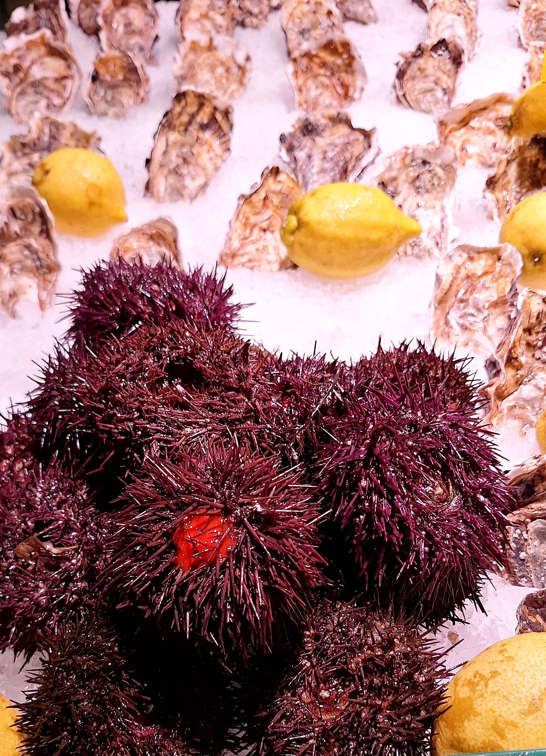 Wir flüchten uns in die Seiteneingänge der Halle und entdecken dort wunderbare, üppig beladene Marktstände mit allem, was das Herz begehrt. Katalonische Spezialitäten, Fisch ohne Ende, Austern, Seeigel, Trockenfrüchte und Nüsse im Überangebot. Gemüse und Obst fein säuberlich aufgetürmt. Und natürlich Süßigkeiten über Süßigkeiten. 🐠🥩🍇🍉🍒🍋🍍🫛🥦🥕🥒 Es ist ein Farbenspiel ohnegleichen.