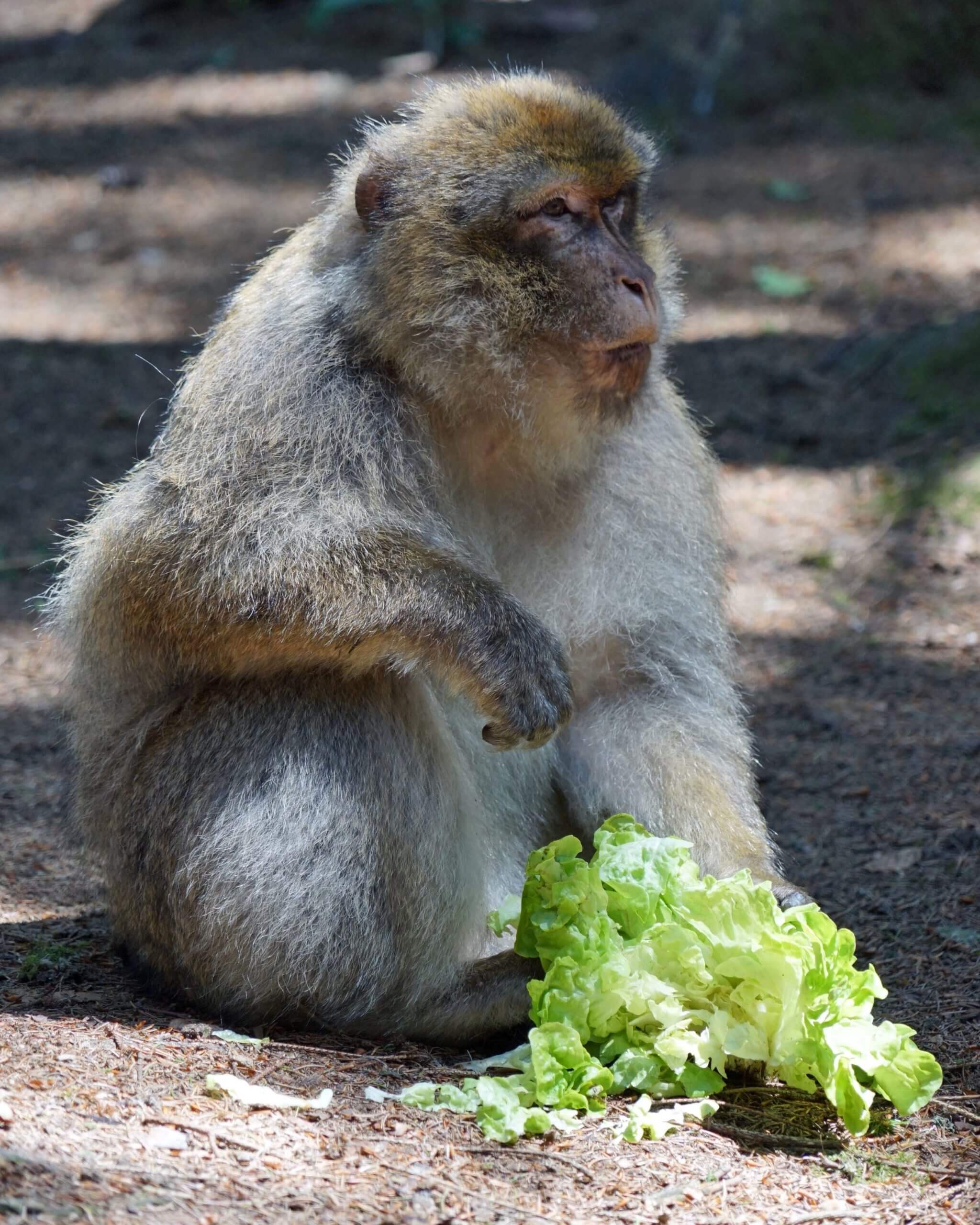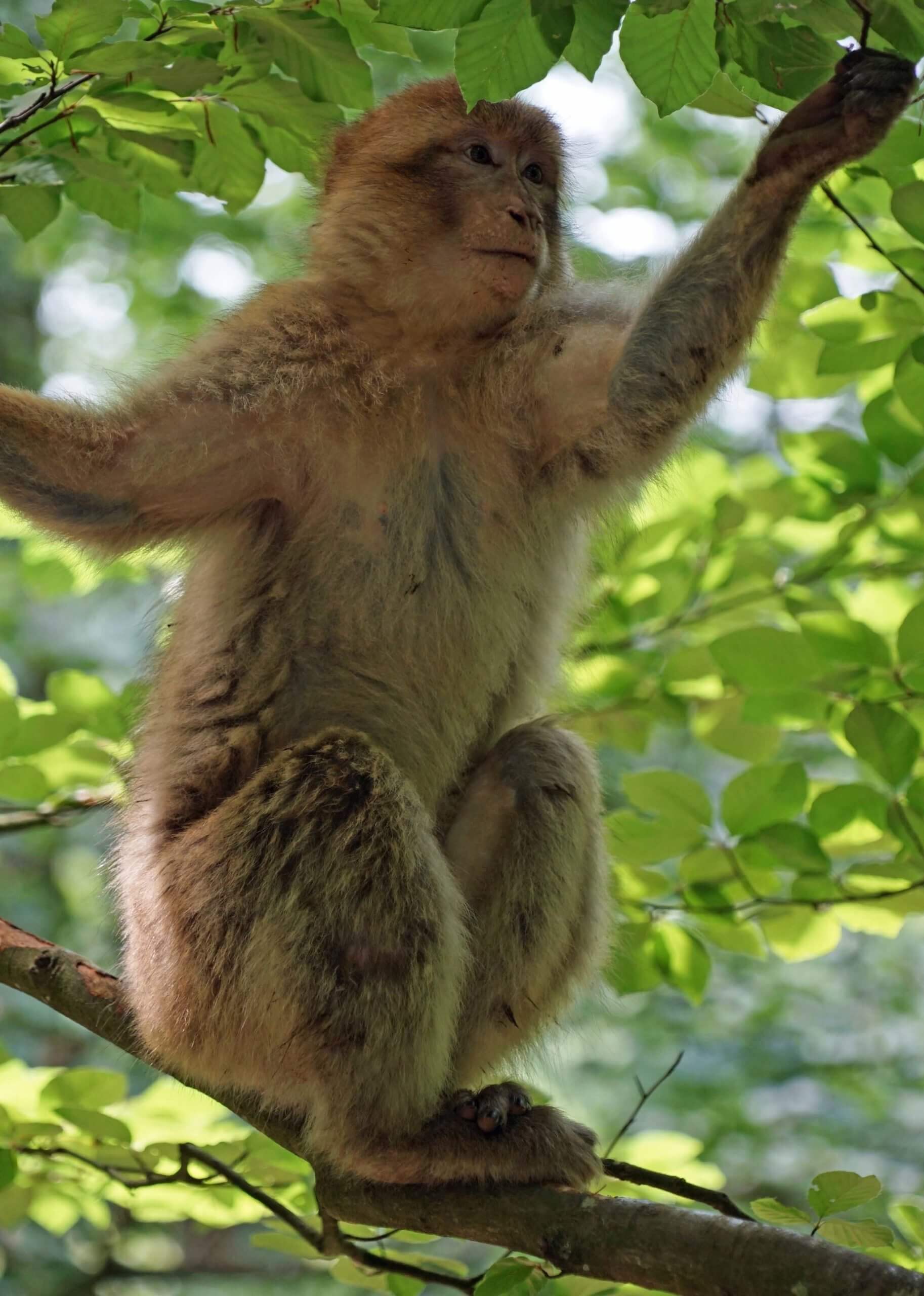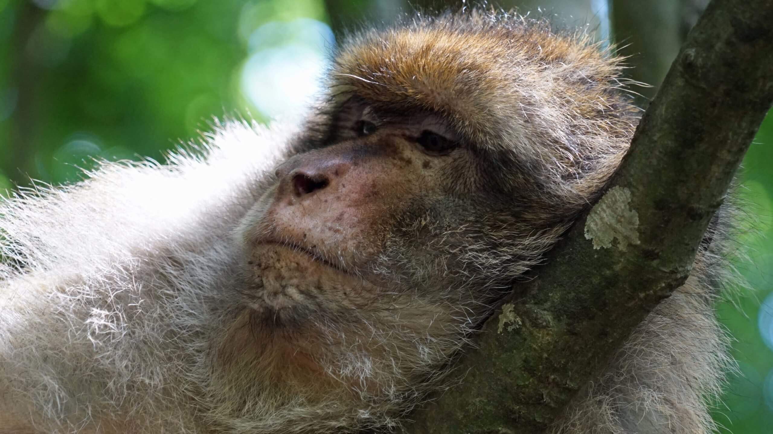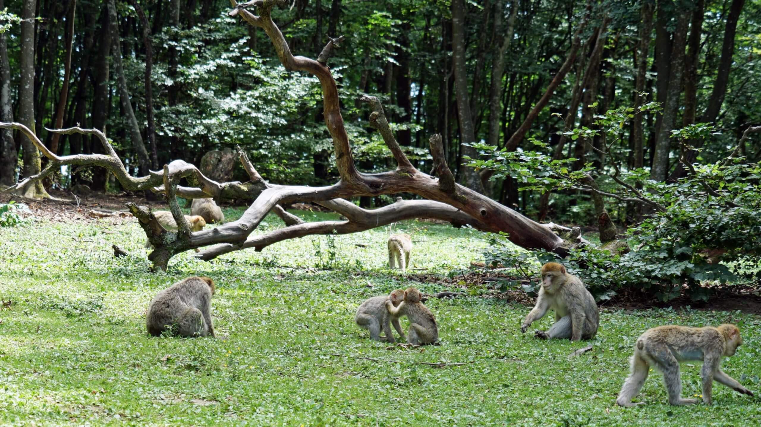 Ein paar hundert Meter weiter nähern wir uns dem Affenberg. Das ist ein Tierpark und zugleich Deutschlands größtes Affenfreigehege. Die Hauptattraktion des über 20 Hektar großen Waldstückes sind die rund 200 Berberaffen, die sich dort frei bewegen. Auf einem Rundweg können wir zahlreiche vom Aussterben bedrohte Berberaffen aus nächster Nähe und mit ihrem natürlichen Verhalten beobachten. Oft müssen wir sehr genau hinschauen, um die Tiere in den Bäumen zu entdecken. Weltweit wird der Bestand auf weniger als 8000 Individuen geschätzt!