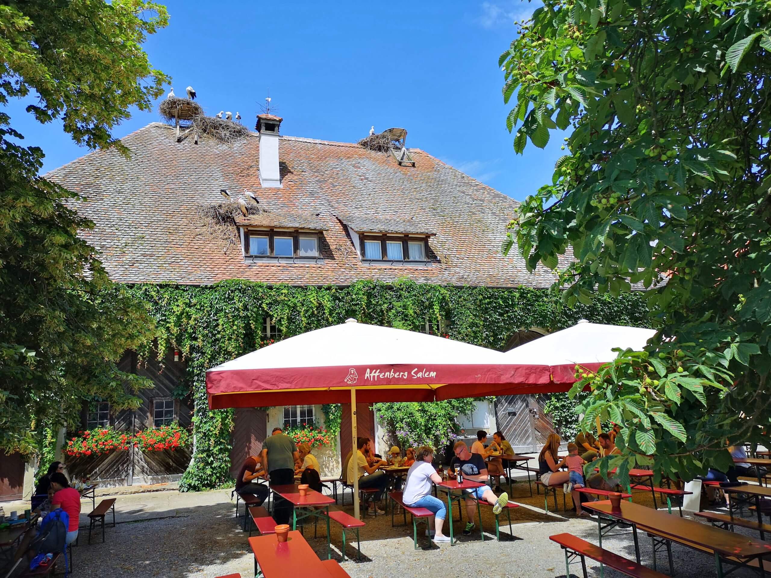 Noch vor dem Parkeingang, befindet sich im Innenhof des über zweihundert Jahre alten Mendlishauser Hofes die gemütliche Selbstbedienungs-Schenke mit großem Biergarten unter Schatten spendenden Bäumen. Zwischen den alten Gemäuern, umgeben von den klappernden Störchen herrscht ein wunderbares Ambiente. Wir beschließen schon jetzt, nach unserer Besichtigung hier ein Päuschen einzulegen.