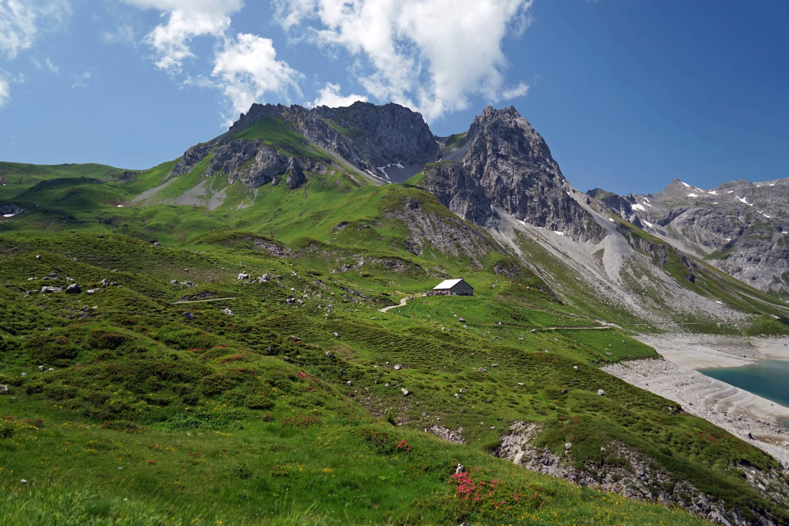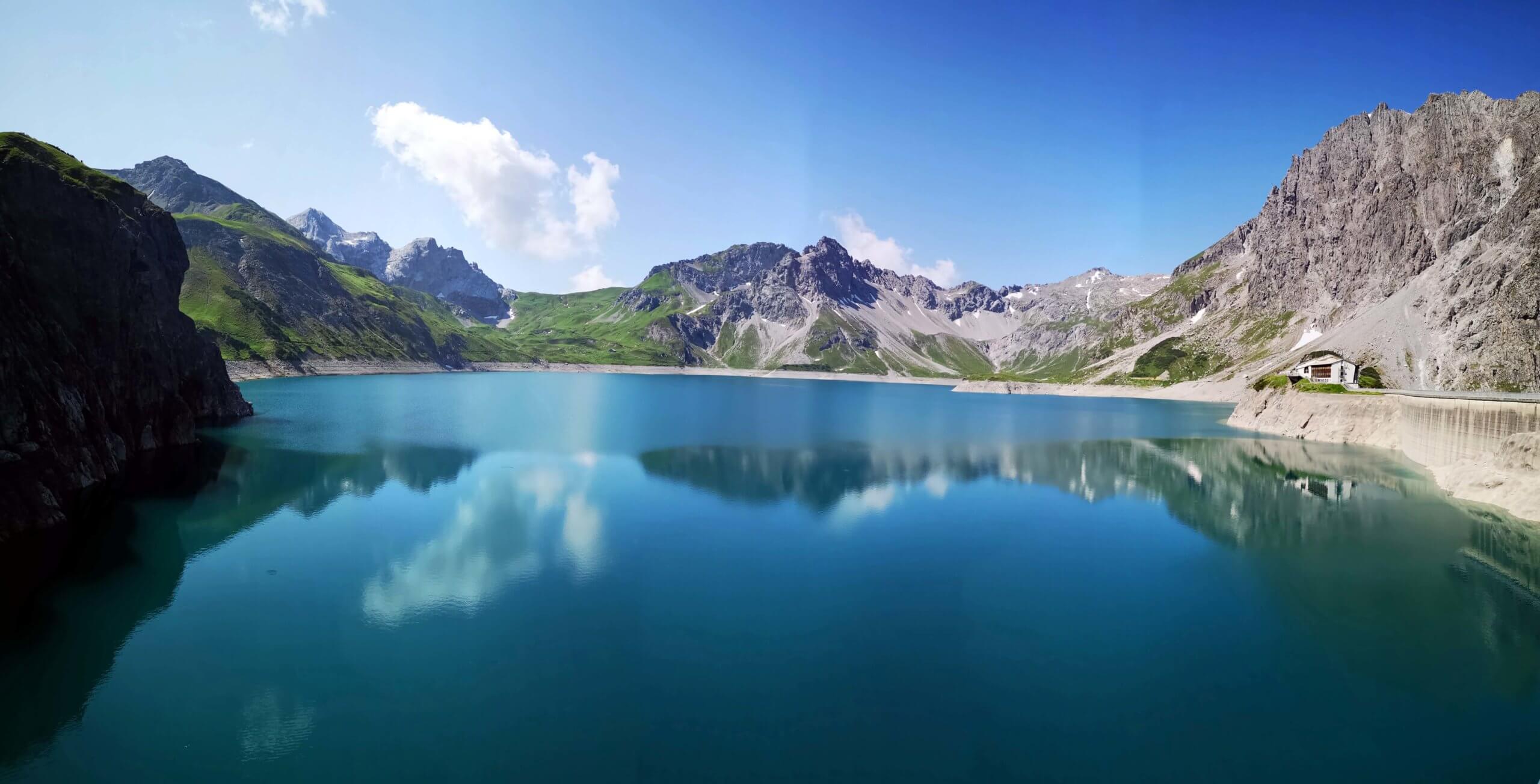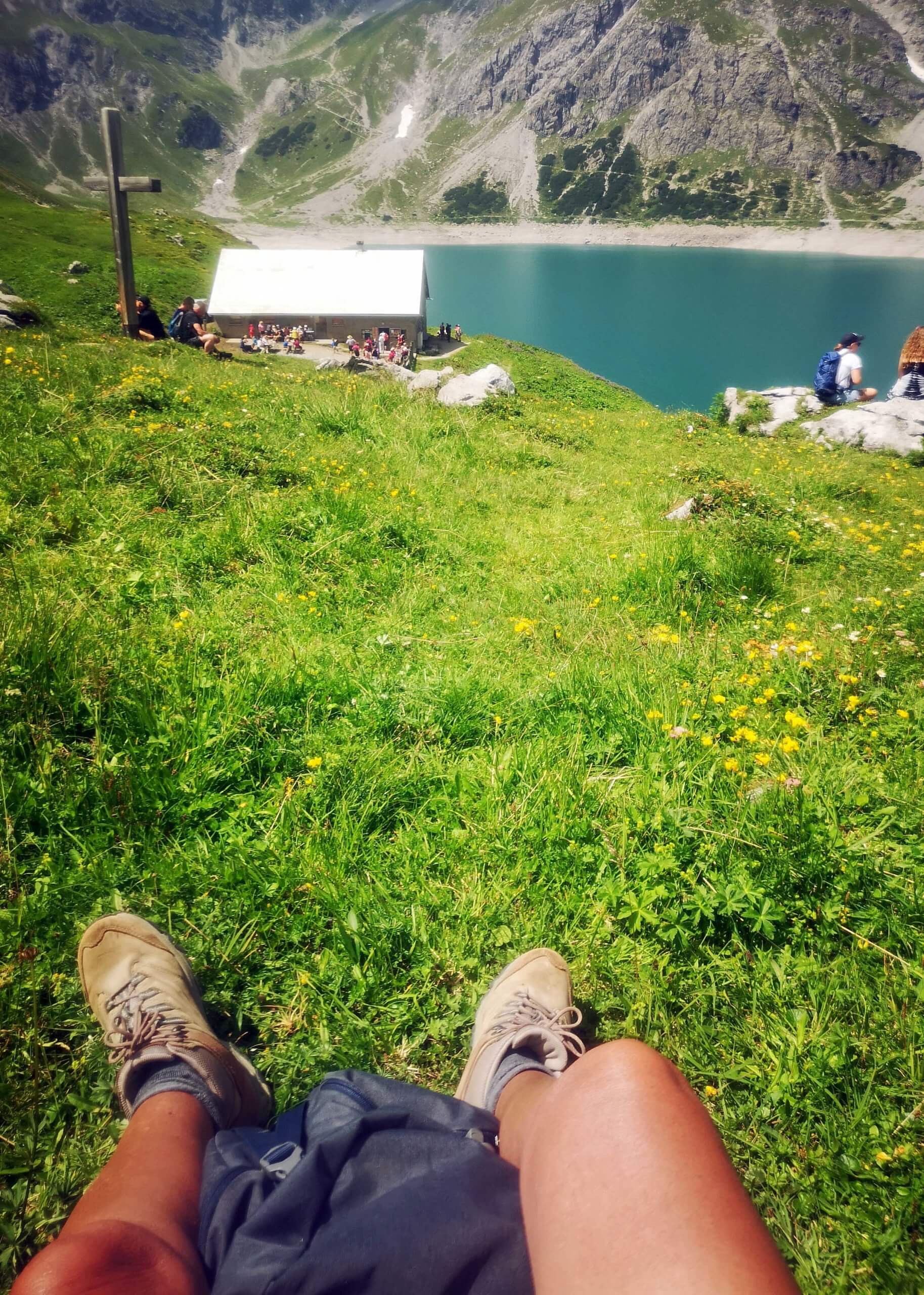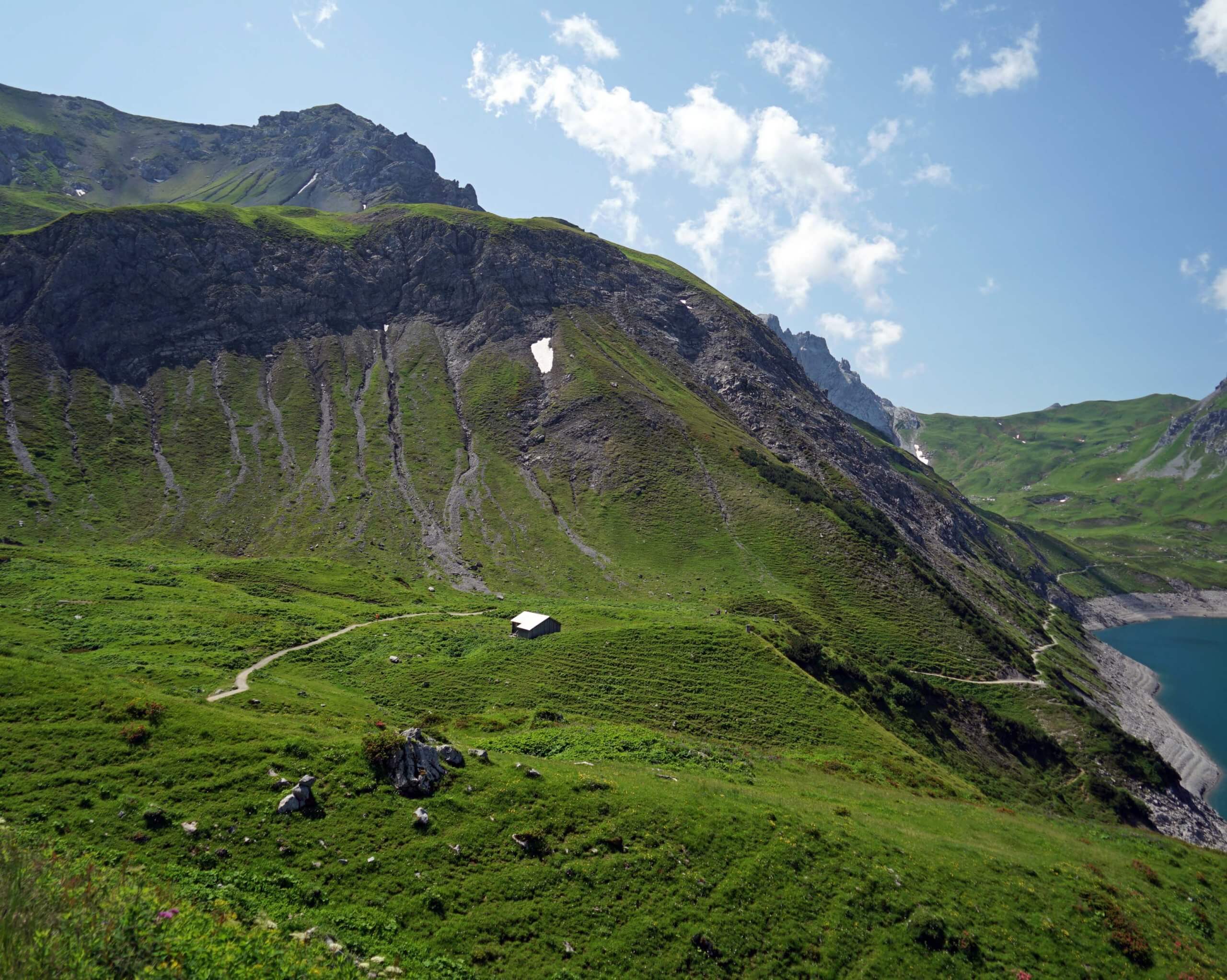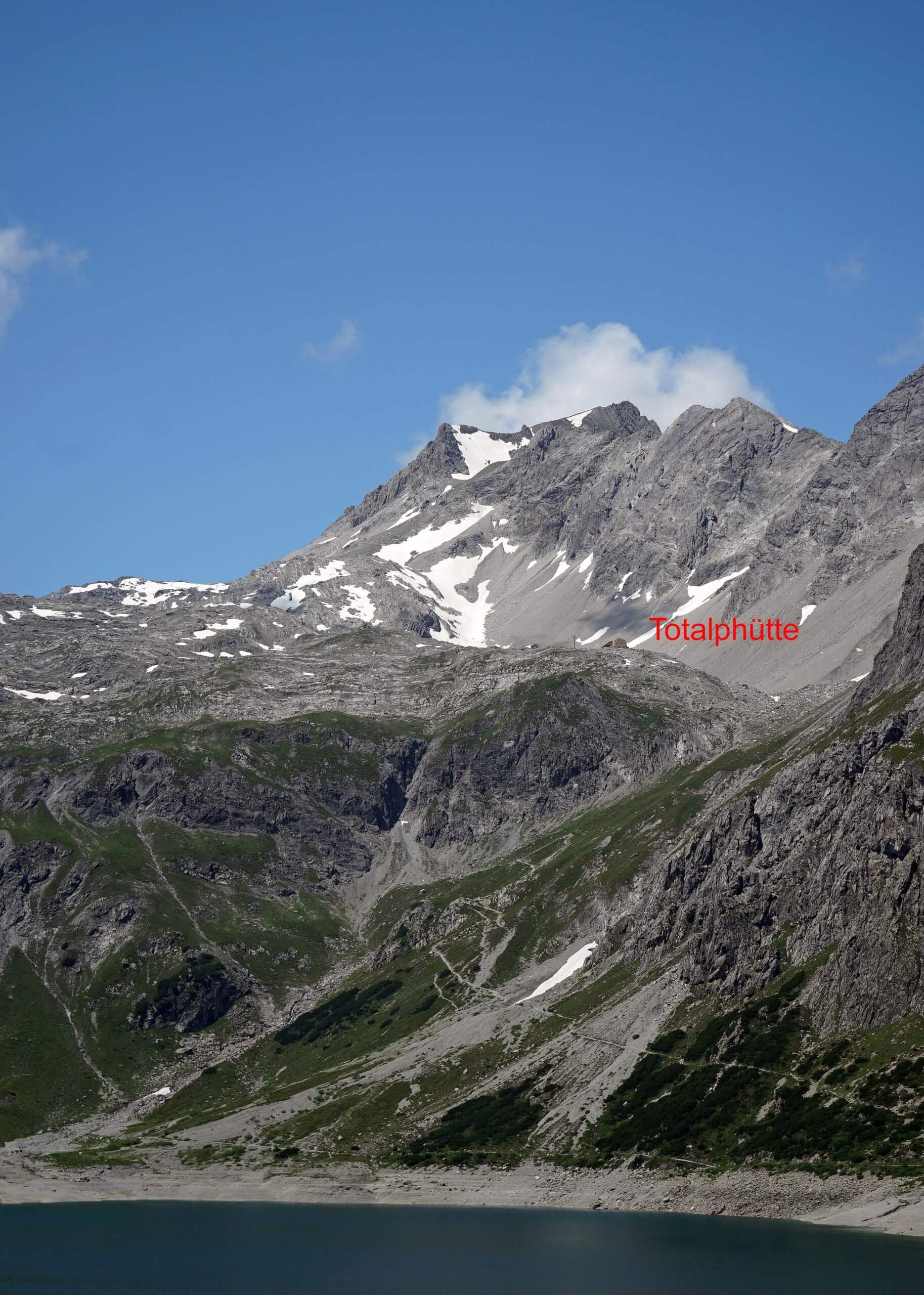 Einige hundert Schritte weiter entdecke ich am gegenüberliegenden Ufer die Schesaplana mit der Totalphütte. Wow – der Anblick ist grandios! Da bin ich tatsächlich gewesen! Und unweigerlich muss ich an den Auf- und Abstieg denken und die entscheidenden sechs Sekunden vor der Abfahrt der letzten Bergbahn ins Brandnertal. Kurze Zeit später erreiche die Alpe.