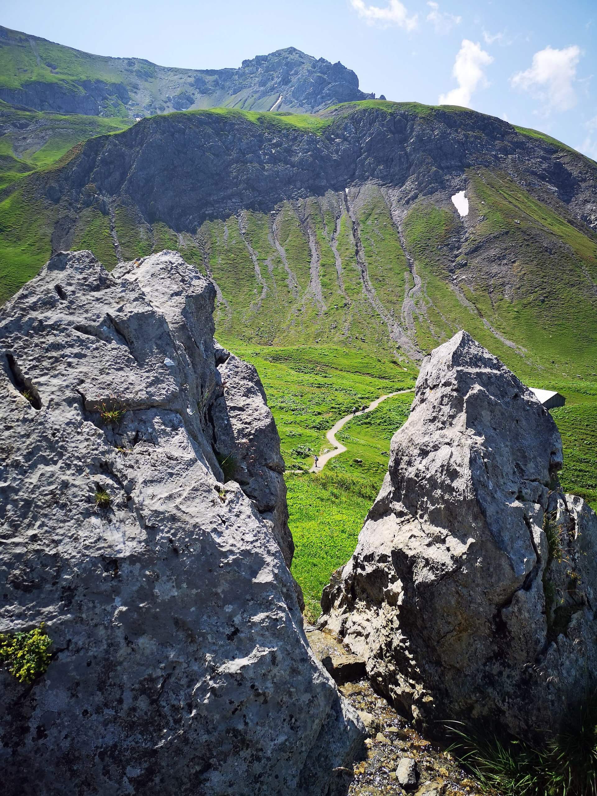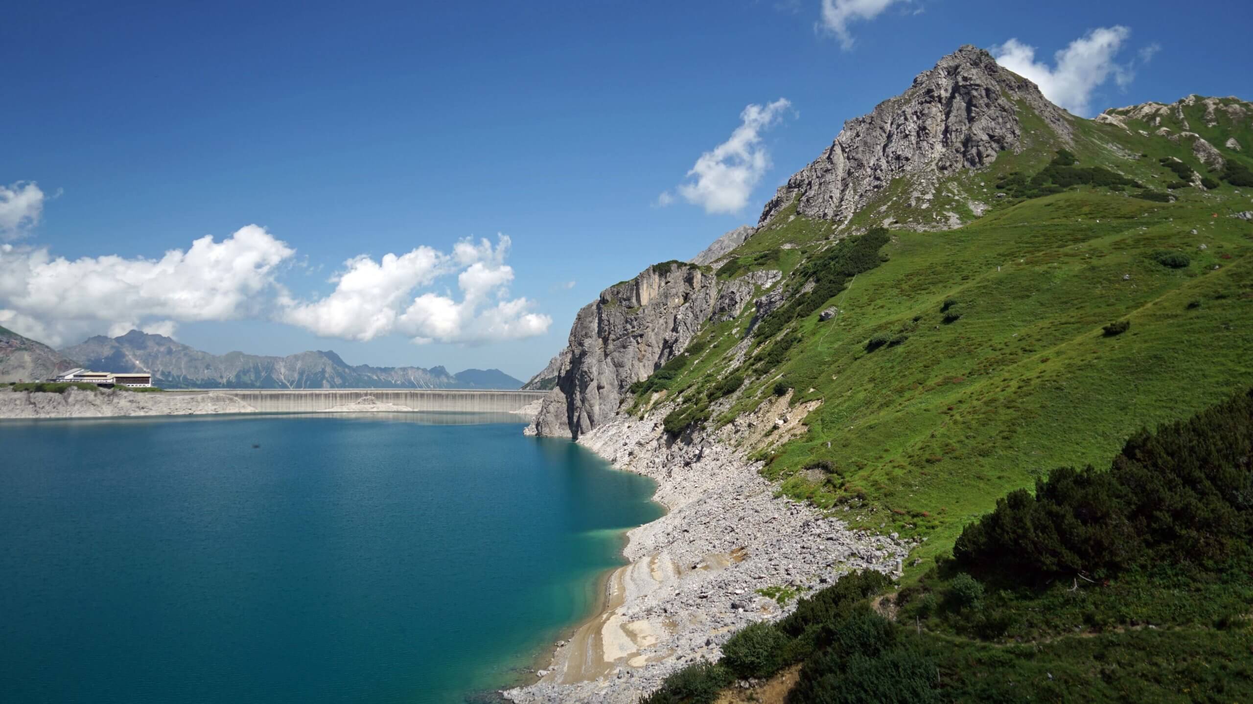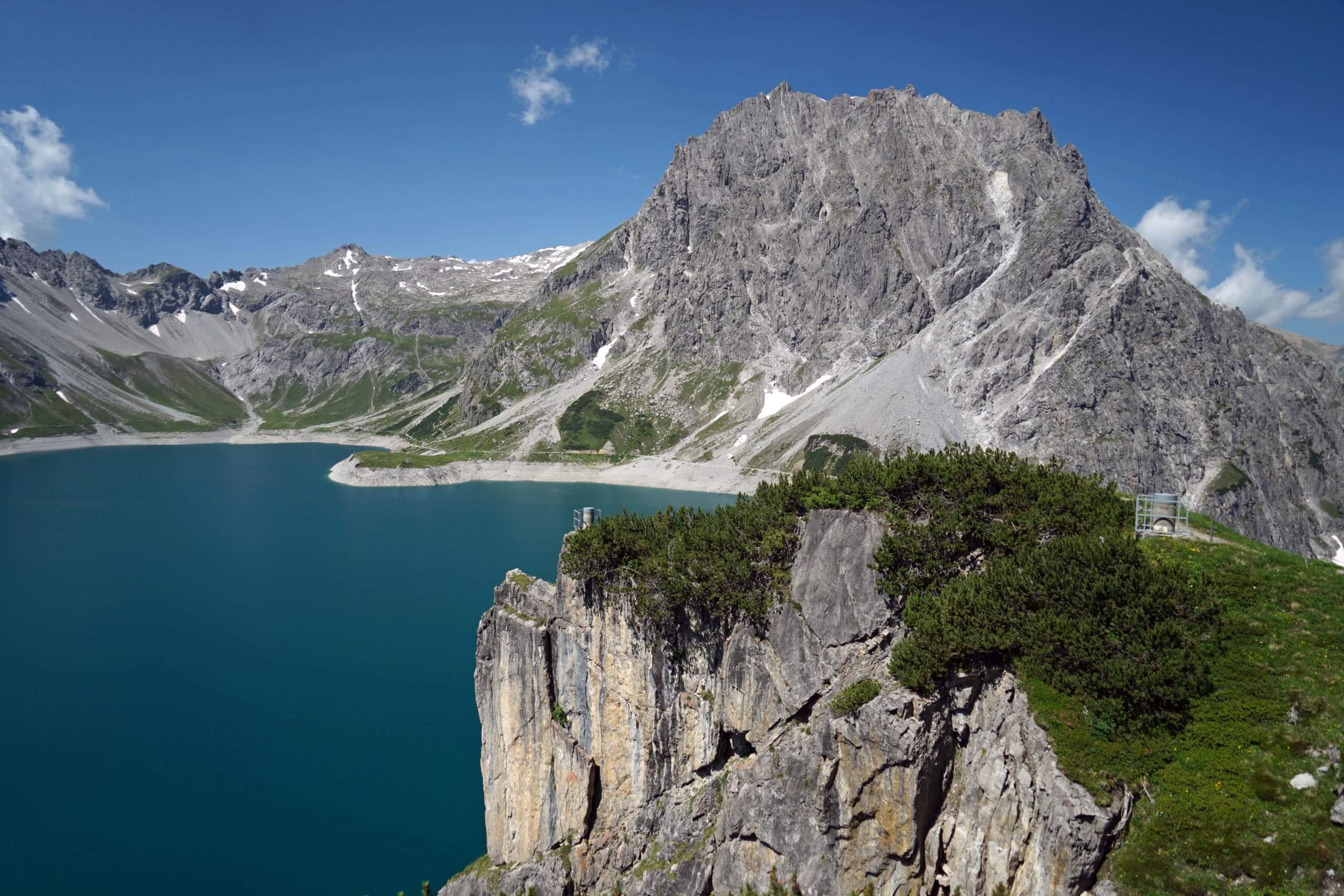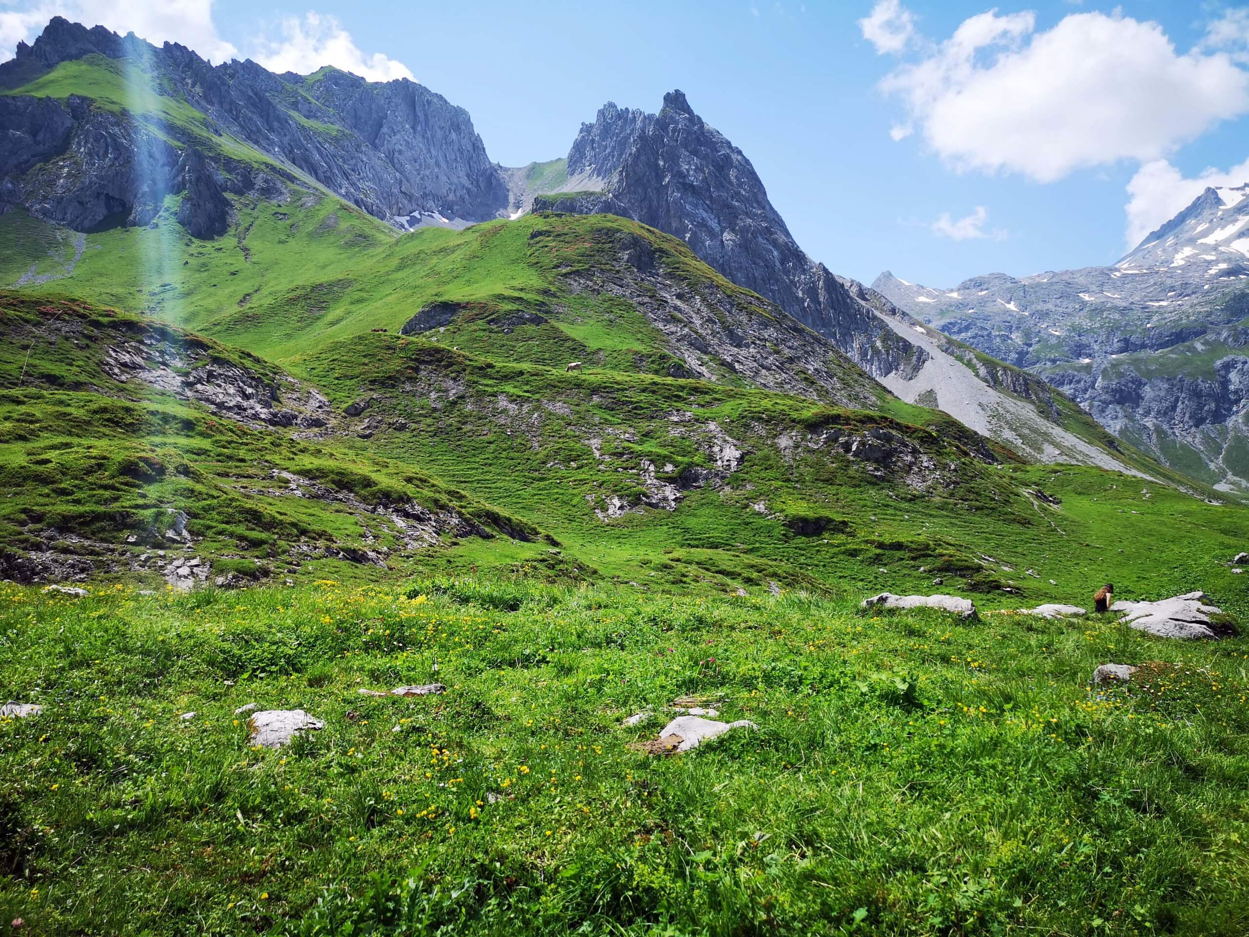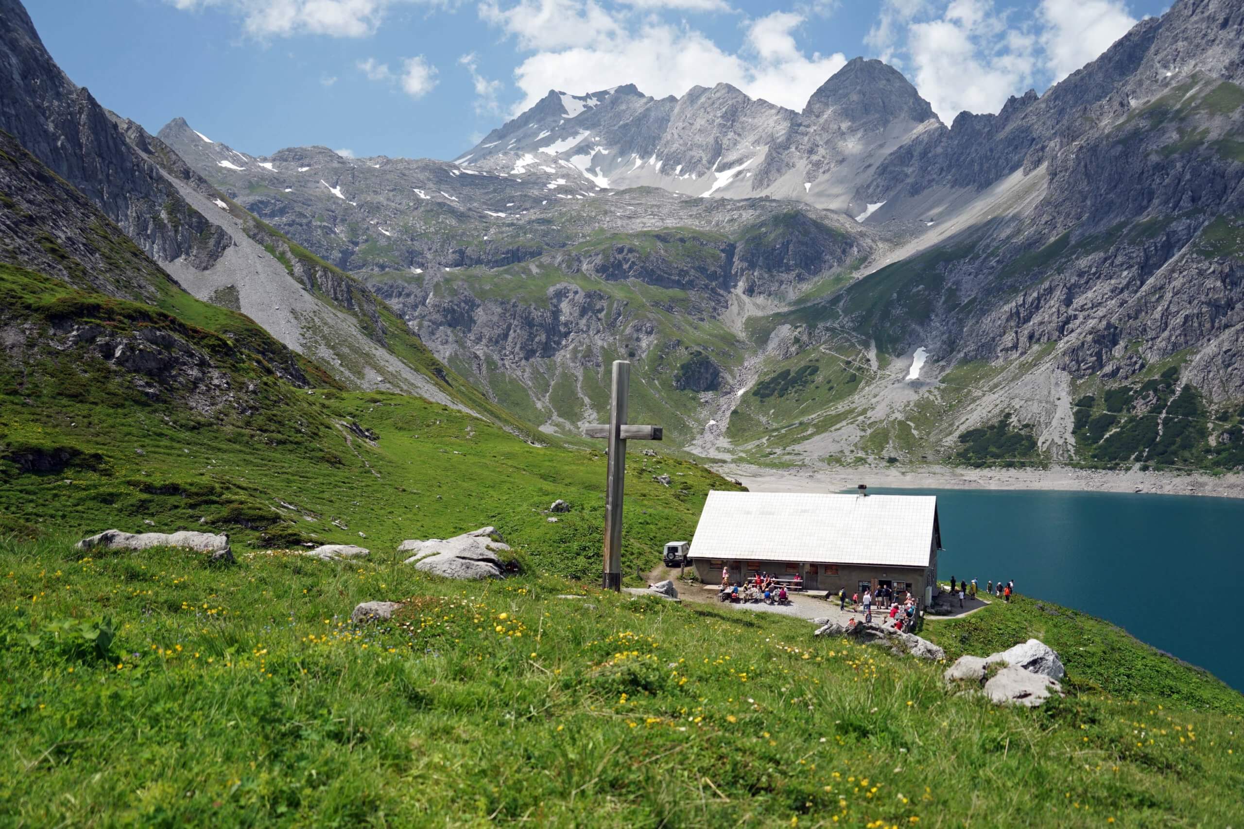 Einige hundert Schritte weiter entdecke ich am gegenüberliegenden Ufer die Schesaplana mit der Totalphütte. Wow – der Anblick ist grandios! Da bin ich tatsächlich gewesen! Und unweigerlich muss ich an den Auf- und Abstieg denken und die entscheidenden sechs Sekunden vor der Abfahrt der letzten Bergbahn ins Brandnertal. Kurze Zeit später erreiche die Alpe.