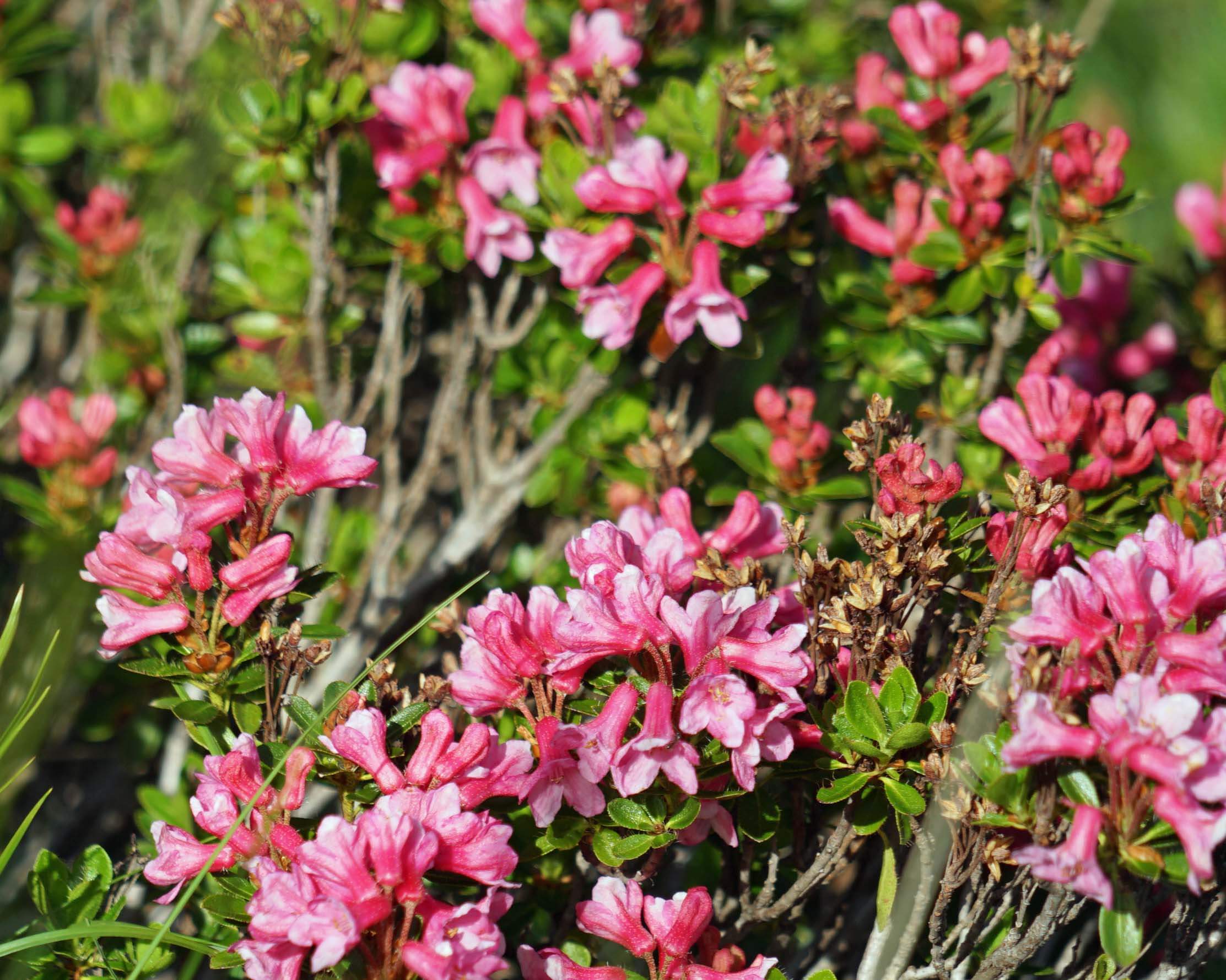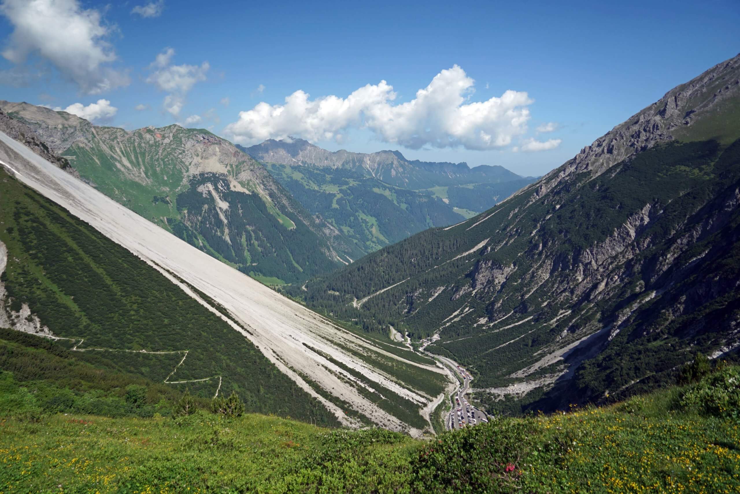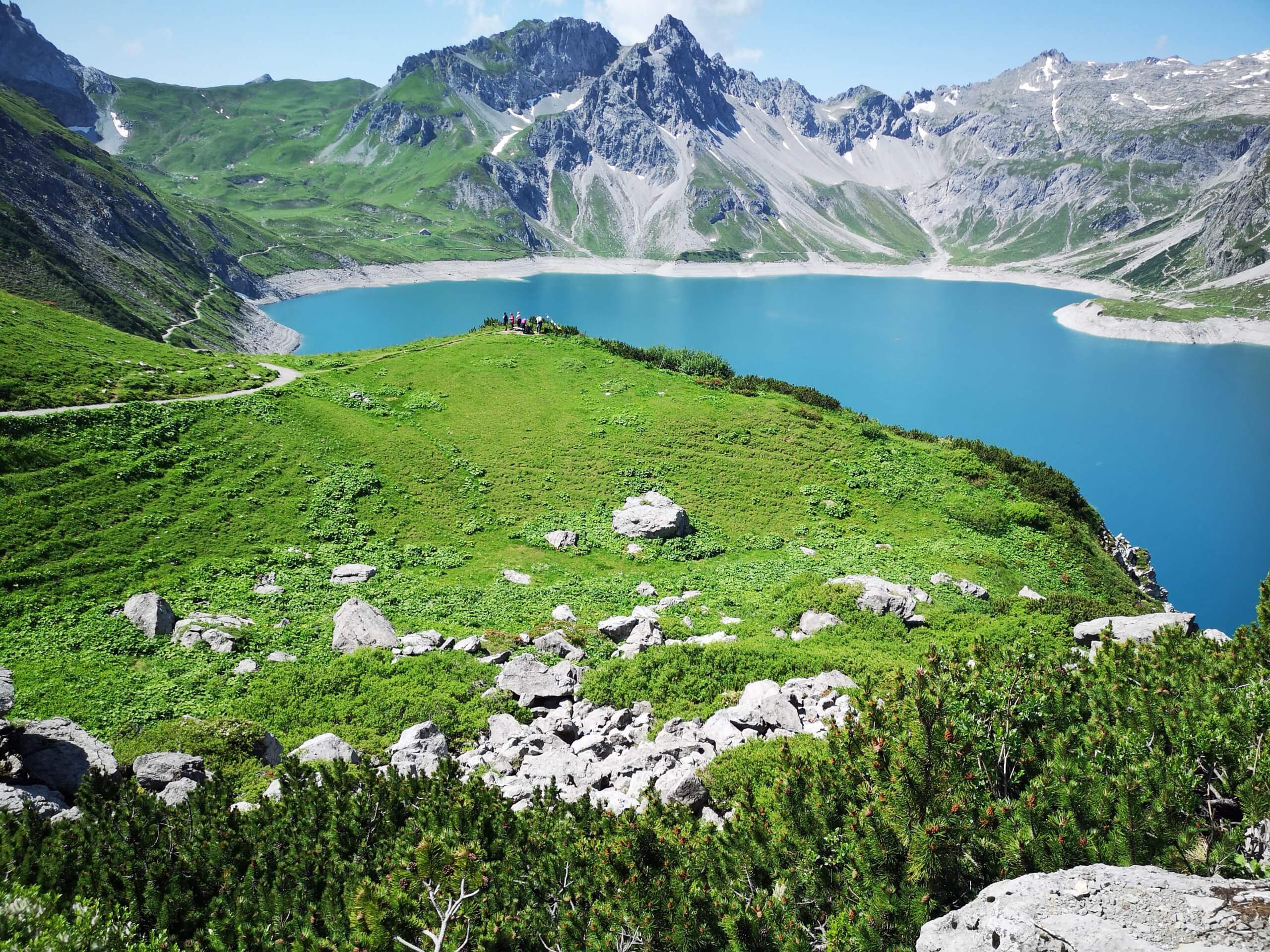 Ich wandere dieses Mal in die entgegengesetzte Richtung, d.h. zuerst über die mächtige Staumauer bis zum ‚Bösen Tritt‘, dem Aufstiegssteig von der Talstation der Lünerbahn. Es geht stetig – etwa 200 Höhenmeter – bergan bis zur Aussichtskanzel unterhalb des Saulakopfs (2517m), immer durch saftig grüne Wiesen und vorbei am Grau der zahlreichen Felsspitzen. Zu dieser Jahreszeit zeigen sich die Almwiesen mit einem unbeschreiblichen Blütenmeer, darunter die Alpenrose. Sie blüht von Mai bis Juli und gedeiht in 500 bis 2800 Metern Höhe. Damit sie nicht erfriert, braucht sie im Winter eine dicke Schneedecke.