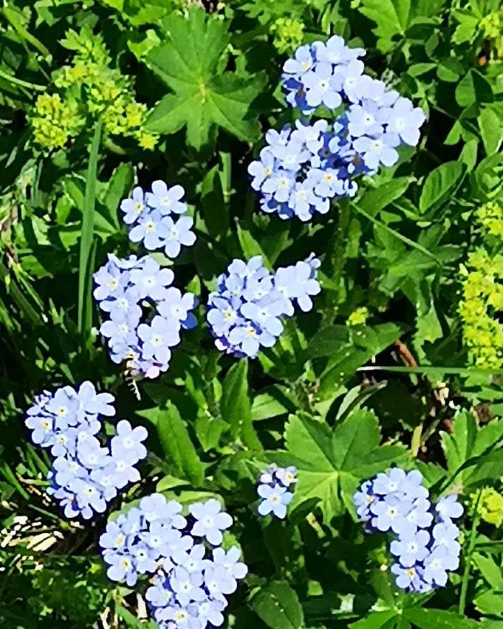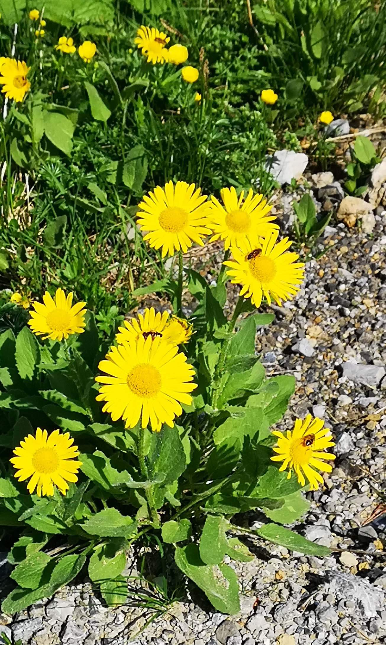 Es ist eine Genusswanderung und ich lasse mir sehr viel Zeit, um das Bergpanorama zu genießen, die intensiven Düfte und die würzige Bergluft einzuatmen. Ich empfinde eine tiefe Ruhe zwischen den majestätischen Gipfeln und nehme mit allen Sinnen wahr. Der Geruch der blühenden Bergwiesen ist intensiver als sonst, ich kann das gespeicherte Wasser riechen und fast jede Blüte erschnuppern. Überall plätschert es aus dem Boden oder fällt in kleinen Bächen von den Bergen herab.
