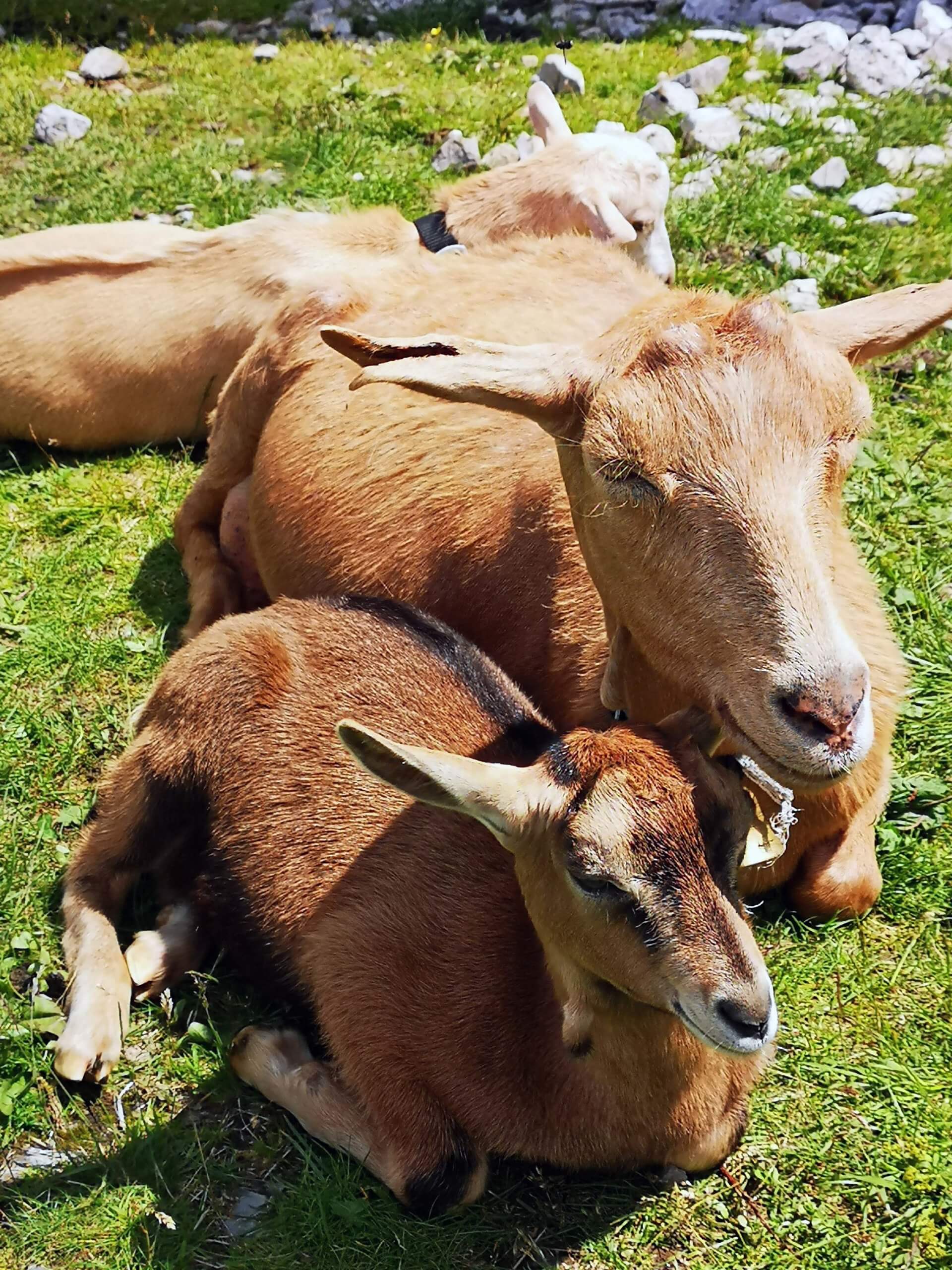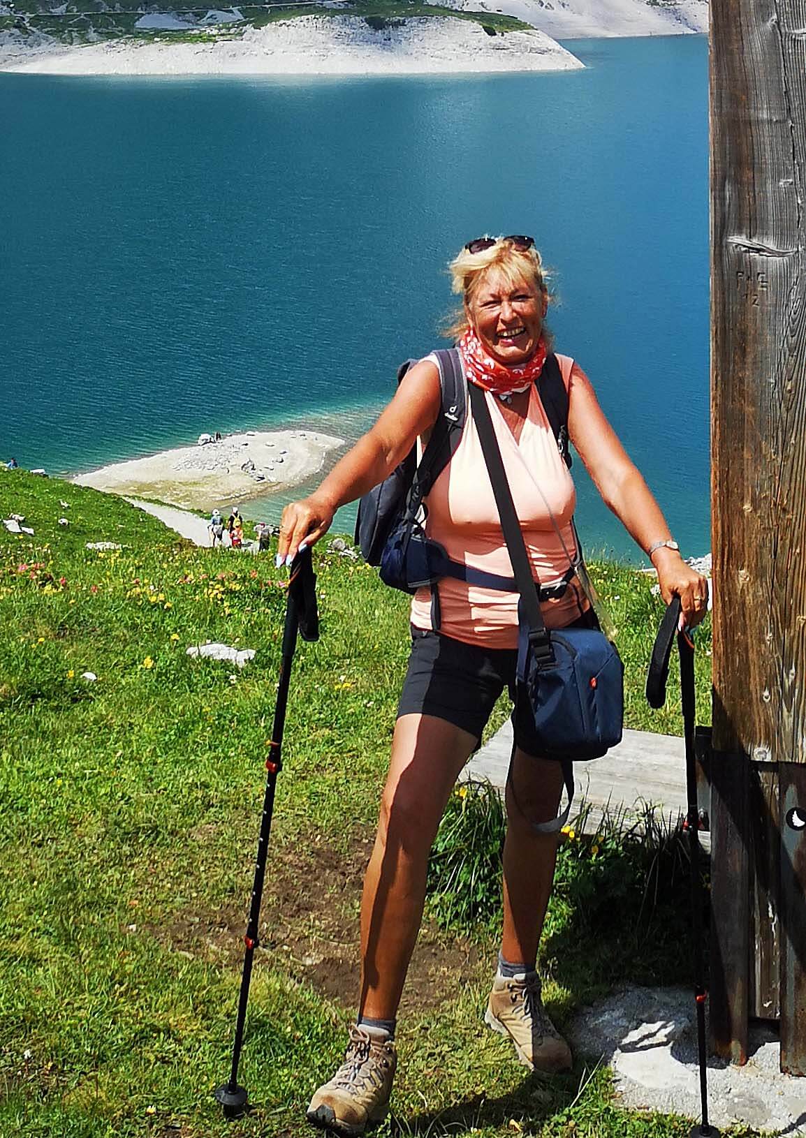 Hier tobt der Bär. Ich bestelle eine Hauswurst und eine große Buttermilch. Alles sehr lecker. Ich komme ins Gespräch mit meiner linkenTischnachbarin, von der ich wertvolle Wandertipps erhalte. Meine rechte Nachbarin möchte nur etwas Gutes zu fressen und landet dabei beinahe auf meinem Schoß. In einiger Entfernung fiepsen Murmeltiere. Die hauseigenen Alp-Ziegen warten auf Streicheleinheiten und danach klettere ich noch zum Alpe-Kreuz hinauf und wandere weiter entlang des Sees mit Blick auf die Kanzelköpfe, 2437 Meter hoch. Gemütlich geht es auf dem Wanderweg Richtung Douglashütte weiter, immer mit Blick auf den Seekopf, 2698 Meter hoch.