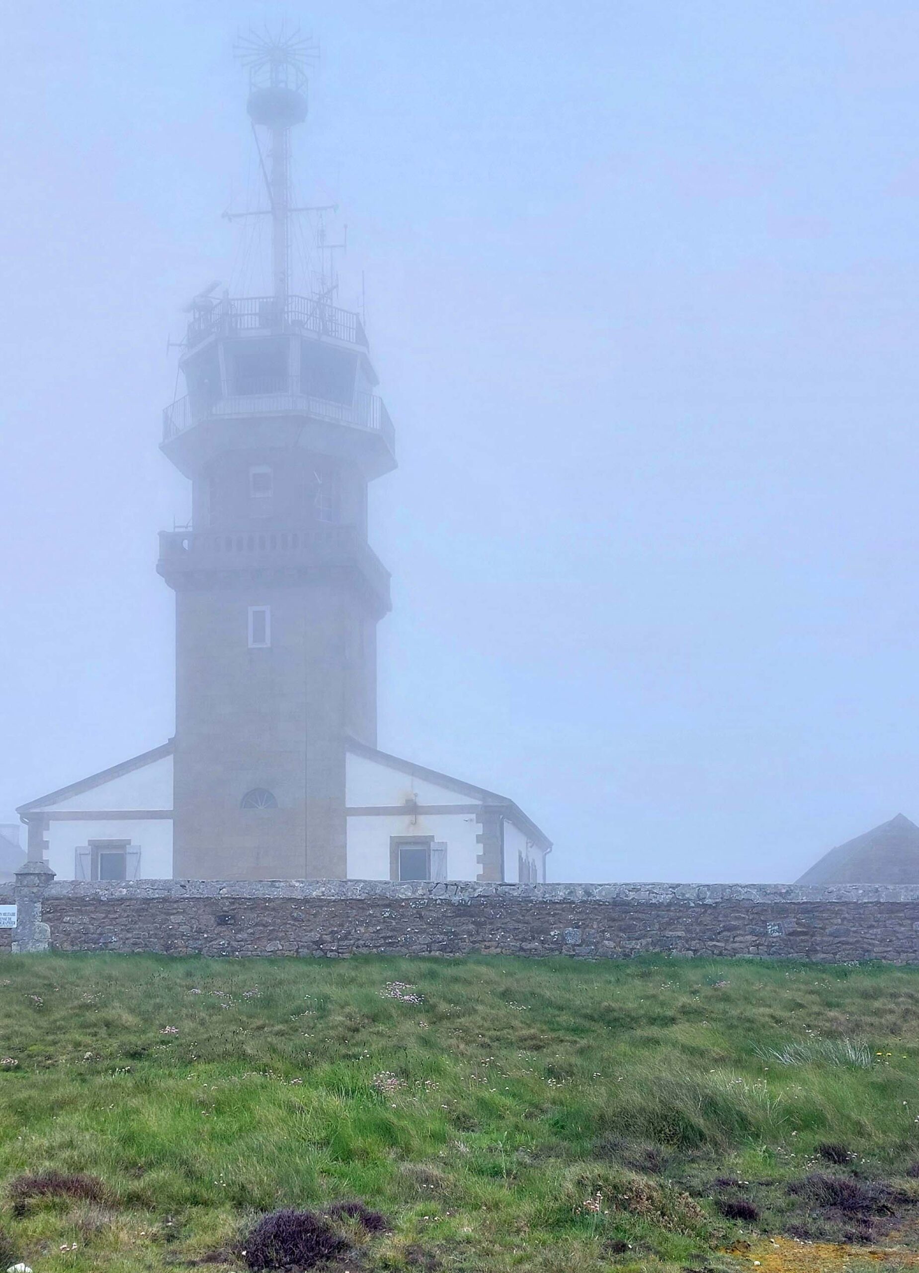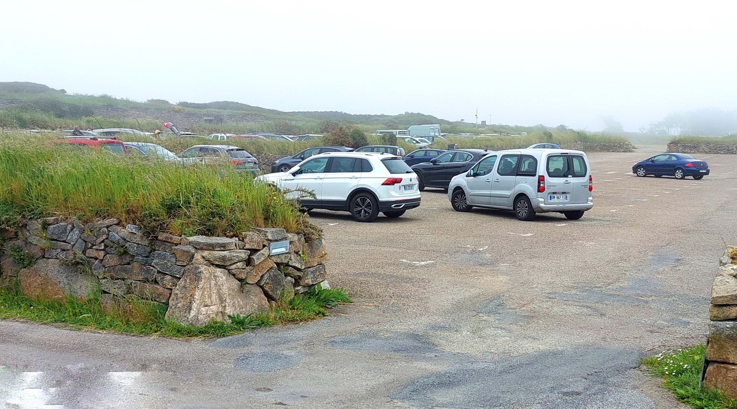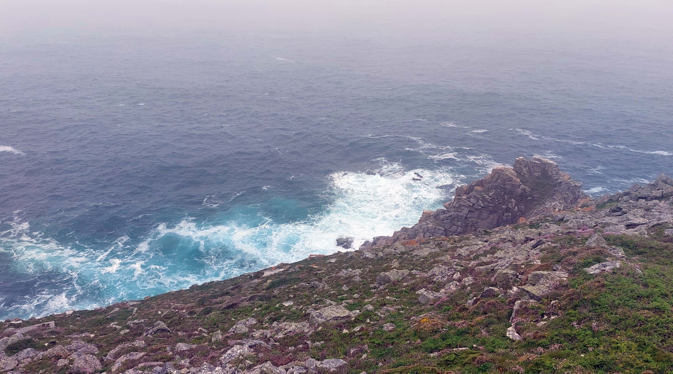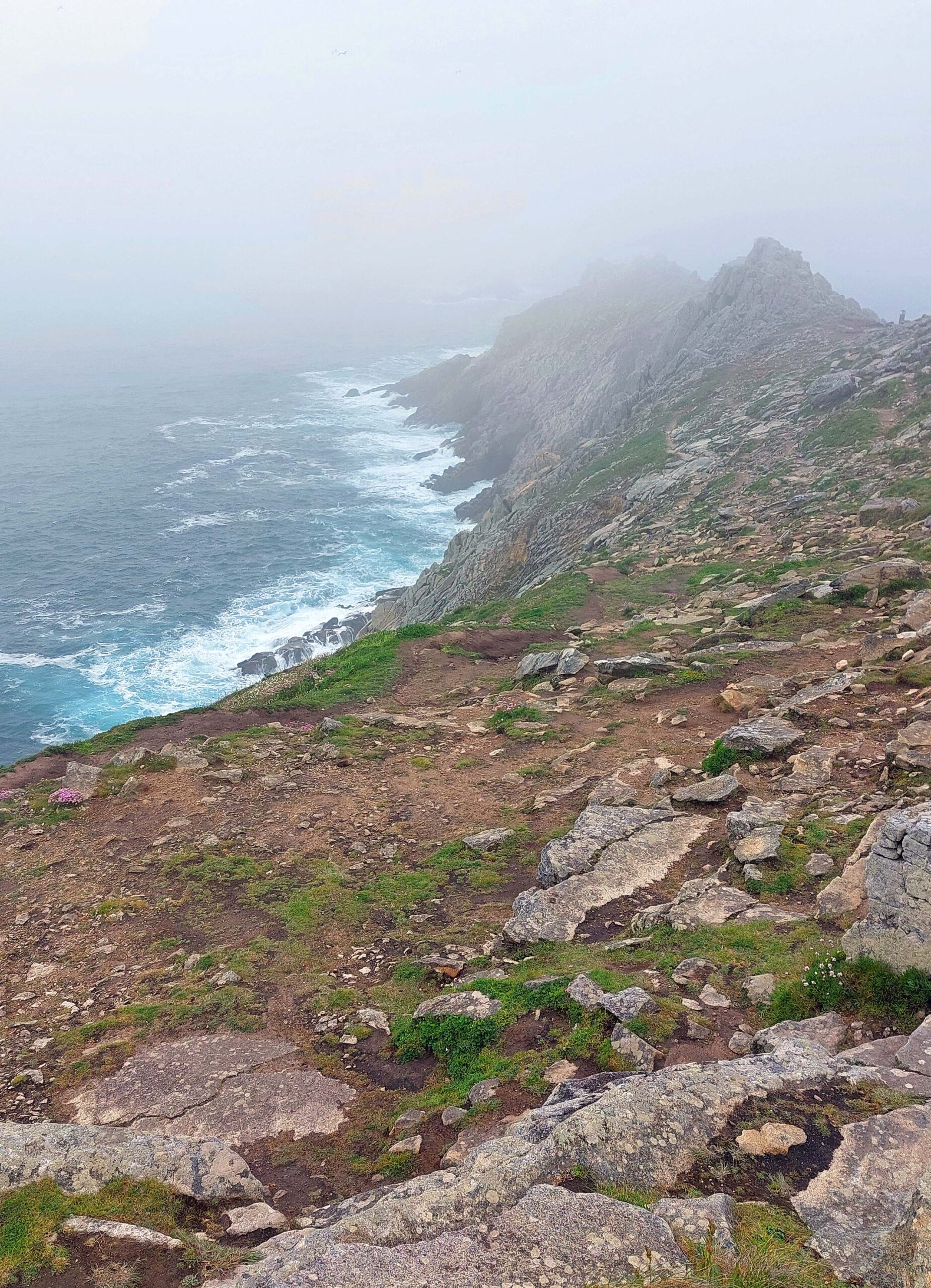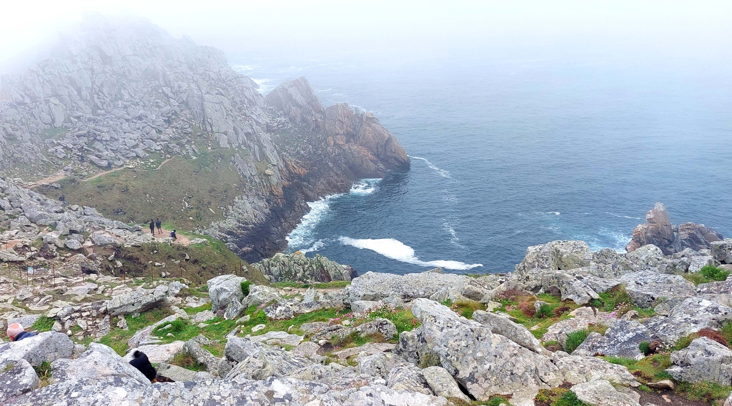 Ich stelle Fiete für knackige 8 Euronen auf einem riesigen Parkplatz ab, laufe zur Spitze und komme zunächst an einem keltischen Kreuz ✝️vorbei. Am Ende des Weges wird es steinig und holprig. Überall sind Seile zur Absicherung vor dem freien Fall angebracht. Und – oh Wunder – ich bin tatsächlich nicht alleine hier auf Tour. Es gibt noch weitere enttäuschte Touris 😞😞😞. Stapfe vorsichtig im Nebel umher und suche das spektakuläre Panorama und die zerklüfteten 72 Meter ins Meer fallenden Klippen. Das Wetter will nicht besser werden. So Schade! Also Augen 🤪auf und durch. Alles andere könnte gefährlich 😱werden.