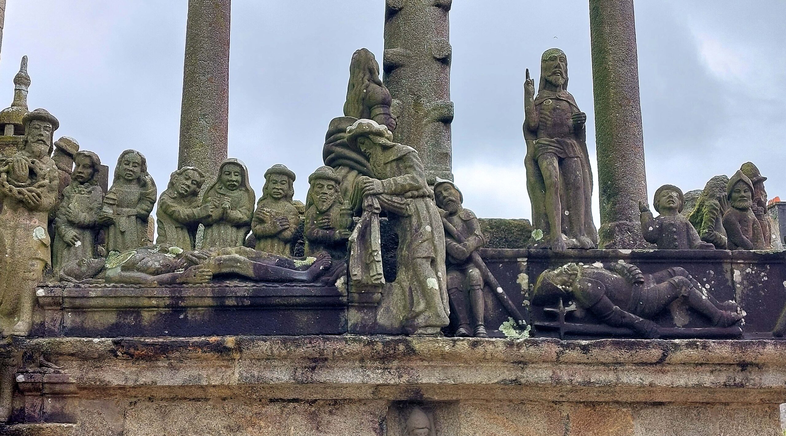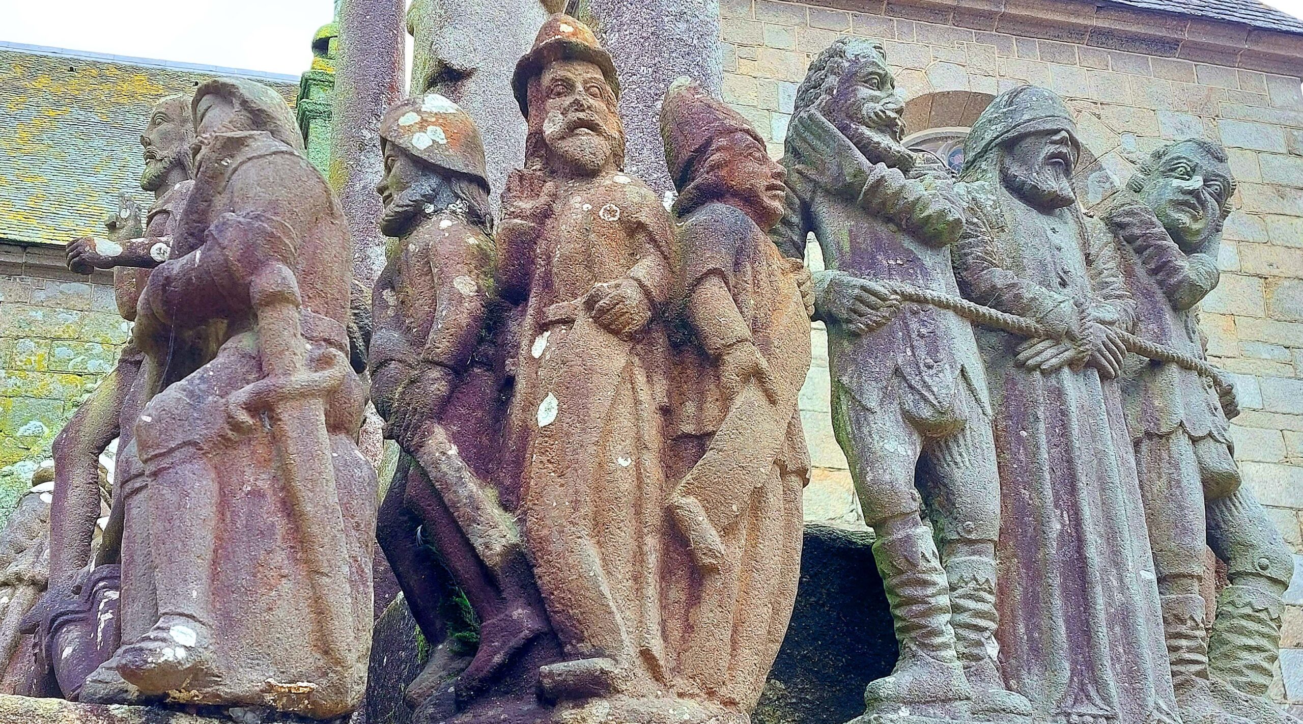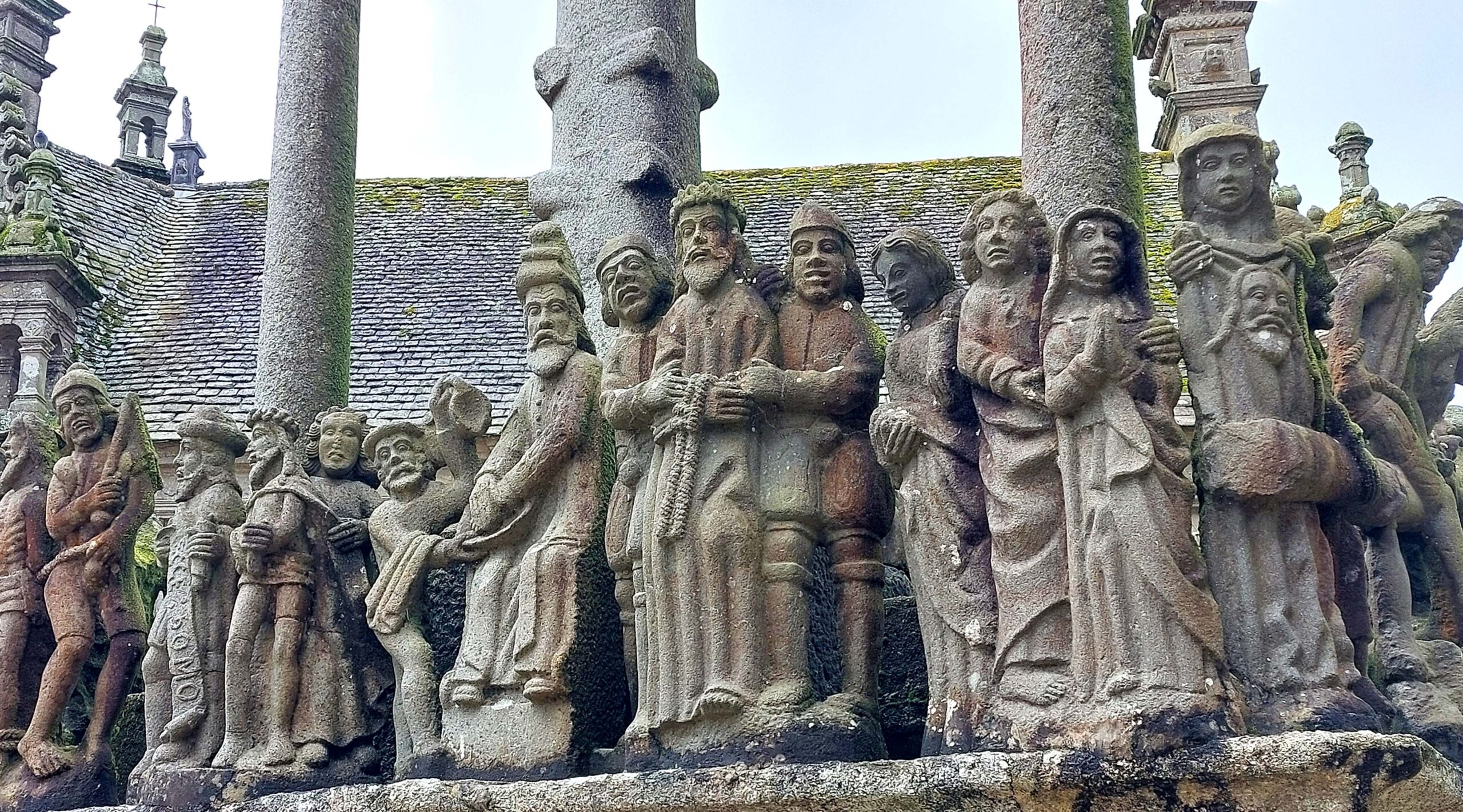 Der Kalvarienberg in Guimiliau zeichnet sich durch seinen mit über 200 ausdrucksvollen Figuren aus. Am Kirchenportal werde ich von zahlreichen Aposteln empfangen. Mit seinen üppigen Inszenierungen gilt er als einer der Spektakulärsten der Bretagne. Jaaa, könnte man meinen.
