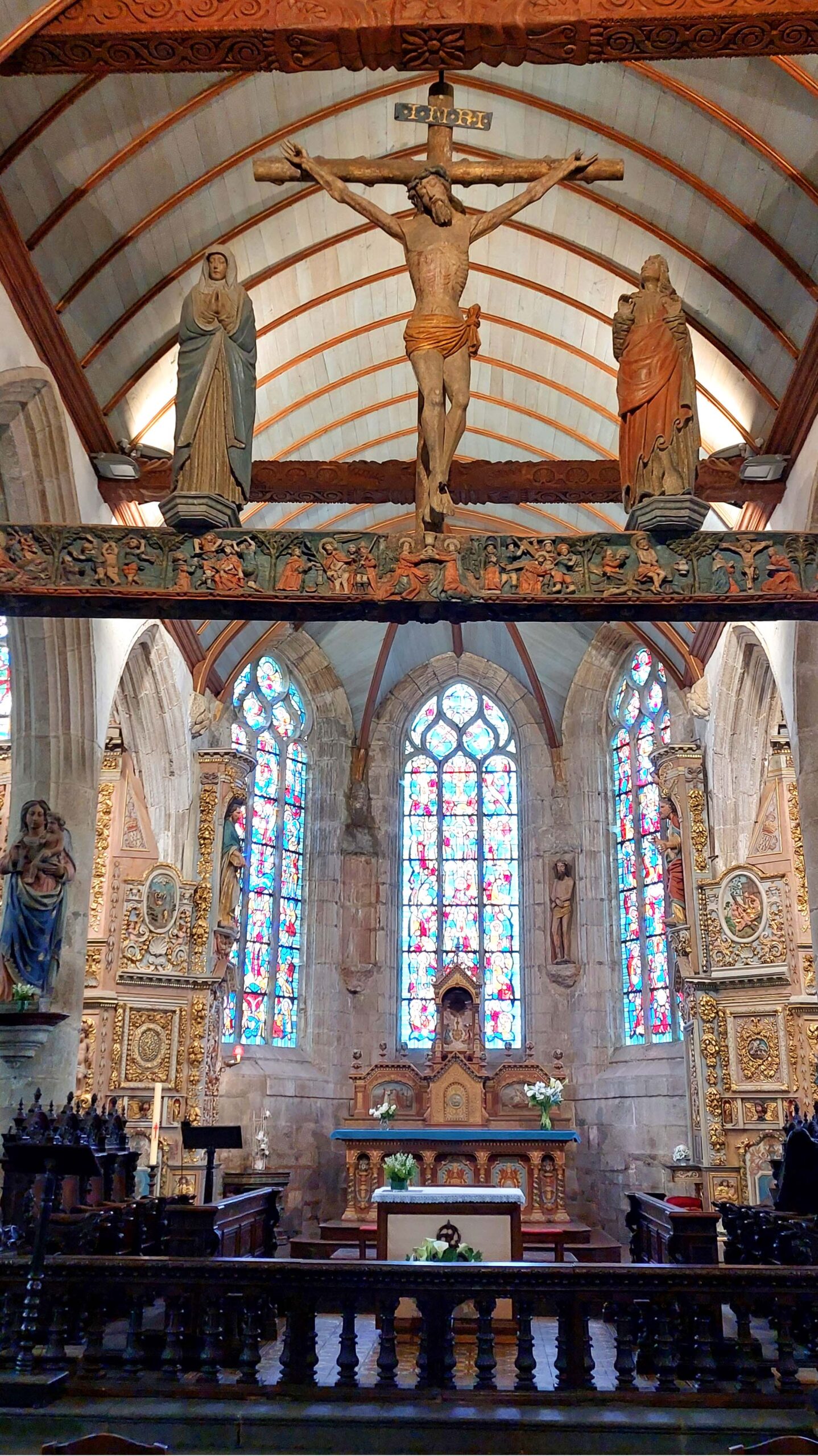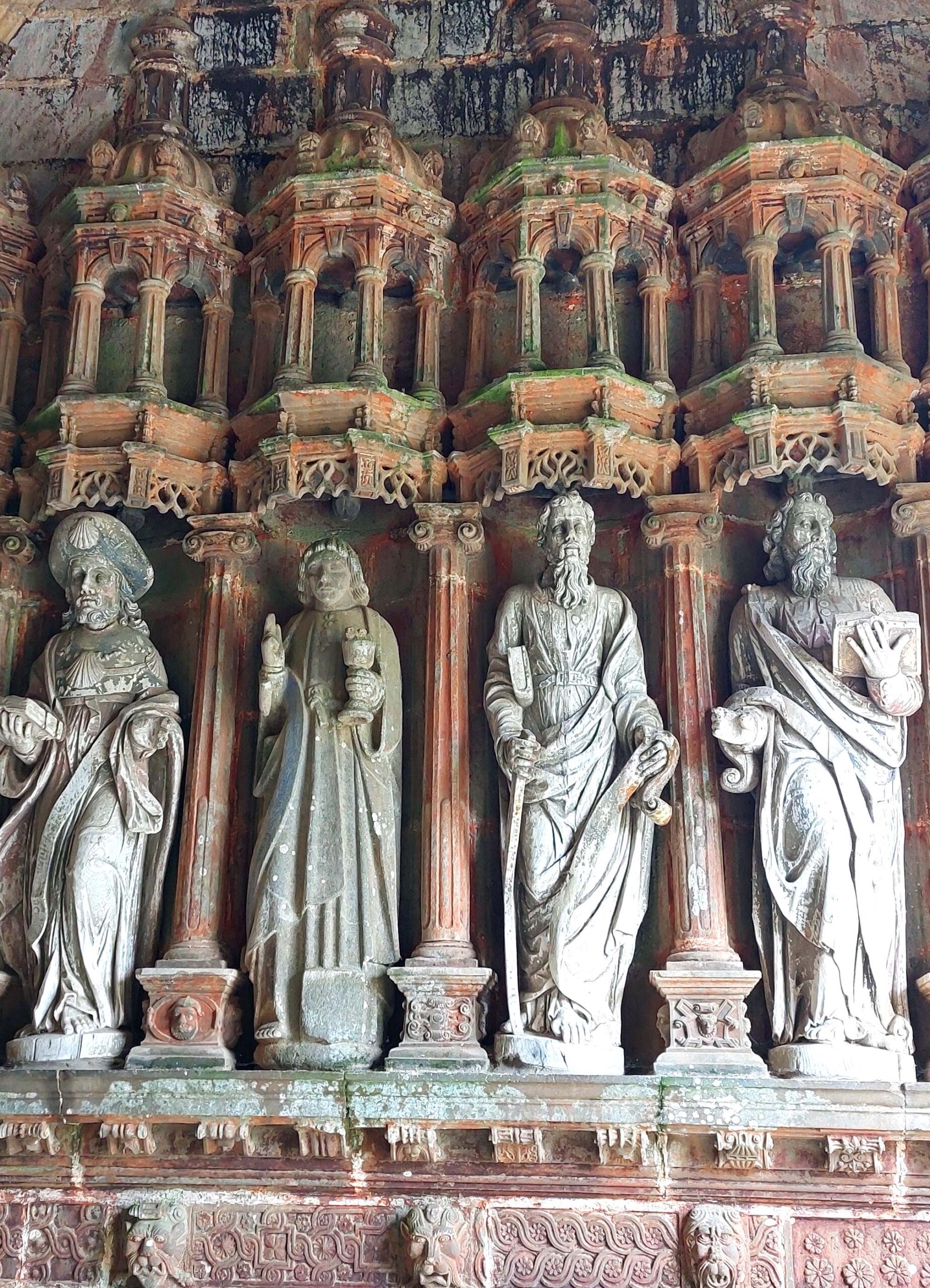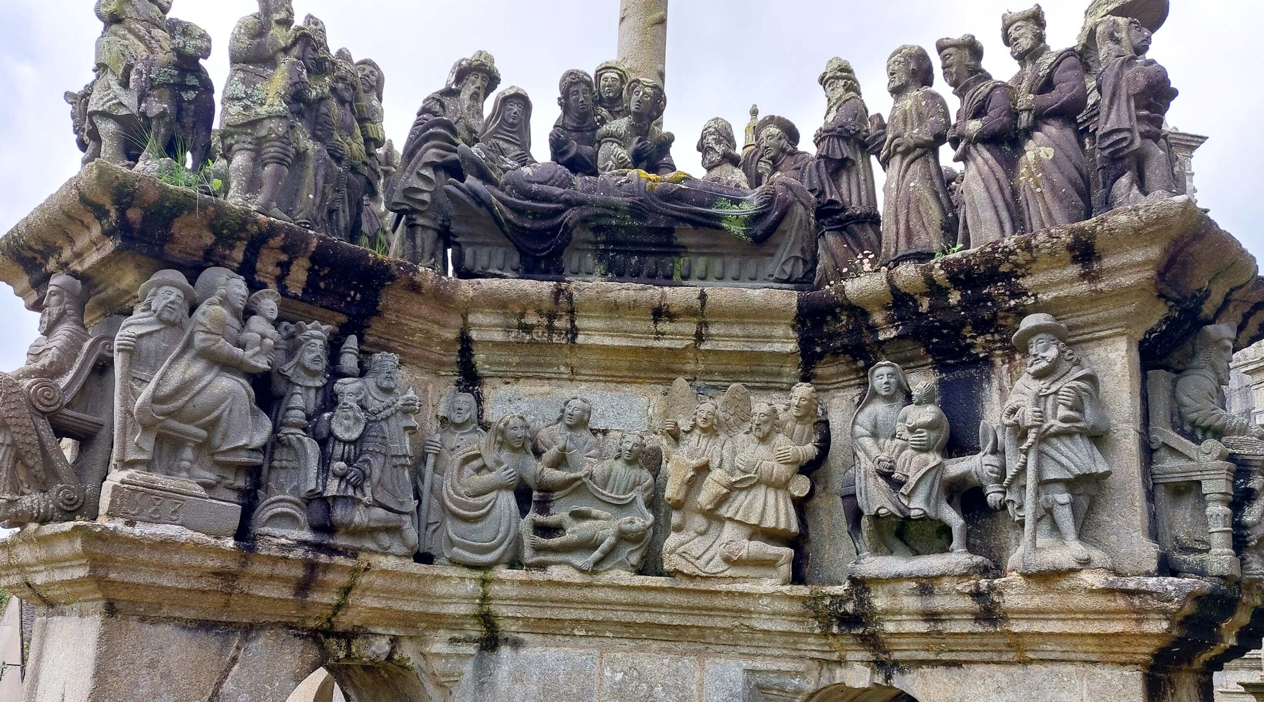 Der Kalvarienberg in Guimiliau zeichnet sich durch seinen mit über 200 ausdrucksvollen Figuren aus. Am Kirchenportal werde ich von zahlreichen Aposteln empfangen. Mit seinen üppigen Inszenierungen gilt er als einer der Spektakulärsten der Bretagne. Jaaa, könnte man meinen.