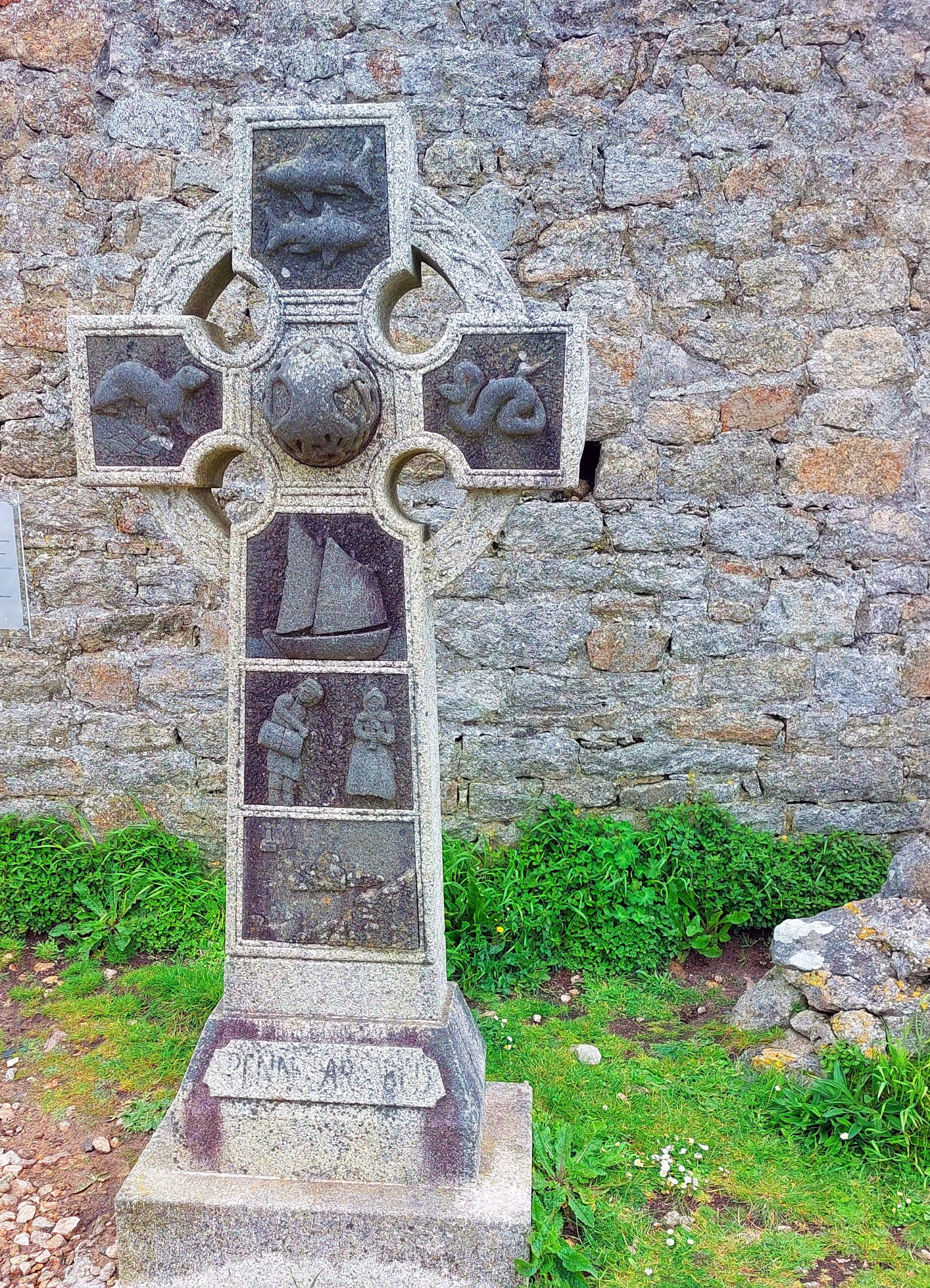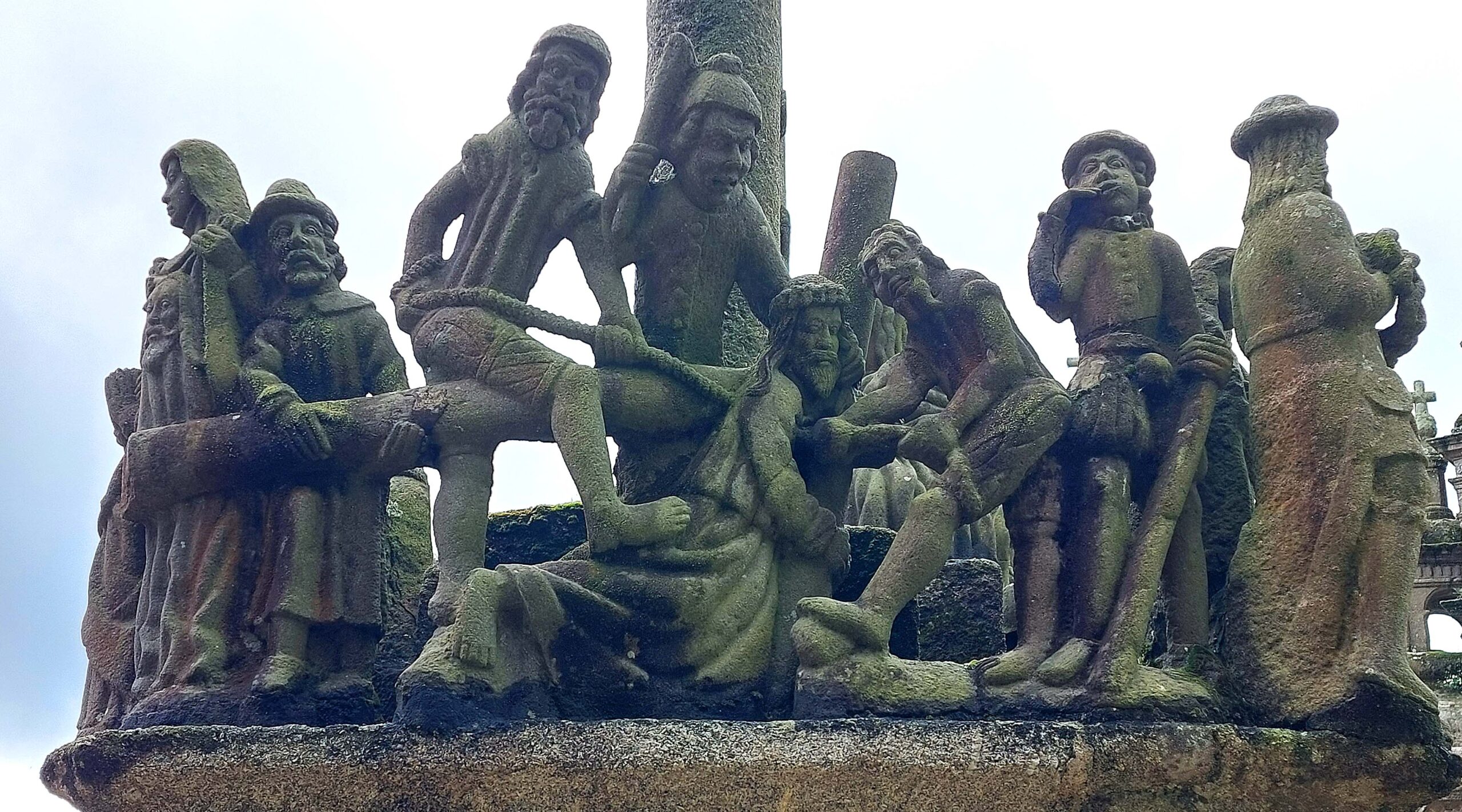 Zuerst besichtige ich den Kalvarienberg in Saint-Thégonnec. Er zeigt ein Übermaß an Ornamenten. Hier gibt es drei Kreuze statt einem, ein weiteres Glockentürmchen neben der Kirche, eine kunstvoll geschnitzte Kanzel und vieles mehr. Aus kunsthistorischer Sicht ist er einer der Schönsten und Bedeutendsten. Die Personen werden hier in der aktuellen Kleidung der damaligen Epoche dargestellt. Ich stöbere lange herum und achte auf die Details.