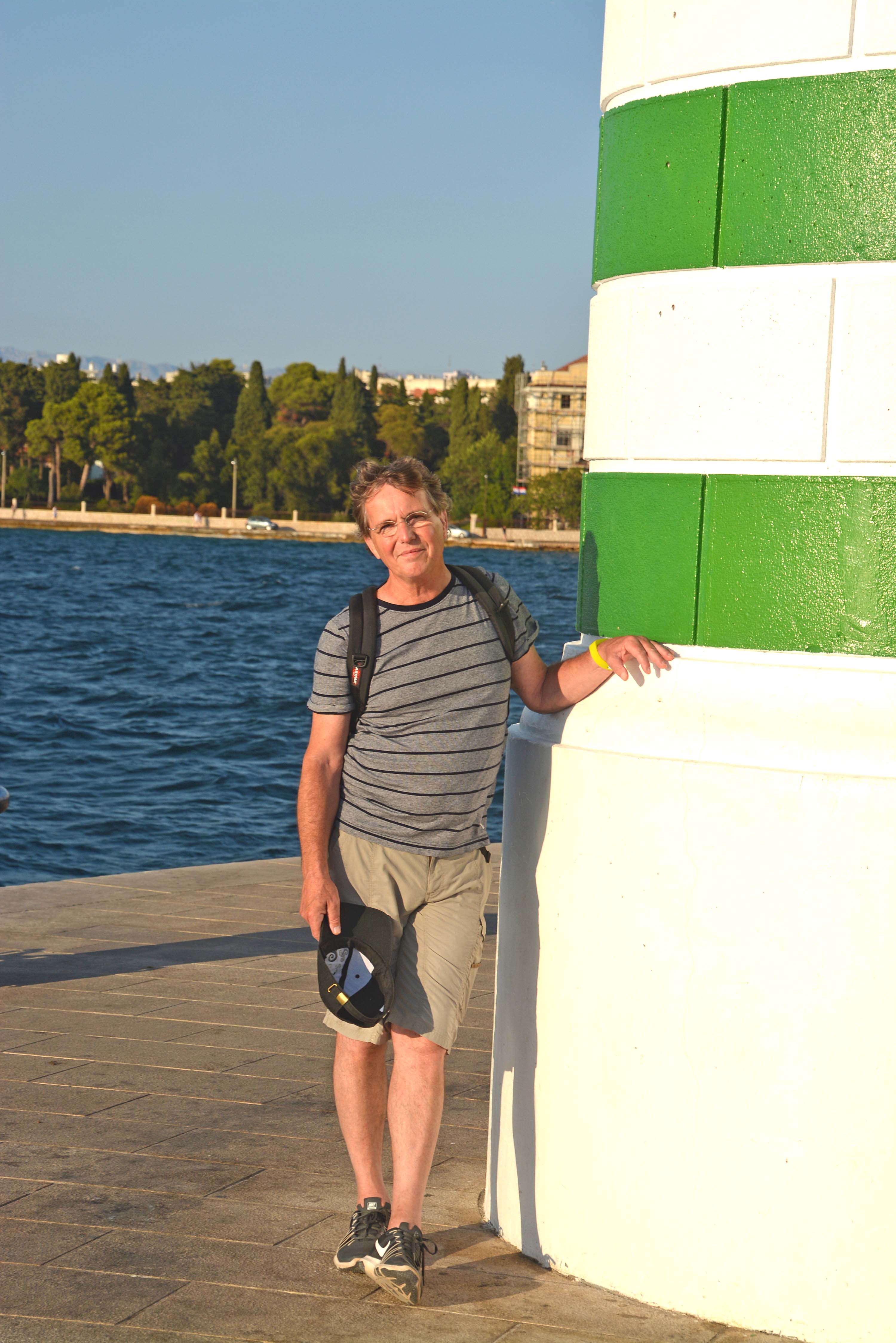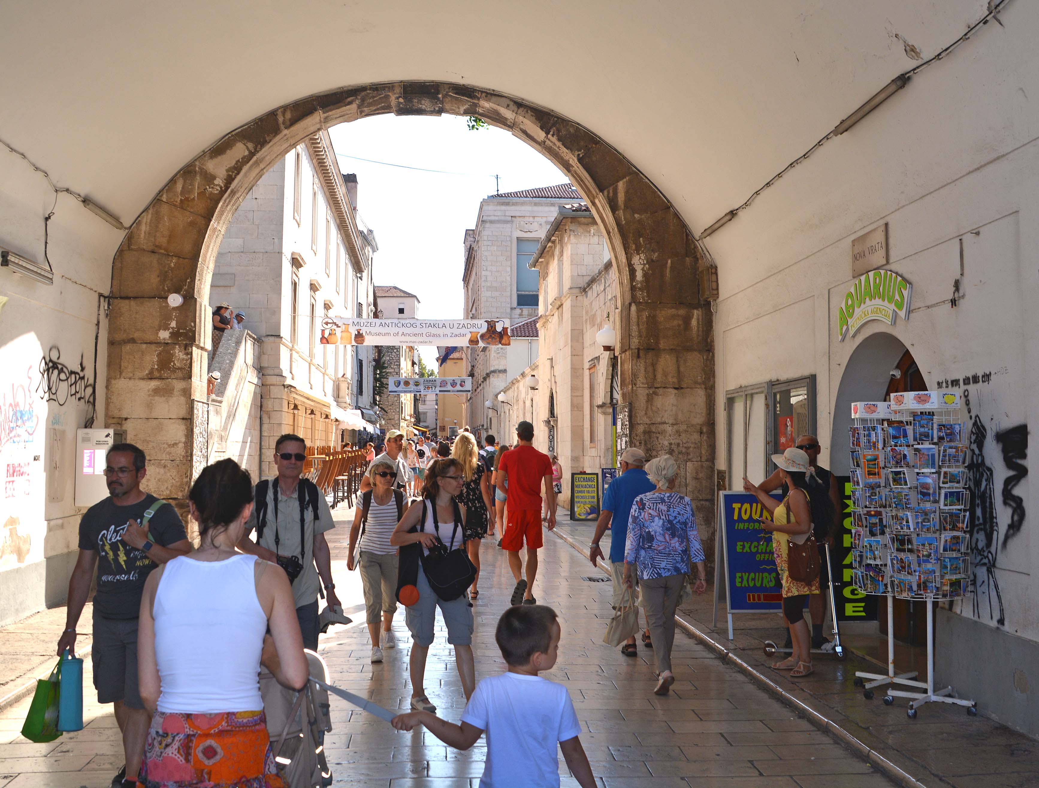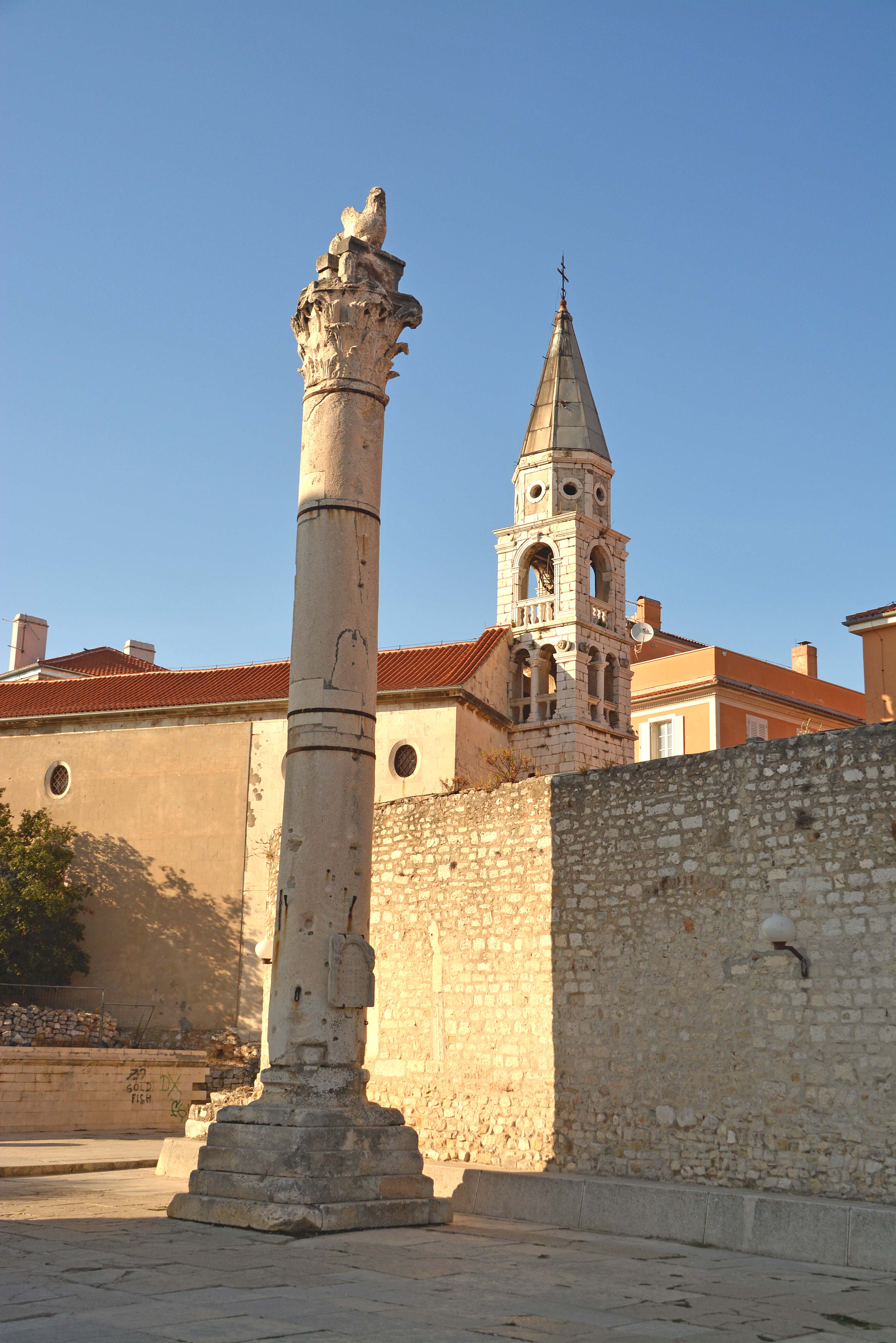 Wir lassen uns durch die engen Gassen mit den glänzenden Travertinsteinen treiben und stoßen auf den Uhrenturm, die Stadtwache und das Rathaus am Volksplatz Narodni Trg. Wir entdecken das Römische Forum von Kaiser Augustus, auf dem sich das Wahrzeichen der Stadt, die St. Donatiuskirche, ein runder vorromanischer Bau aus dem 9. Jahrhundert befindet und besteigen den Glockenturm. Wir haben einen fantastischen Rundblick über Zadar, das Meer und die Berge. Danach streifen wir durch die römischen Überreste des Forums bis zur 14 Meter hohen ‚Schandpfahl‘-Säule. Auf dem Weg zur Wasserorgel kommen wir an der frühromanischen Marienkirche vorbei. H. bemüht sich verzweifelt, ein Foto ‚mit OHNE Menschen‘ zu machen, was so gut wie unmöglich erscheint.