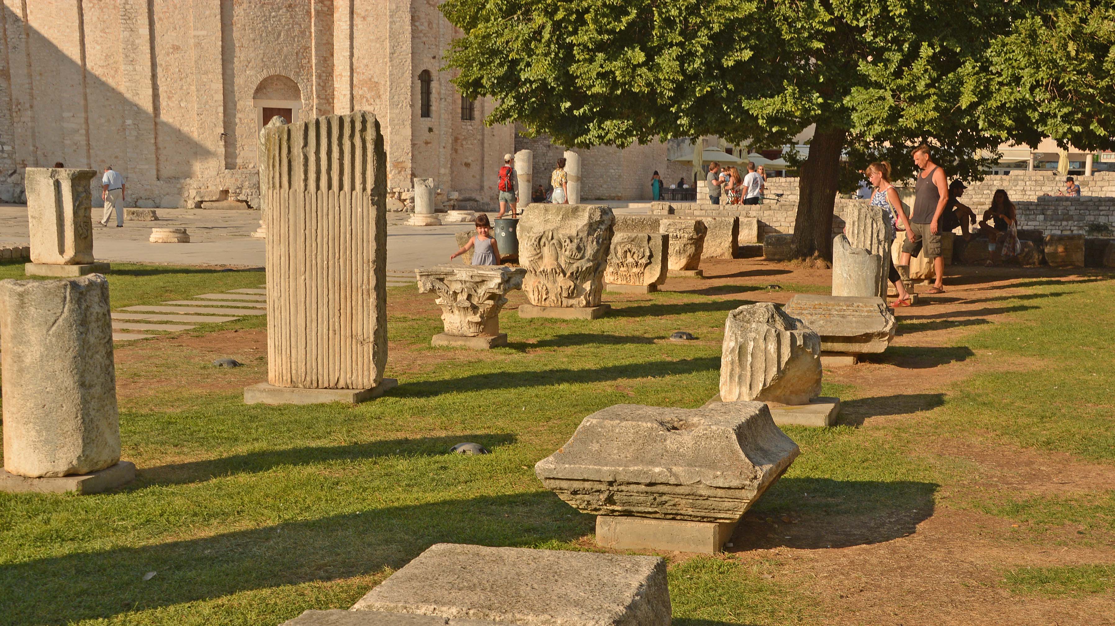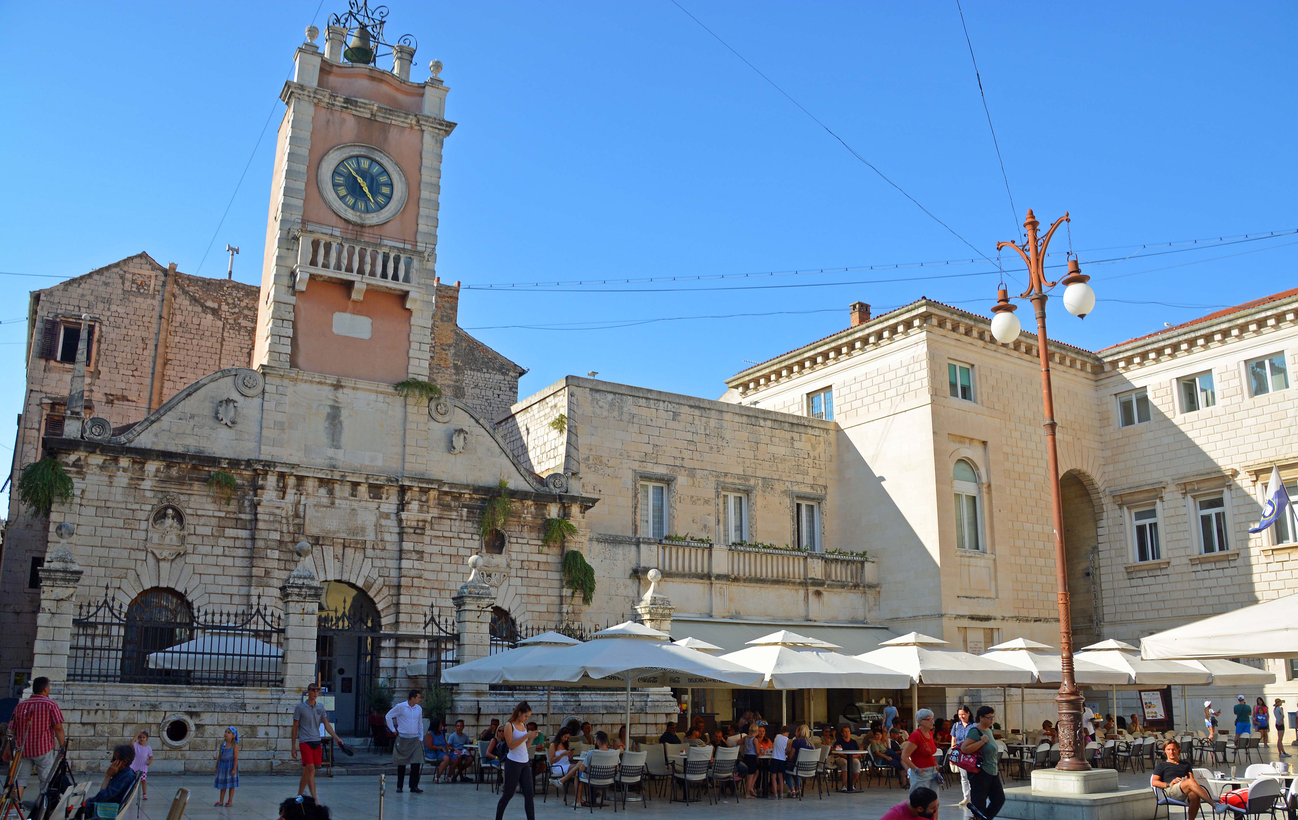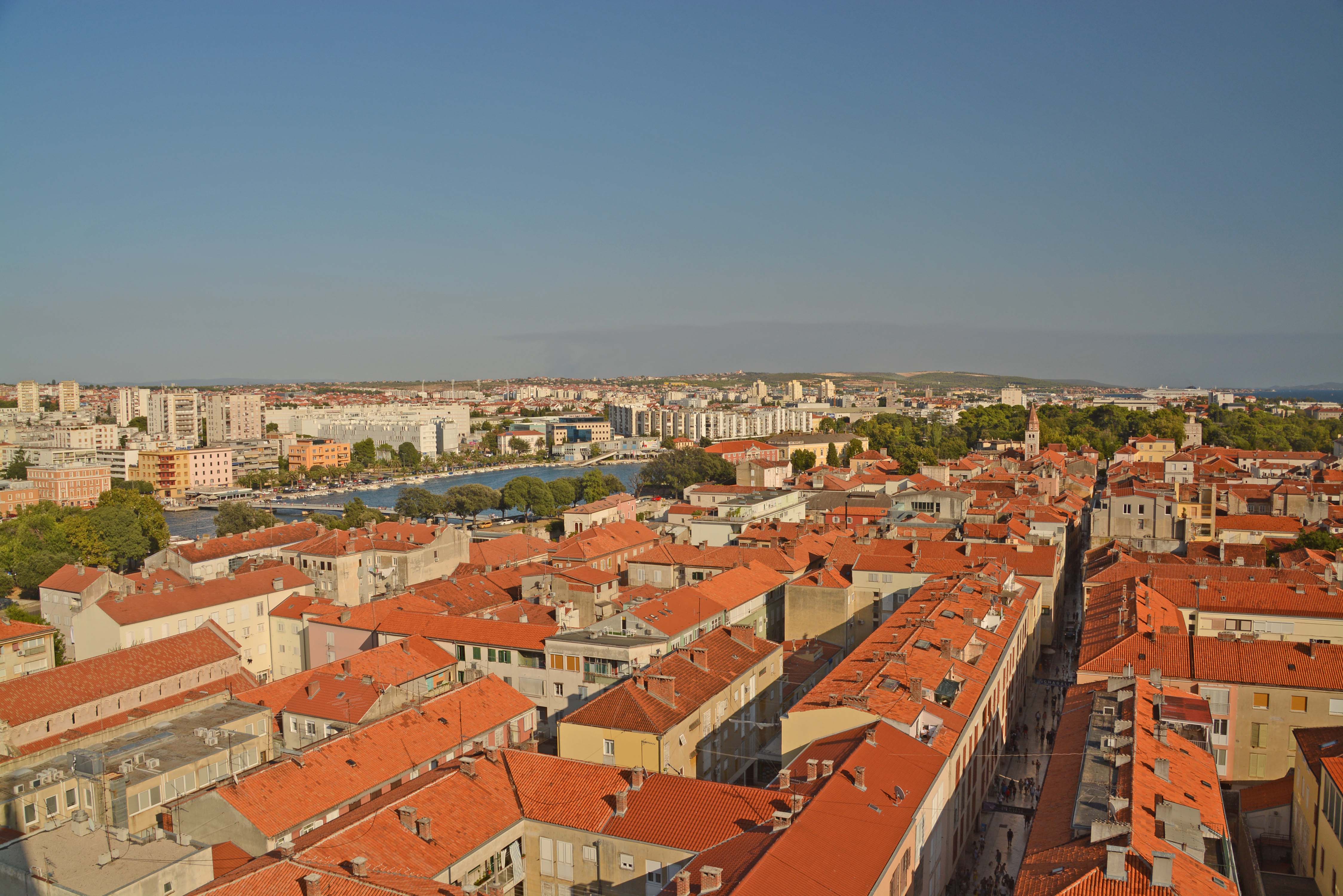 Wir lassen uns durch die engen Gassen mit den glänzenden Travertinsteinen treiben und stoßen auf den Uhrenturm, die Stadtwache und das Rathaus am Volksplatz Narodni Trg. Wir entdecken das Römische Forum von Kaiser Augustus, auf dem sich das Wahrzeichen der Stadt, die St. Donatiuskirche, ein runder vorromanischer Bau aus dem 9. Jahrhundert befindet und besteigen den Glockenturm. Wir haben einen fantastischen Rundblick über Zadar, das Meer und die Berge. Danach streifen wir durch die römischen Überreste des Forums bis zur 14 Meter hohen ‚Schandpfahl‘-Säule. Auf dem Weg zur Wasserorgel kommen wir an der frühromanischen Marienkirche vorbei. H. bemüht sich verzweifelt, ein Foto ‚mit OHNE Menschen‘ zu machen, was so gut wie unmöglich erscheint.