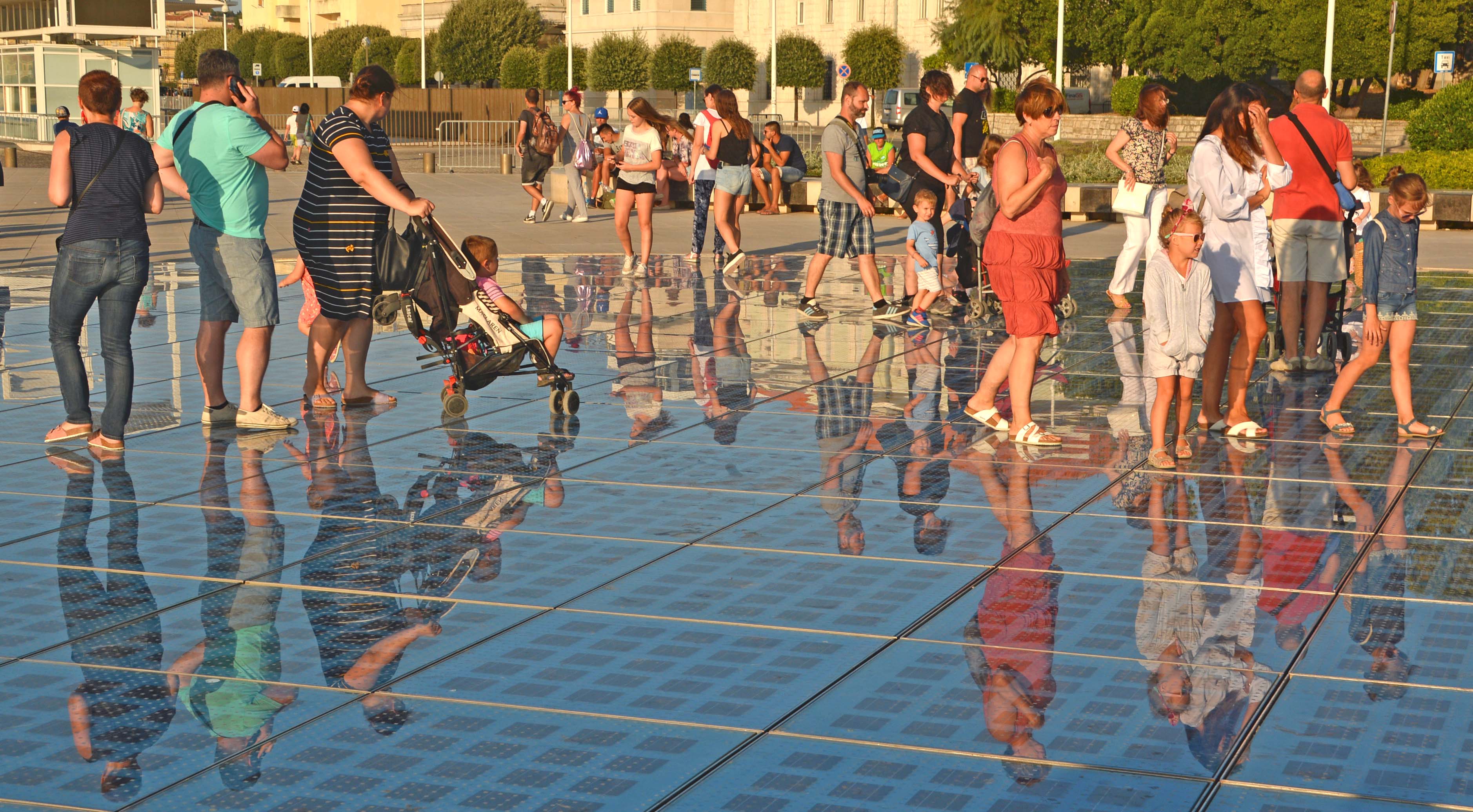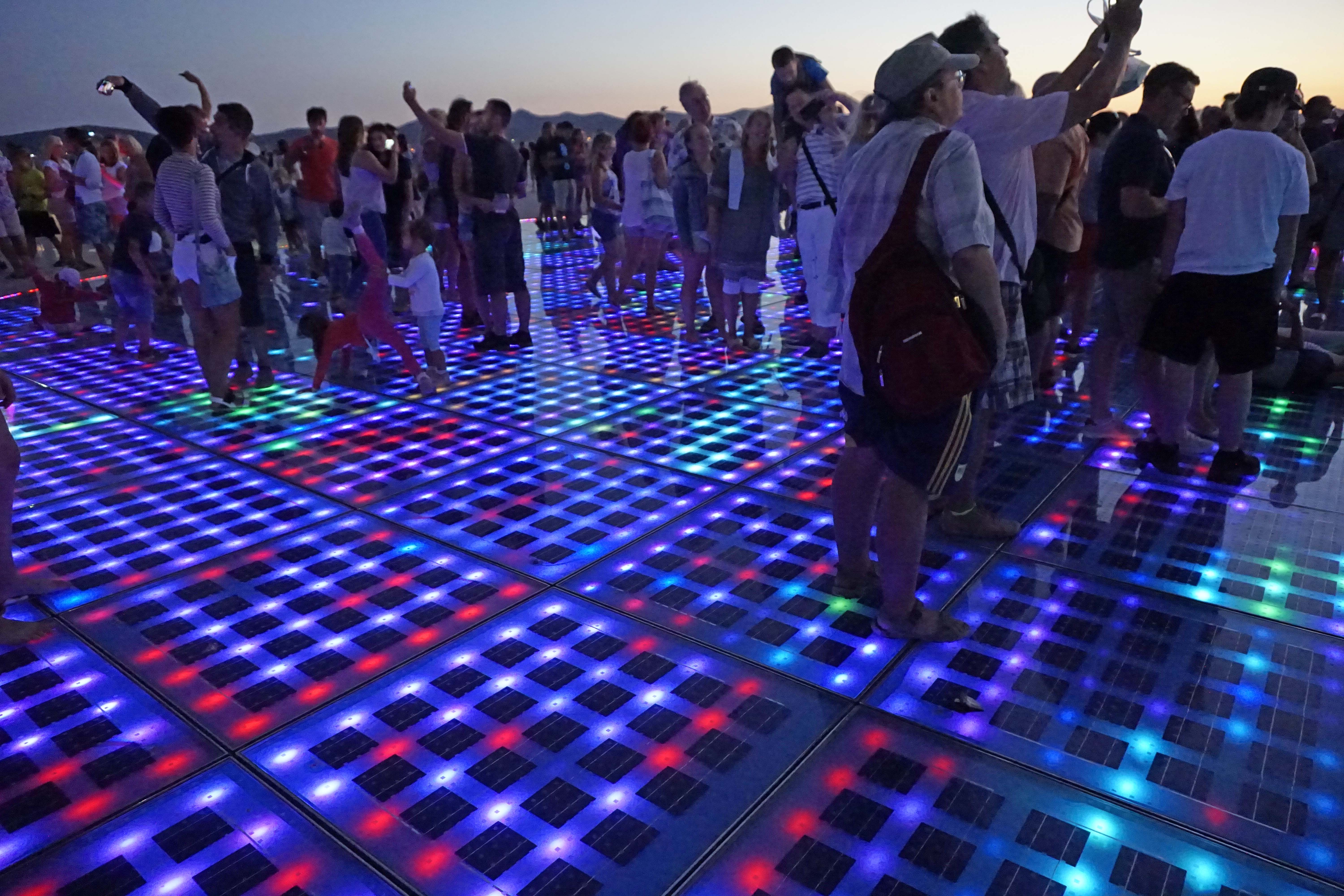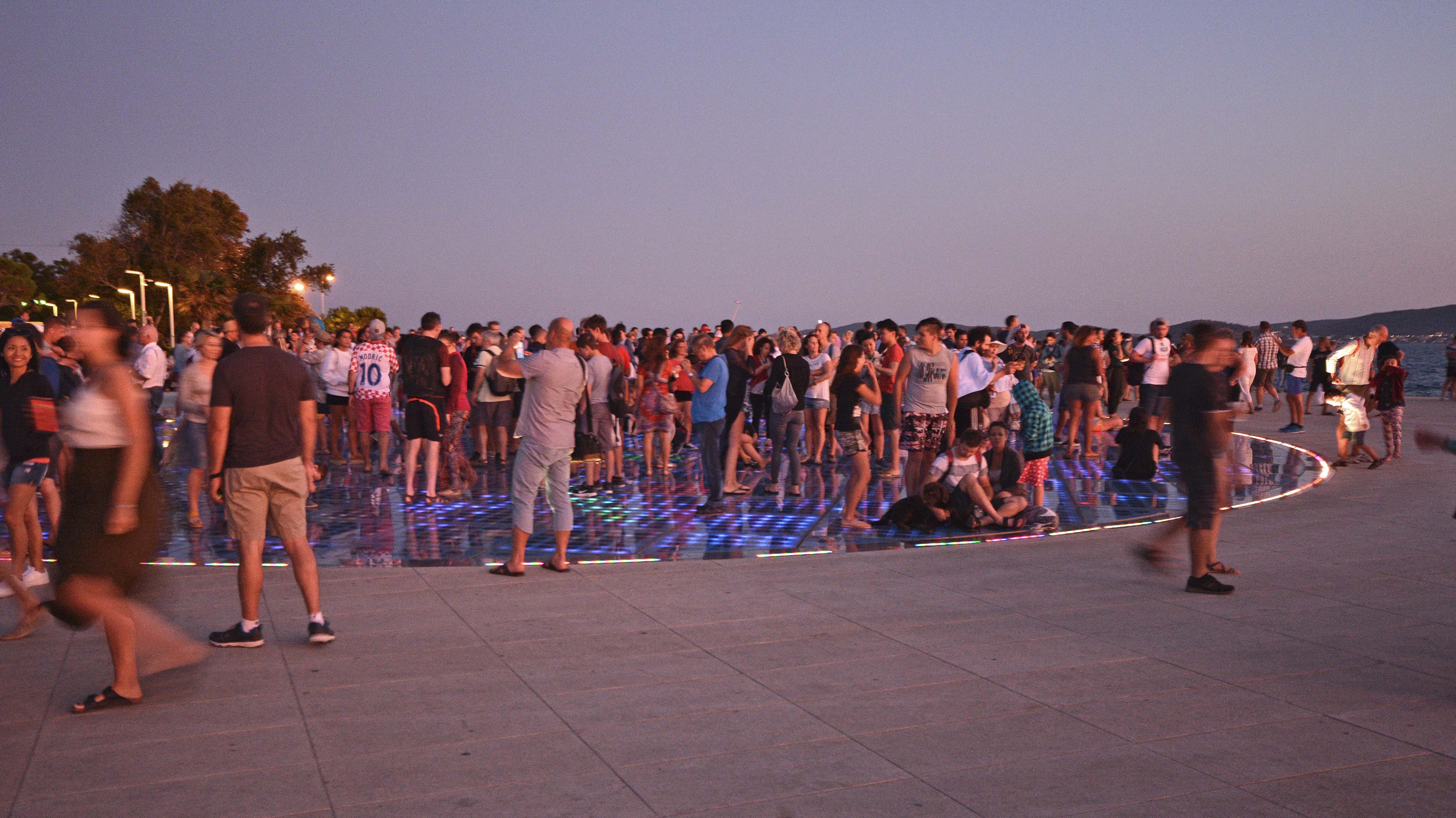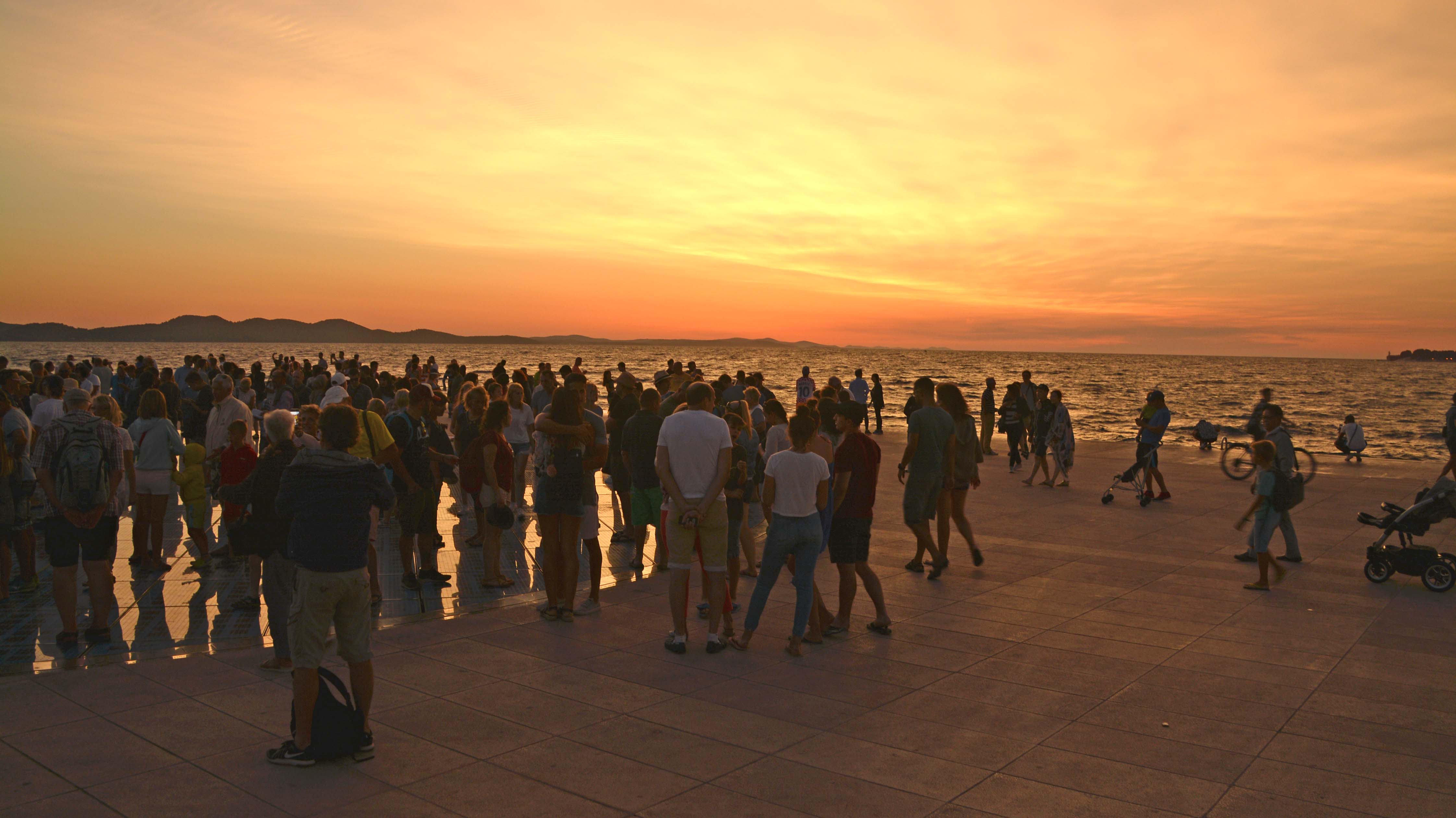 Nach einem kleinen Stück entlang der Riva (Strandpromenade) stoßen wir auf die ‚Meeresorgel‘, ein Naturorchester an der Spitze der Halbinsel. Sie ist 70 Meter breit und besteht aus steinernen Treppen, die bis ins Meer führen. Der Künstler hat 35 Rohre, zahlreiche Pfeifen und viele kleine Öffnungen verbaut, aus denen in 7 Akkorden mit der Kraft der hineinplätschernden Wellen die Töne entstehen. Wir merken an der Menschentraube, dass es langsam auf den Sonnenuntergang zugeht.