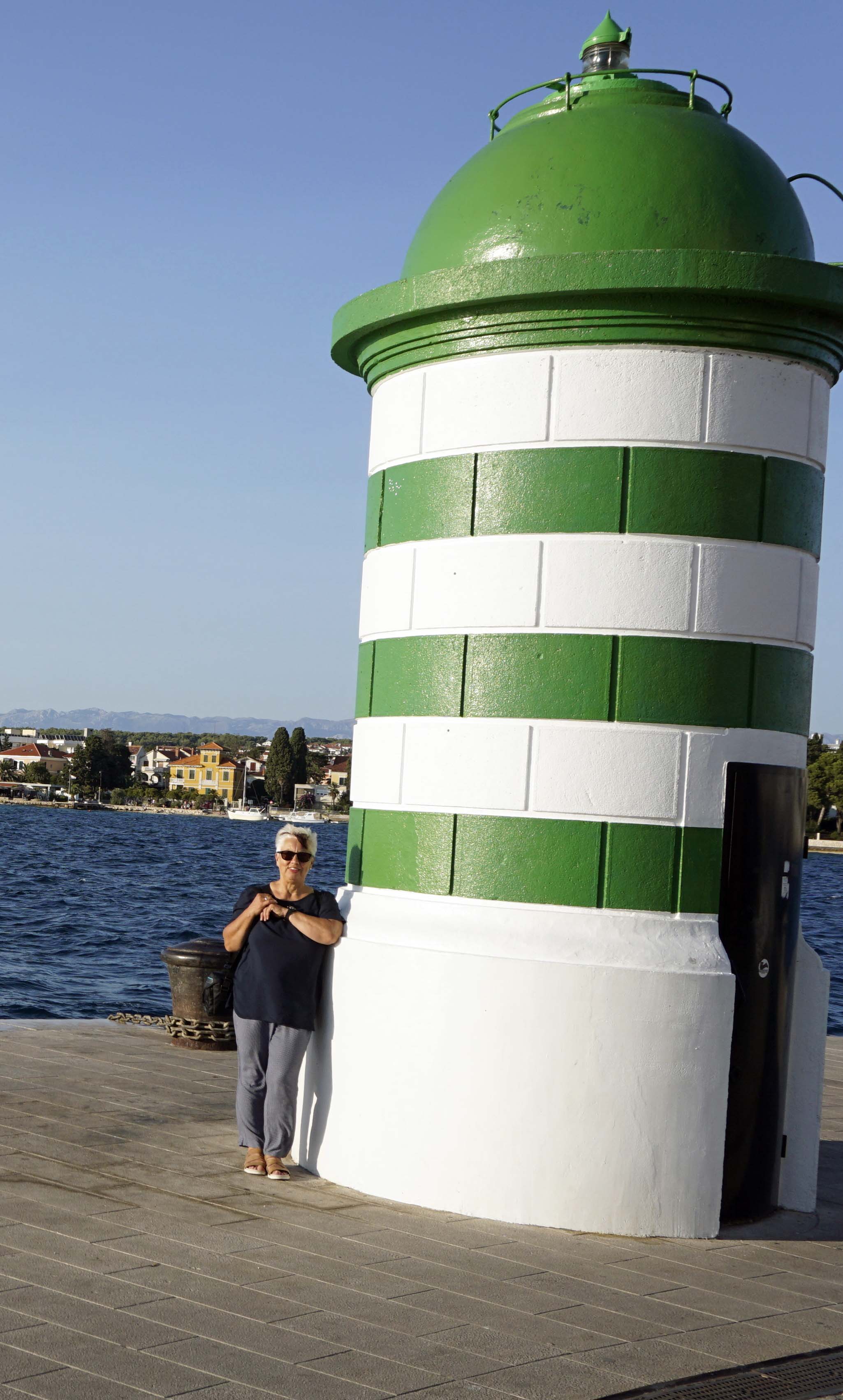 Gleich neben der Meeresorgel sehe ich zahlreiche Selfie-Stangen mit hineingrinsenden Menschen auf einer Scheibe stehen, die aus 300 mehrschichtigen Glasplatten besteht. Das ist der ‚Gruß an die Sonne‘. Bei Dunkelheit geben die Platten die Sonnenenergie des Tages in Form von Licht im Rhythmus der Meeresorgel ab: ein Denkmal für die Sonne, die hier im Meer hinter der Insel Ugljan untergeht. Für Alfred Hitchcock war es der schönste Sonnenuntergang der Welt. Jacky Kennedy – sie weilte nur zwei Stunden in der Stadt – hatte allerdings nur Augen für die 89 kargen Inseln der Kornaten. Davon später.