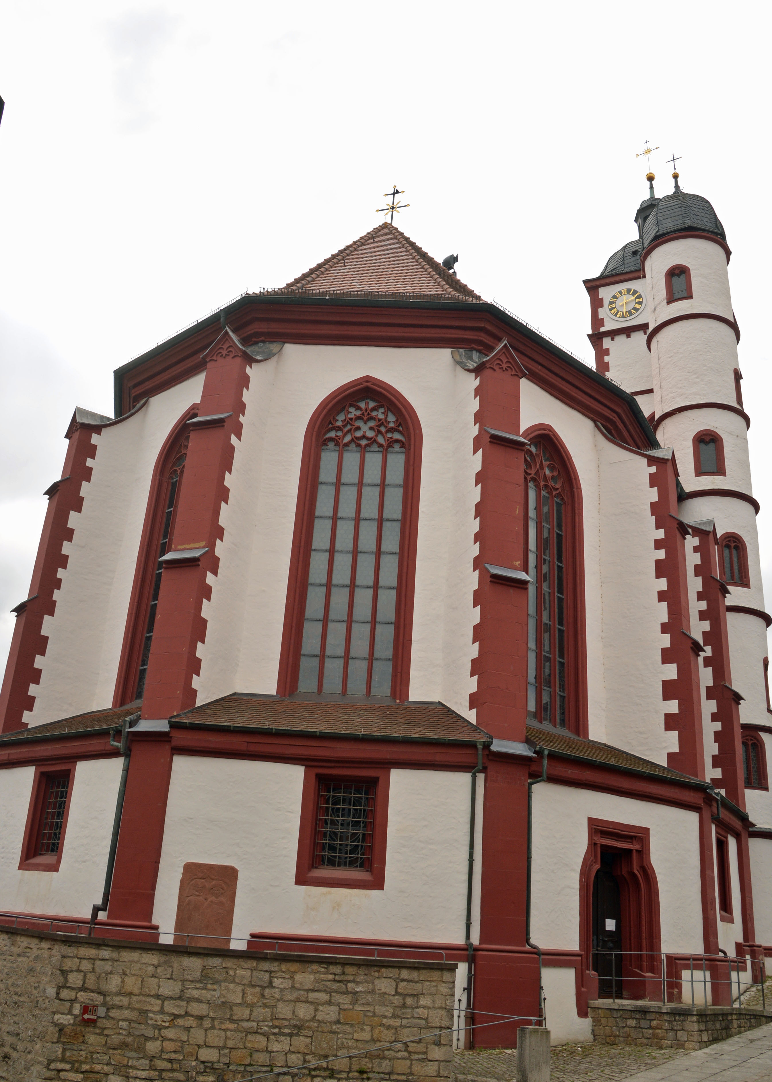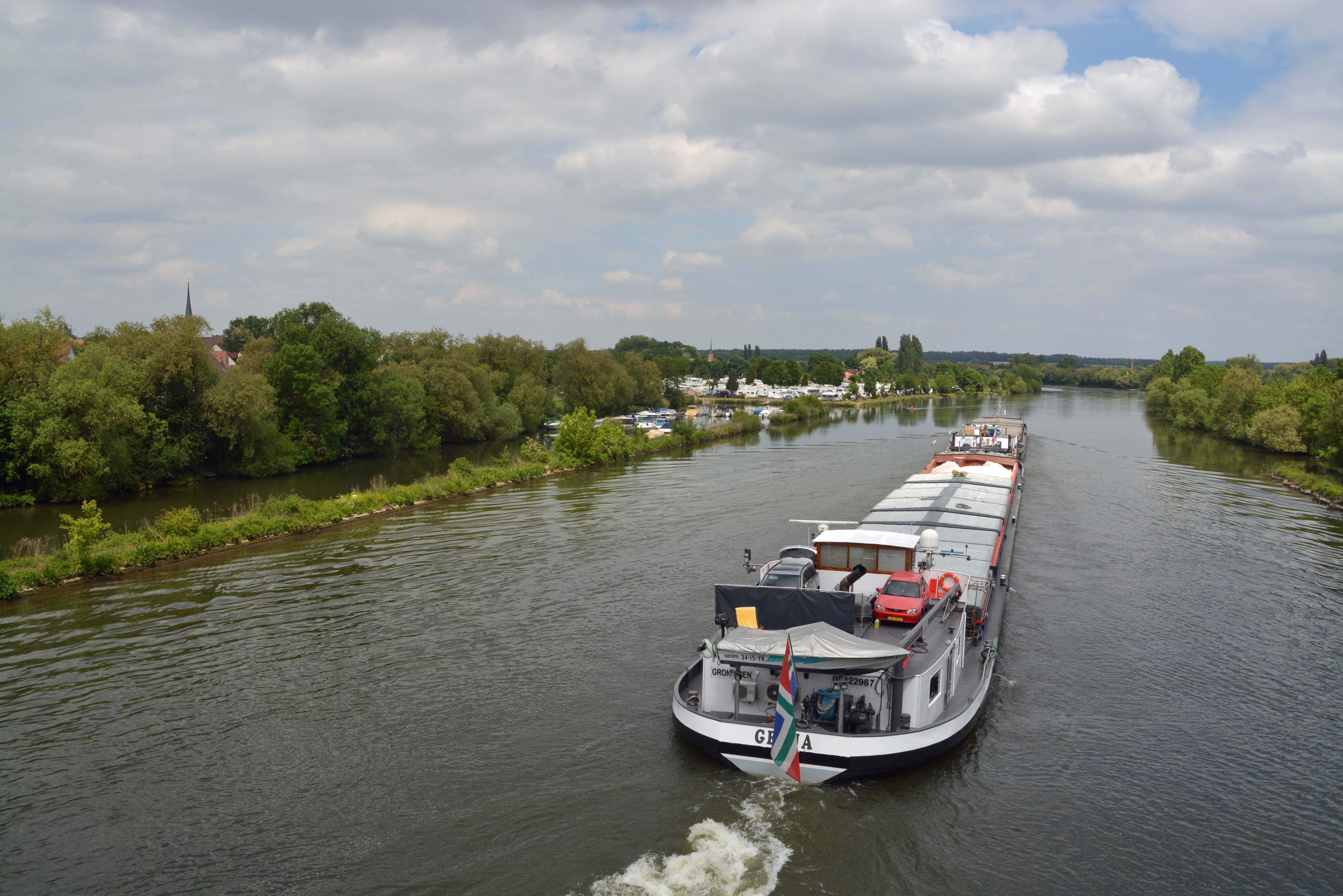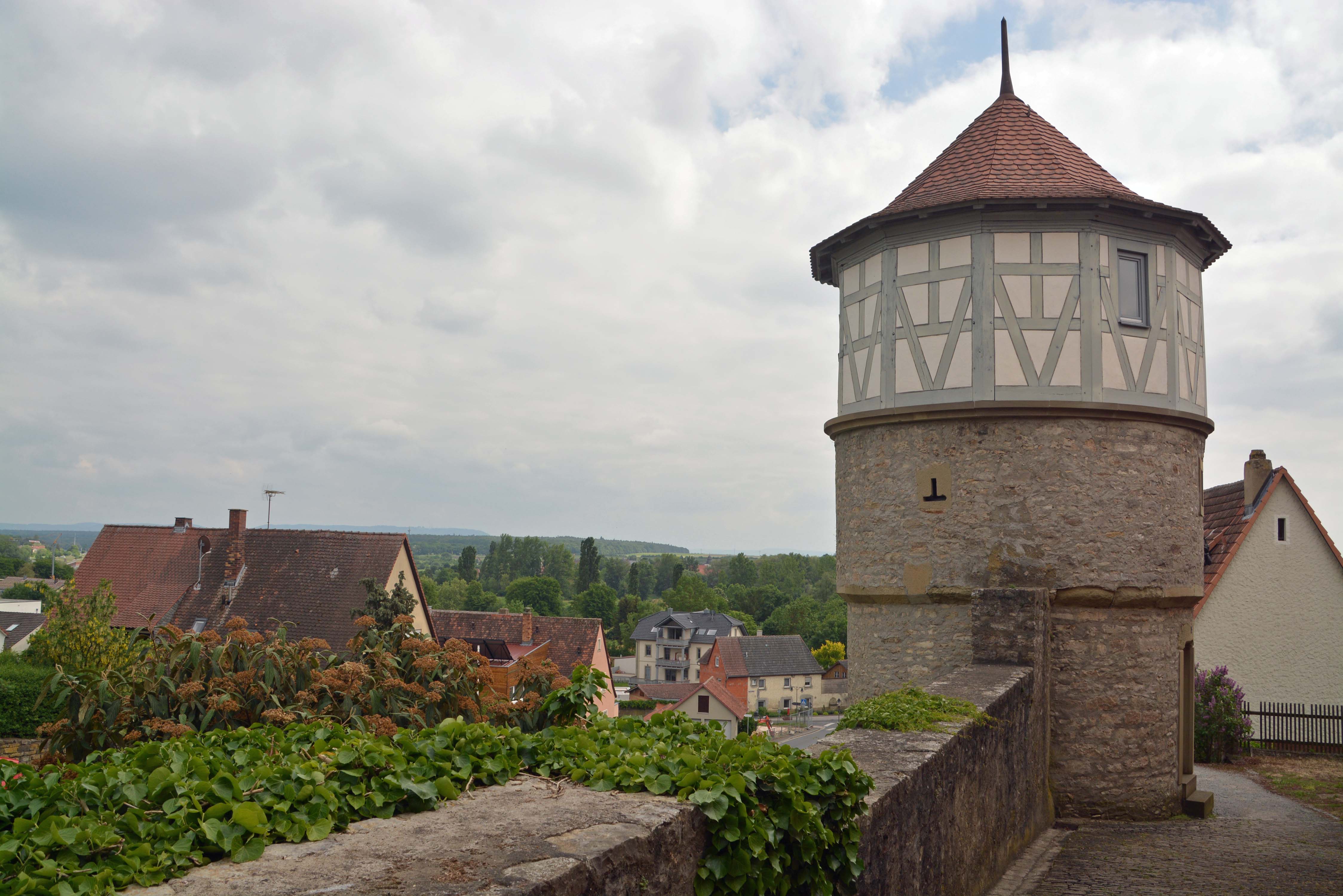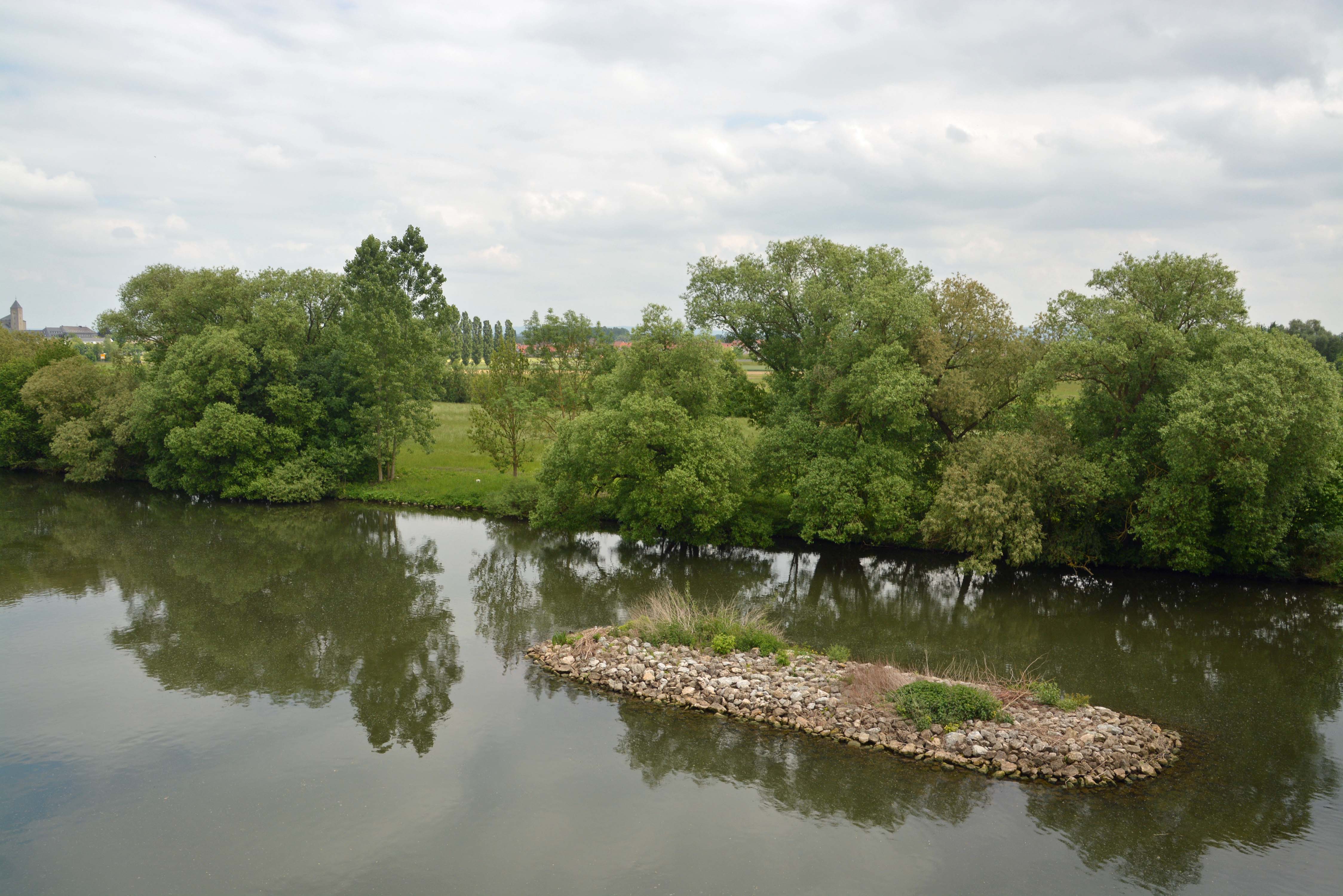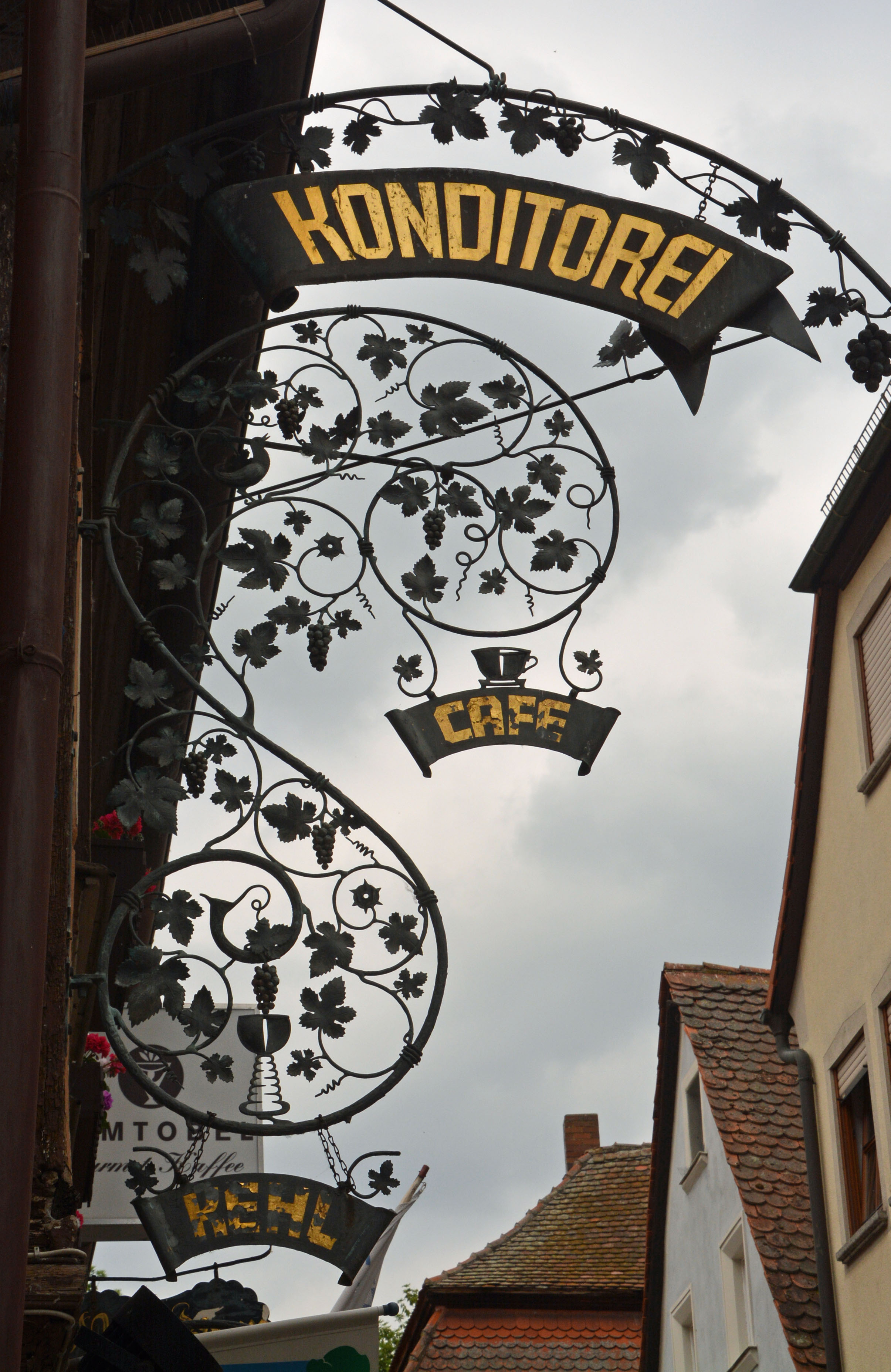 In Münsterschwarzach schauen wir uns die Benediktinerabtei an. In Dettelbach besichtigen wir die Stadtpfarrkirche St. Augustinus, das Brücker und das Faltertor sowie das historische Rathaus. Das Örtchen ist voll von Main-Radlern, und ein Plätzchen für unsere Räder zu finden, ist nicht einfach. In Frankens ältester Konditorei „Café Kehl“ nehmen wir Kraftnahrung und Käffchen zu uns. Dazu reicht man uns ein Pilger- oder Wallfahrtsgebäck mit dem lustigen Namen „Muskatzinen“. Das Rezept gibt es seit 1691 und die Form des Gebäcks erinnert an eine gefältete Krawatte. Mittlerweile ist es wolkig aber nach wie vor warm. Das perfekte Radlwetter eben.