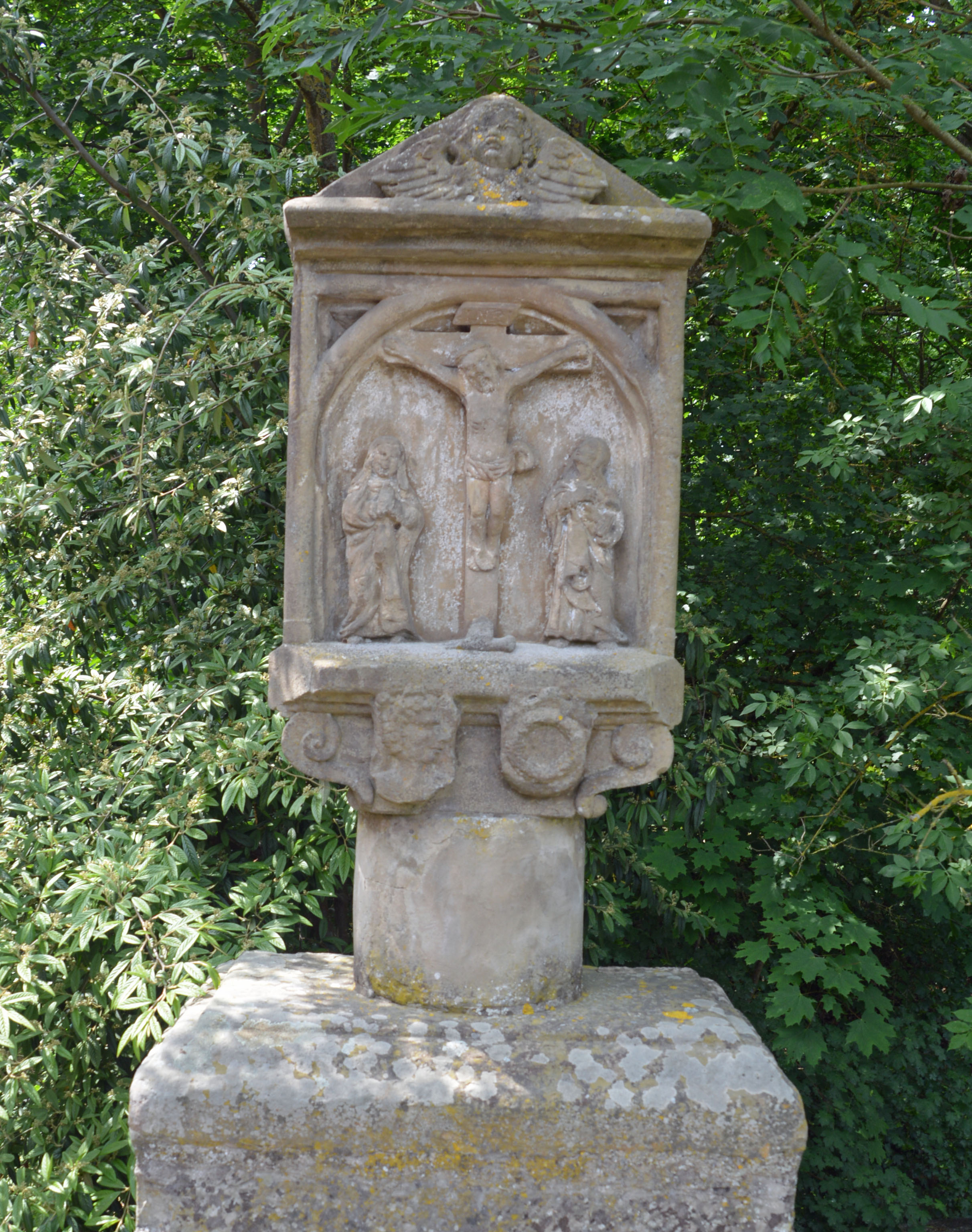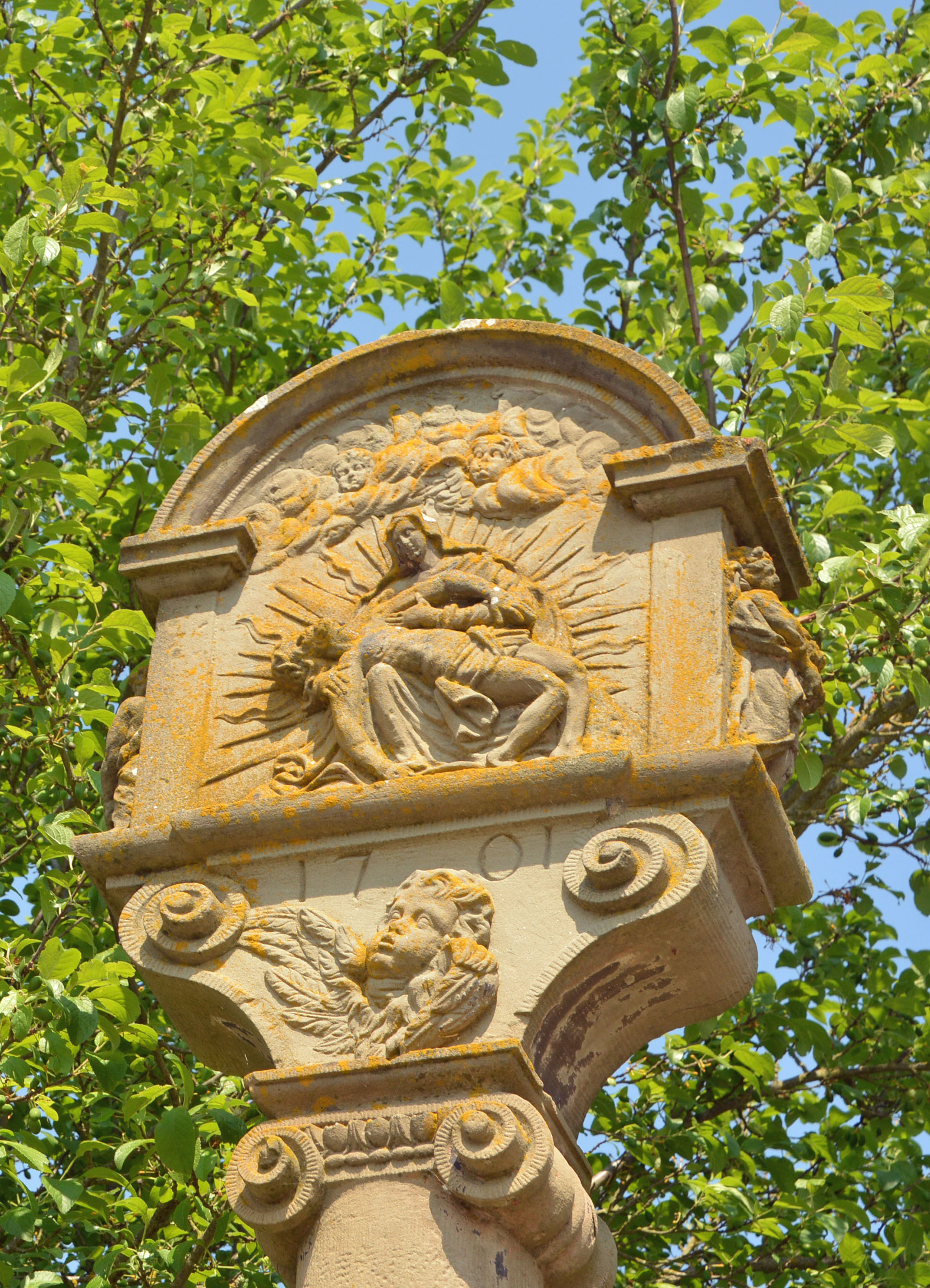 Die Dettelbacher Gruppe strampelt durch wunderschöne Blumenwiesen, Rapsfelder und Weinreben. Immer wieder treffen wir auf sogenannte Bildstöcke, religiöse Kleindenkmäler mit in Stein gemeißelten Bitt- und Dankgebeten. Davon gibt es tausende in Franken!