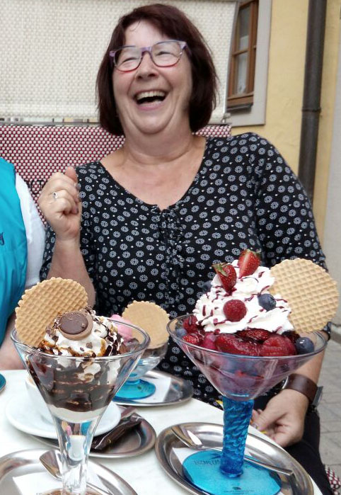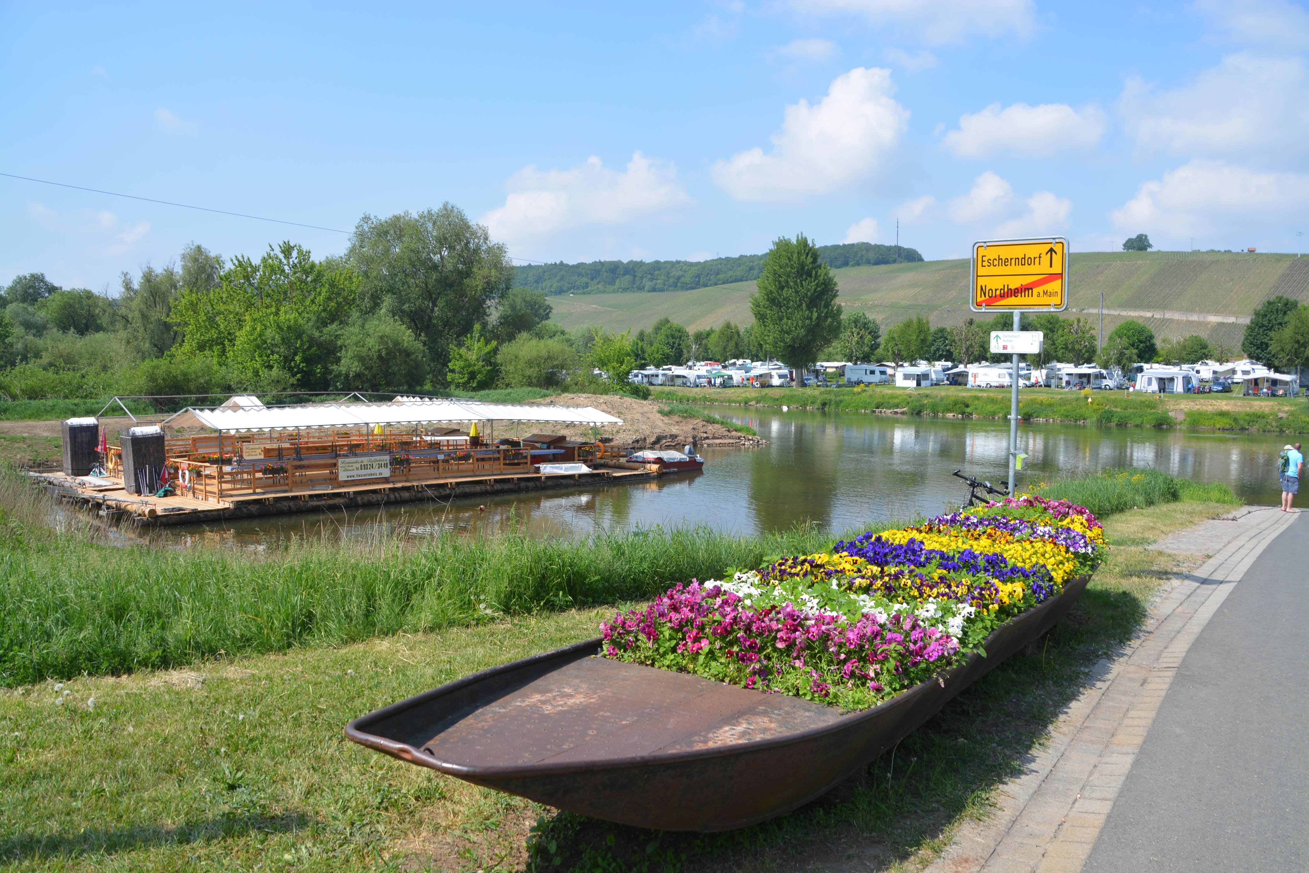 In Nordheim suchen wir vergeblich das Weinfest, welches erst ab 17 Uhr für die Gäste da ist. Dafür bewundern wir das riesige Floß (75 Personen), mit dem man eine Mainschleifenfahrt unternehmen kann. Wir beschließen, in Sommerach ein Vesper-Päuschen einzulegen. In der hiesigen Wintergenossenschaft gibt es ein nettes Plätzchen, sehr guten Wein und hervorragenden Kochkäse und Hausmacher Wurst. Sieben Radlerinnen und Radler beschließen die Weiterfahrt ins historische Dettelbach. Der Rest radelt nach Volkach zurück, um dort in „Eisbergen“ zu schwelgen.