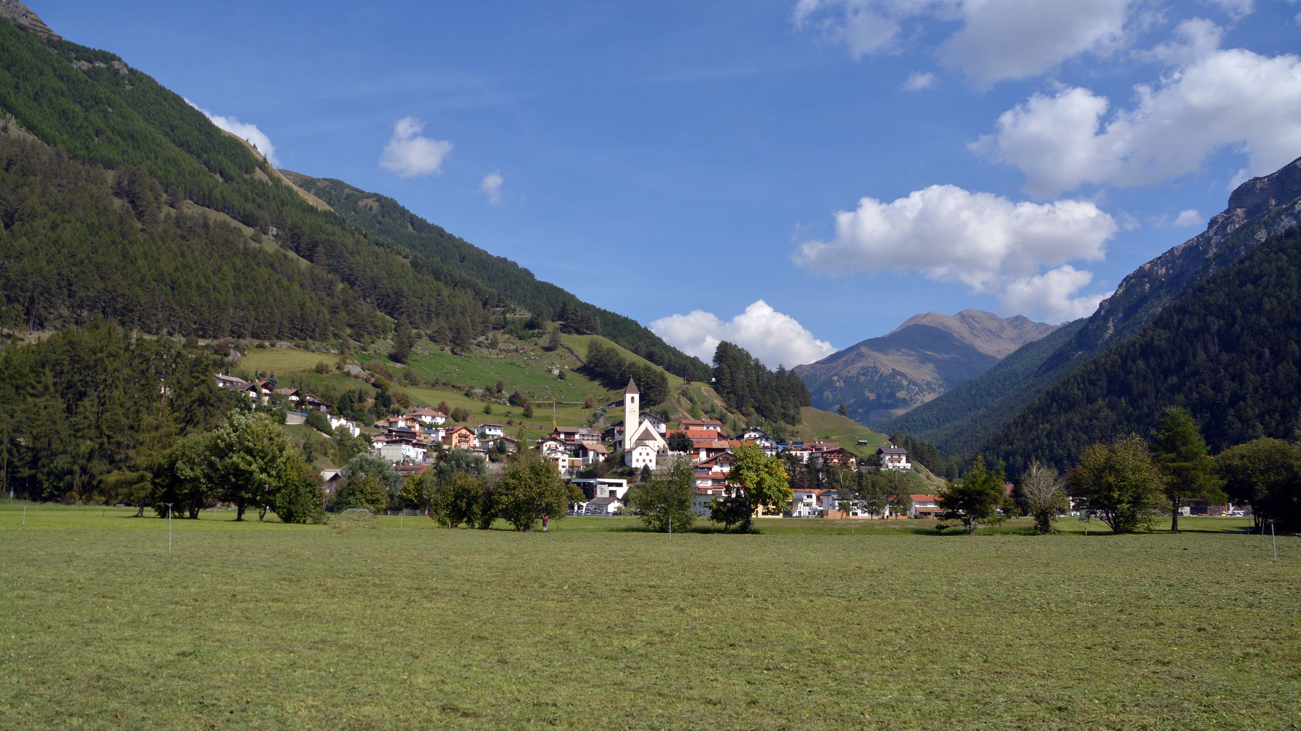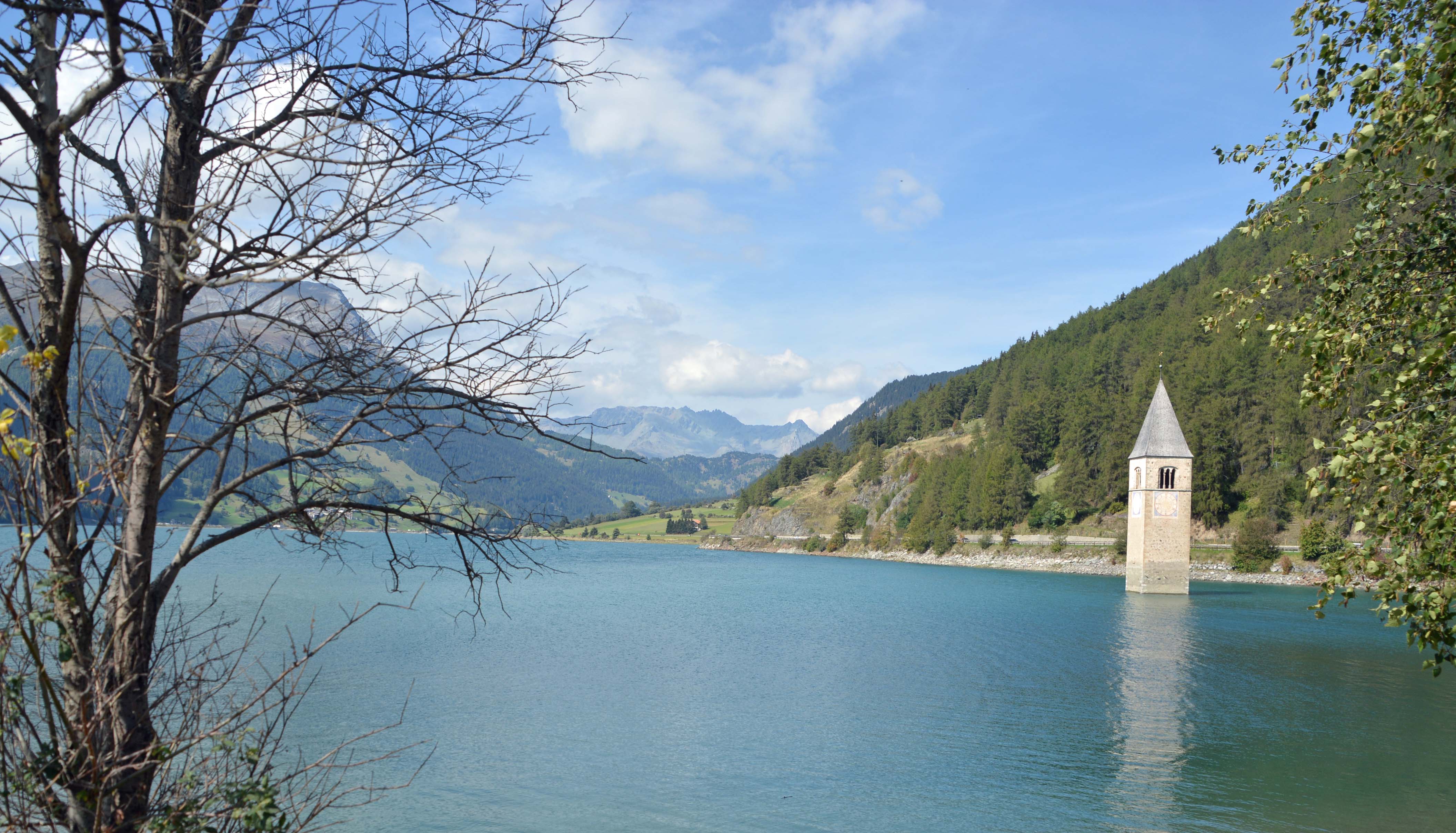 Der Ort befindet sich auf 1.450 Metern Höhe. Wir bestaunen den ‚Kirchturm von Graun‘, der millionenfach fotografiert wird. Er steht mitten im See, ist toll anzusehen, aber er ist ein Mahnmal für die versunkene Stadt, als der See nach dem Krieg gestaut wurde.