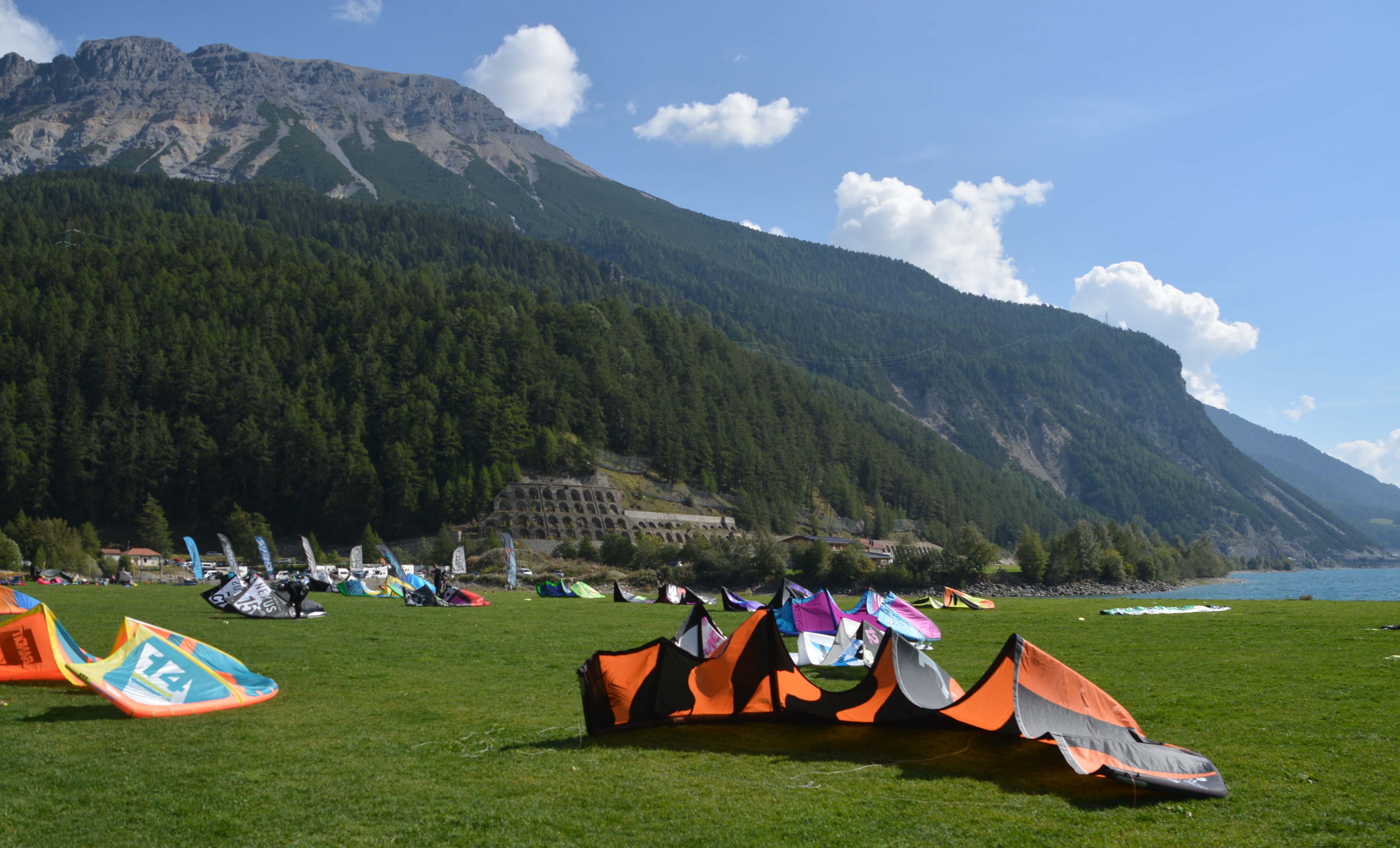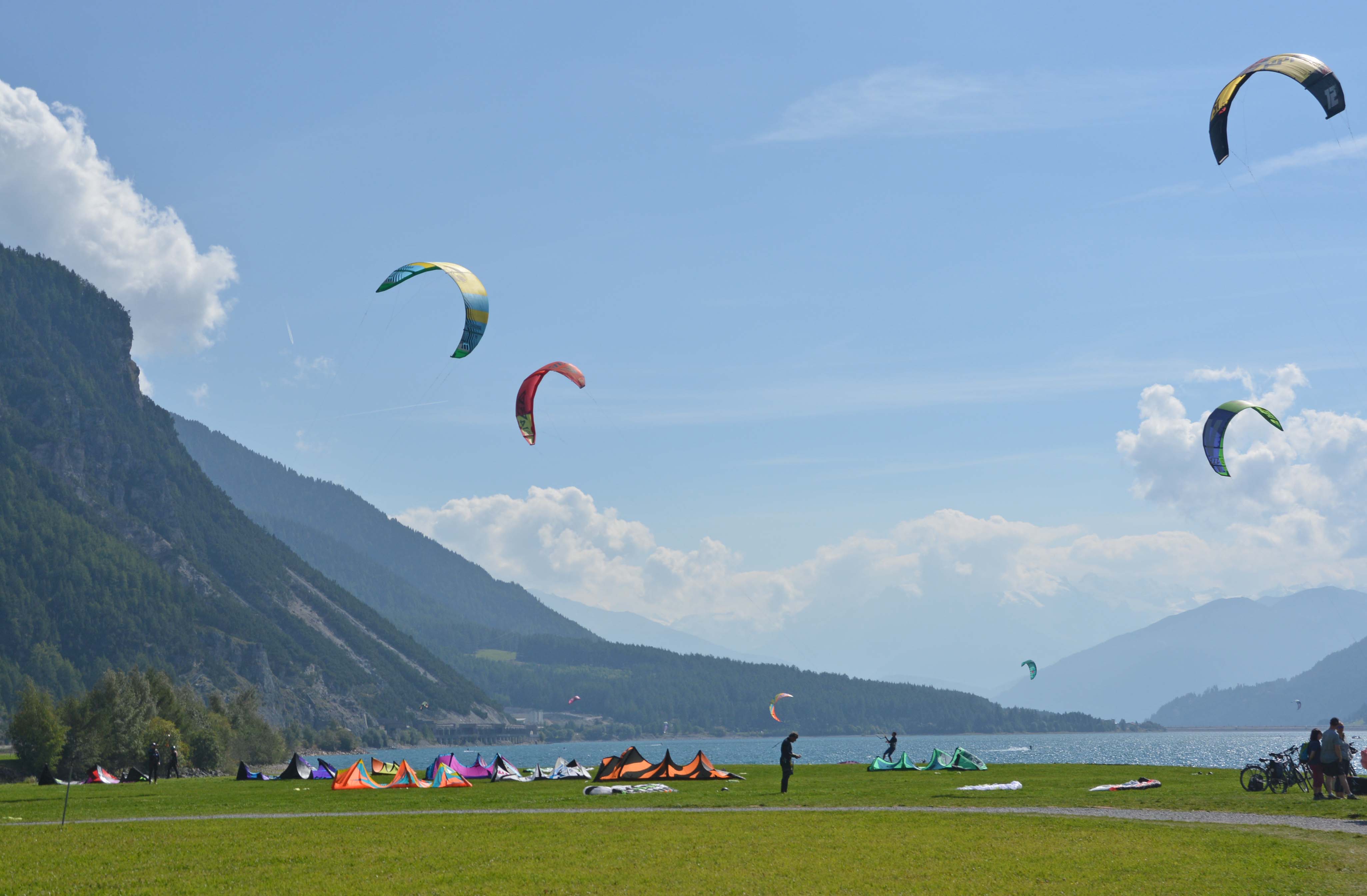 Bei klarem sonnigem Wetter und viel Wind tummeln sich zahlreiche Kitesurfer auf dem See. Ein farbenprächtiges Erlebnis.