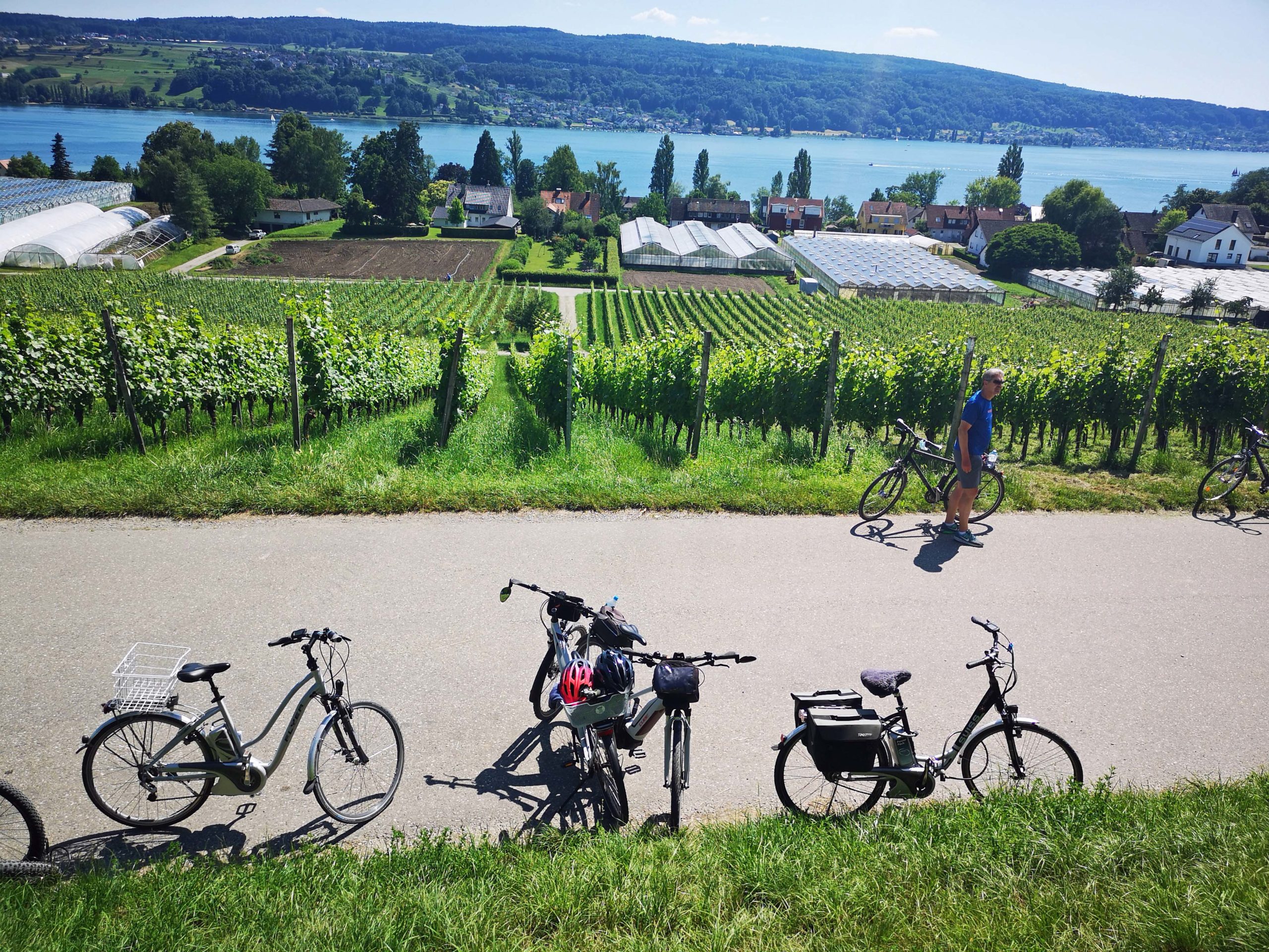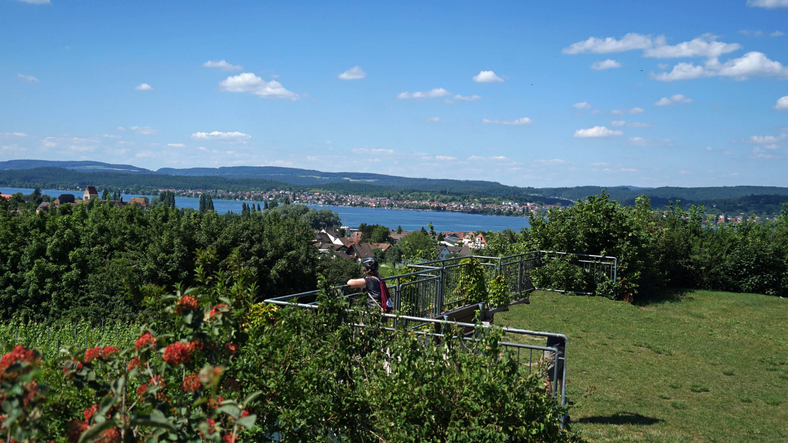 Die Neugier siegt und wir entschließen uns für die Variante Hochwart. Es geht schon ziemlich bergauf. Trotz mittlerweile gutem ‚Hügeltraining‘ steige ich die letzten 100 Meter vom Rad und laufe. Und richtig die Blicke auf Insel und den westlichen Teil des Bodensees sind überwältigend.