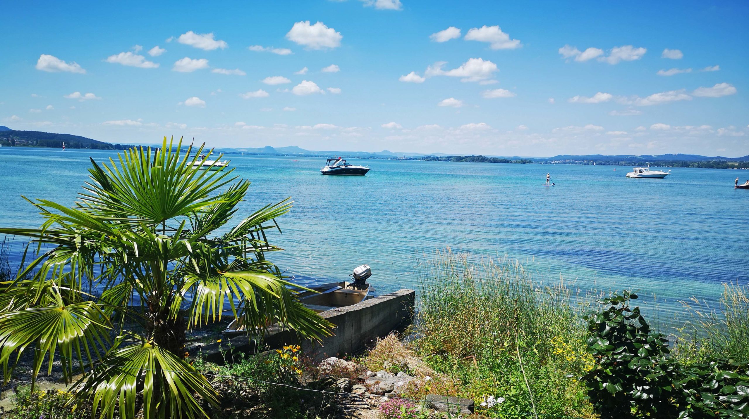 Hinter dem Strandbad geht es nach Niederzell und damit zu Kirche Nummer drei: St. Peter & Paul. Hier an der nördlichen Spitze nutzen wir den Uferweg für die Wanderer. Der führt uns zu einem der schönsten Campingplätze am Bodensee, zum Camping Sandseele. Hier soll es legendäre Sonnenuntergänge- auf neudeutsch ’sundowner‘ geben!