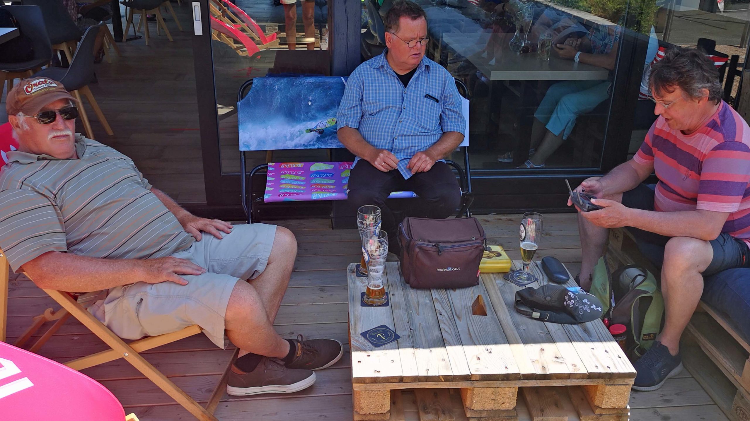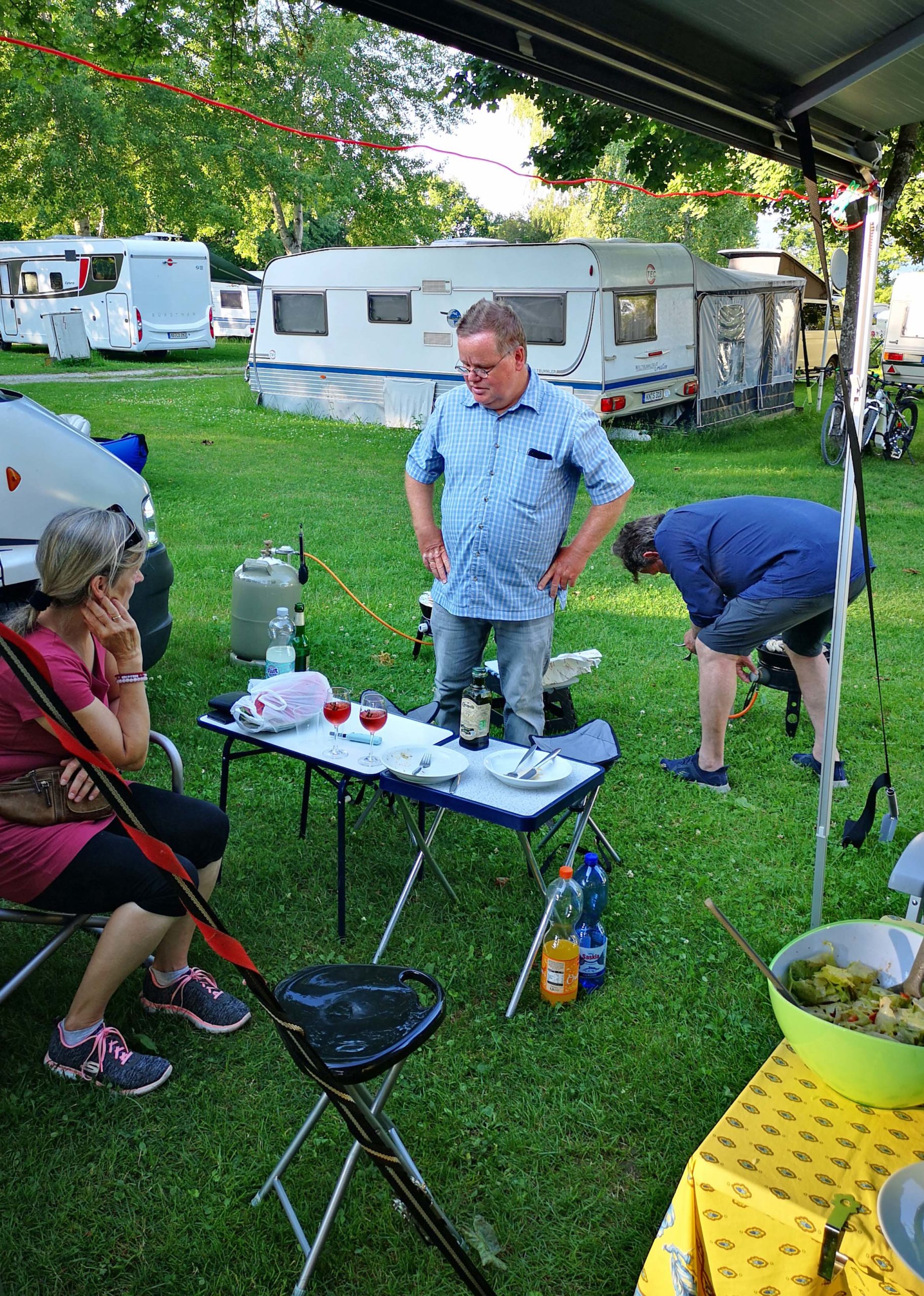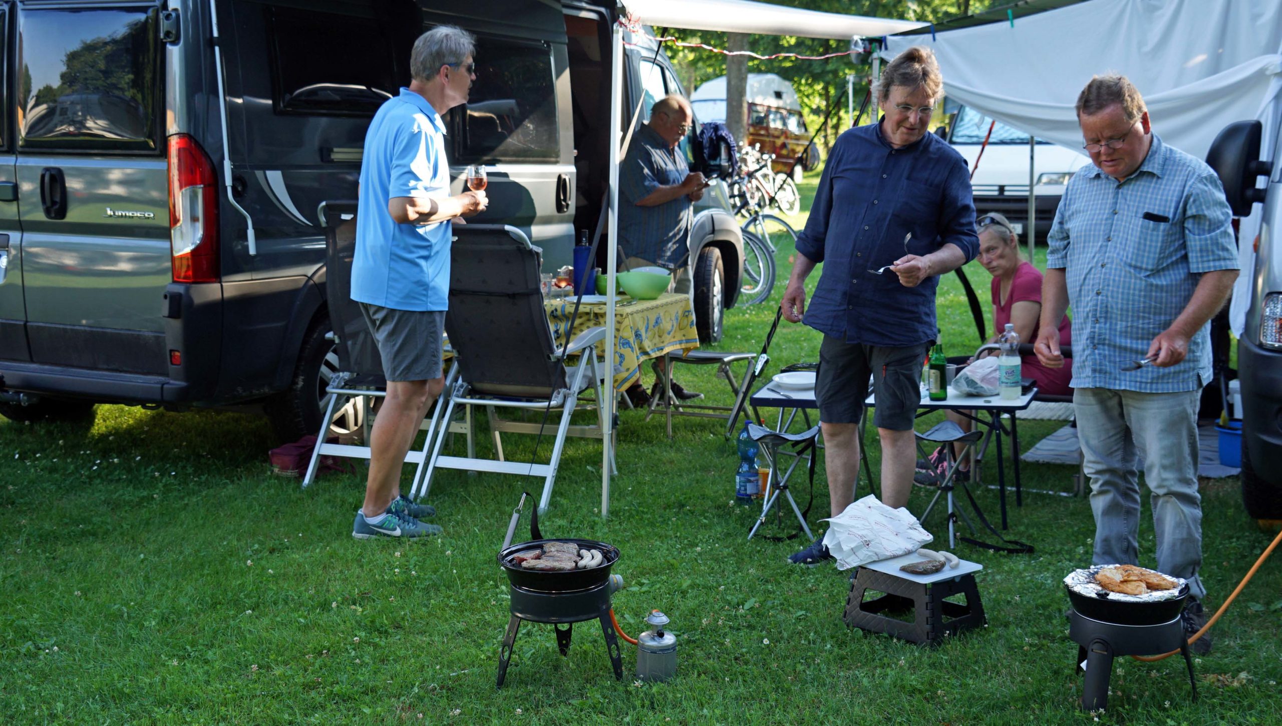 Wir Camper sorgen in der Zwischenzeit für genügend Sitzgelegenheiten und bereiten die Grills vor. Kurze Zeit später kommt das Grillfleisch angeradelt.