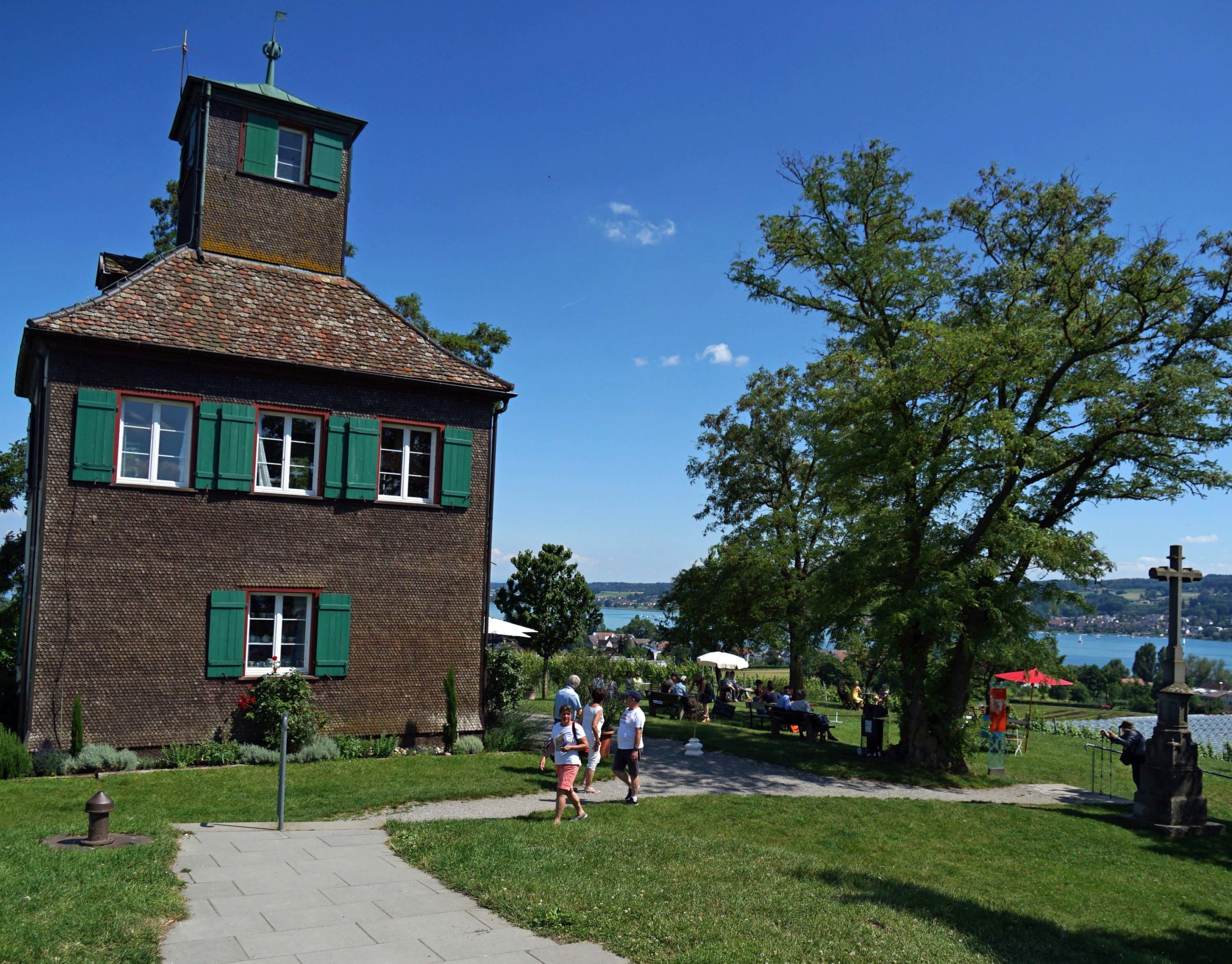 Hinter dem Fähranleger auf dem Rückweg zum Ausgangspunkt bringen wir es tatsächlich fertig und verfahren uns! Ganz großes Kino!!! Ohne es zu wissen stehen wir dadurch genau am Abzweig zum Hochwart, DEM Aussichtspunkt auf der Reichenau. Ich frage eine Anwohnerin nach dem Weg Richtung Konstanz. ‚Es gibt zwei Möglichkeiten von hier‘, antwortet sie. ‚Einen direkten Weg und den Weg über den Hochwart‘. Die Steigung sei zu schaffen und wir würden auf jeden Fall etwas großartiges verpassen, denn die höchste Erhebung auf der Insel bietet einen unbeschreiblichen Rundblick.