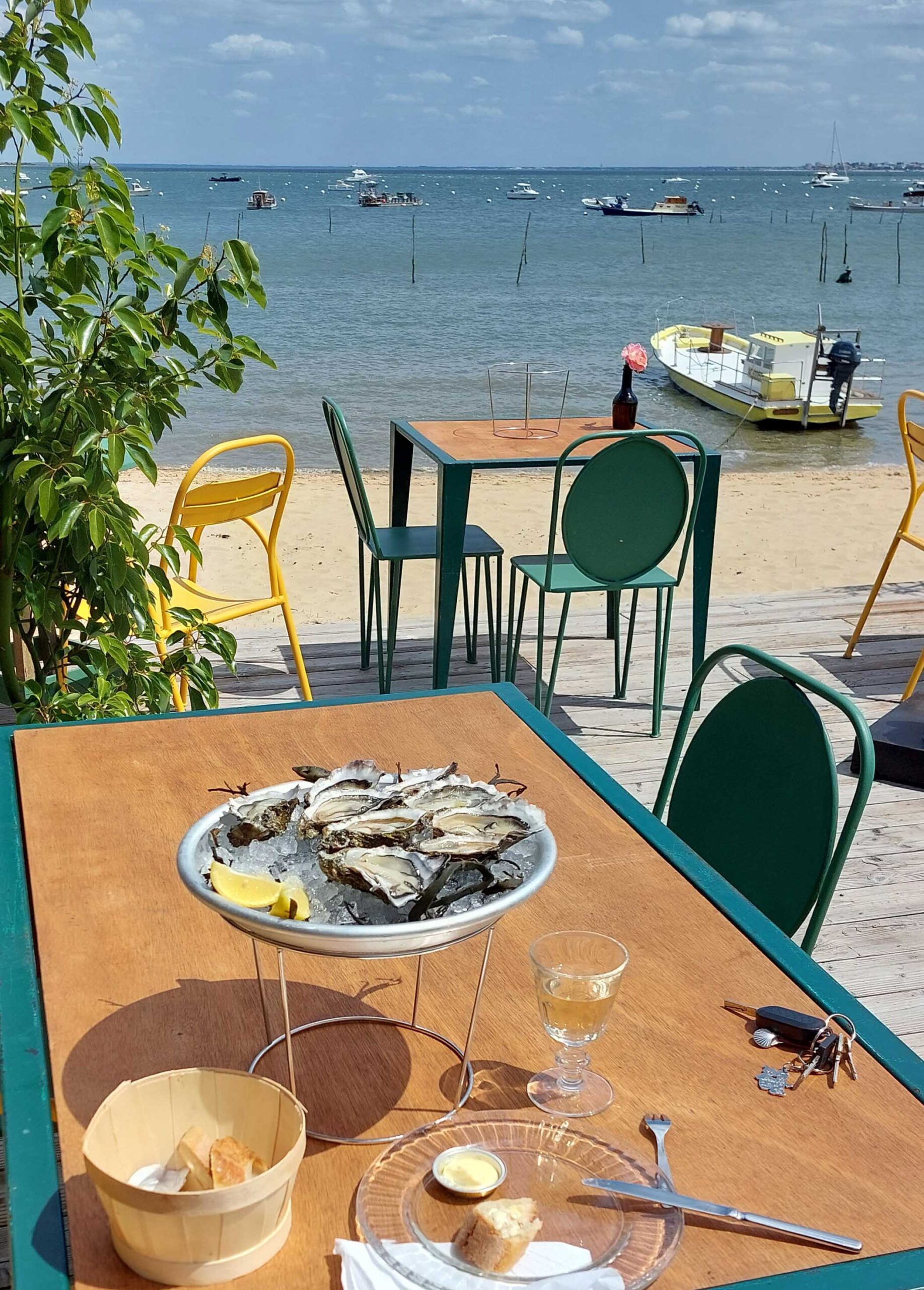 Elf Austerndörfer und -häfen gibt es auf dem Cap Ferret. Der Hunger auf Austern 🦪🦪🦪steigt und ich halte in Le Canon, einem Geheimtipp! Ich entscheide mich für die Cabane der Familie Réveleau. Anselm Chai ist Austerzüchter, wie viele aus seiner Familie schon seit Generationen. Ich genießeauf der blumengeschmückten Terrasse meine Austern mit einem Glas Rosé🍷 in vorderster Front des Arcachonbeckens – fast mit den Füßen im Wasser! Ein letzter magischer Moment auf meinem Ausflug.