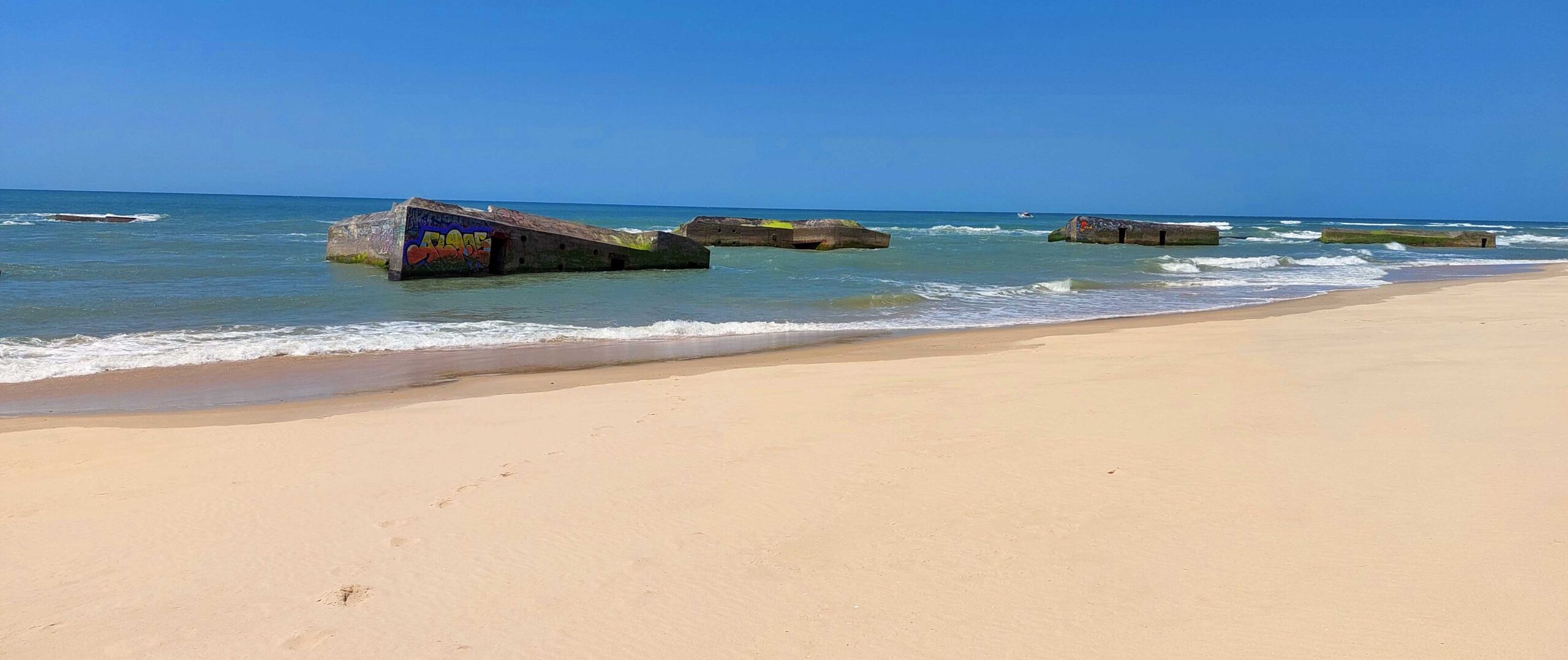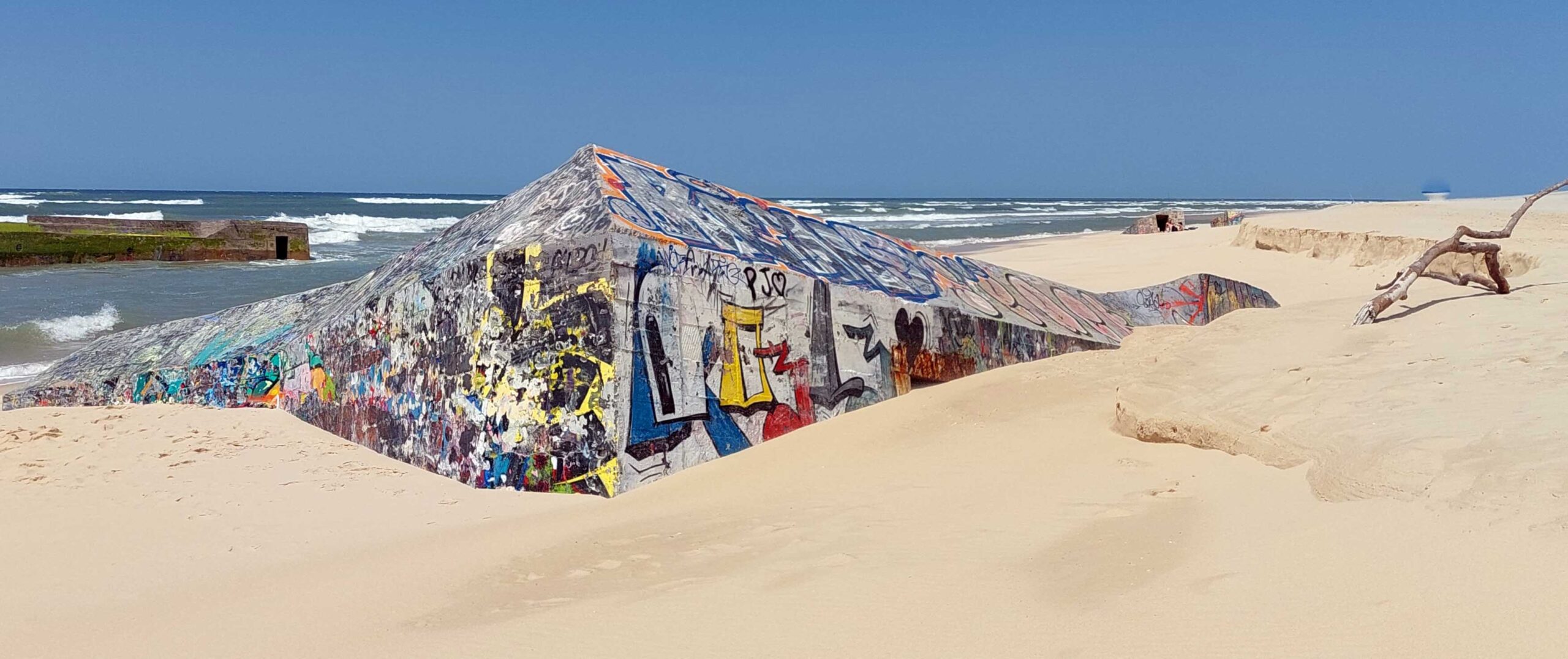 Hier liegen seit dem 2. Weltkrieg noch Überreste von Schützenbunkern 🥷der Deutschen Marineartillerie im Sand. Sie wurden oben auf der Düne gebaut und sollten eine mögliche Landung der Alliierten in Frankreich verhindern. Heute sin lerlei Graffitis verziert und warten darauf, ebenfalls im Ozean zu versinken. Aufgrund des Fortschreitens der Düne landeinwärts liegen einige dieser Bunker heute bis zu 25 Meter tief im Ozean.