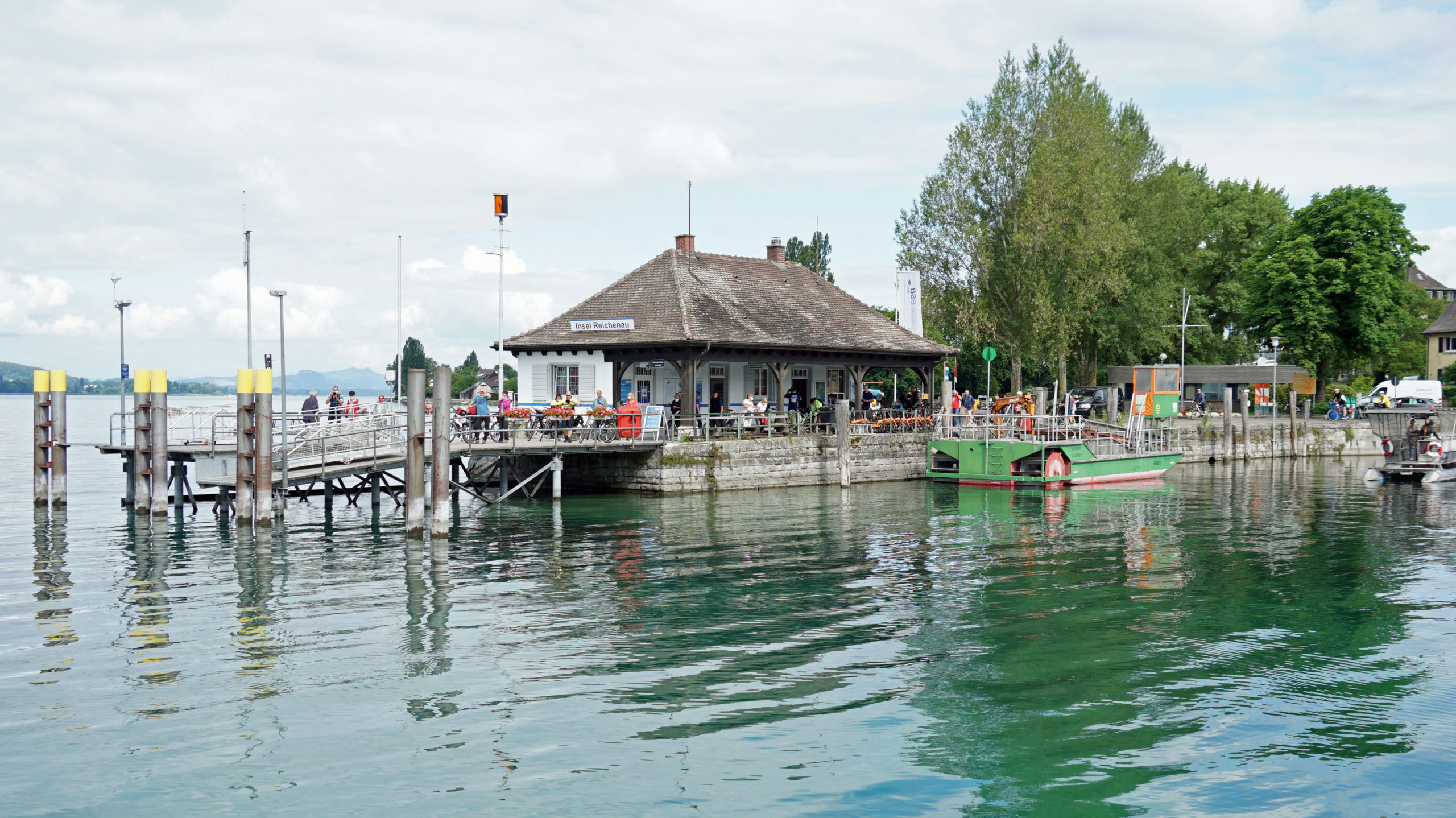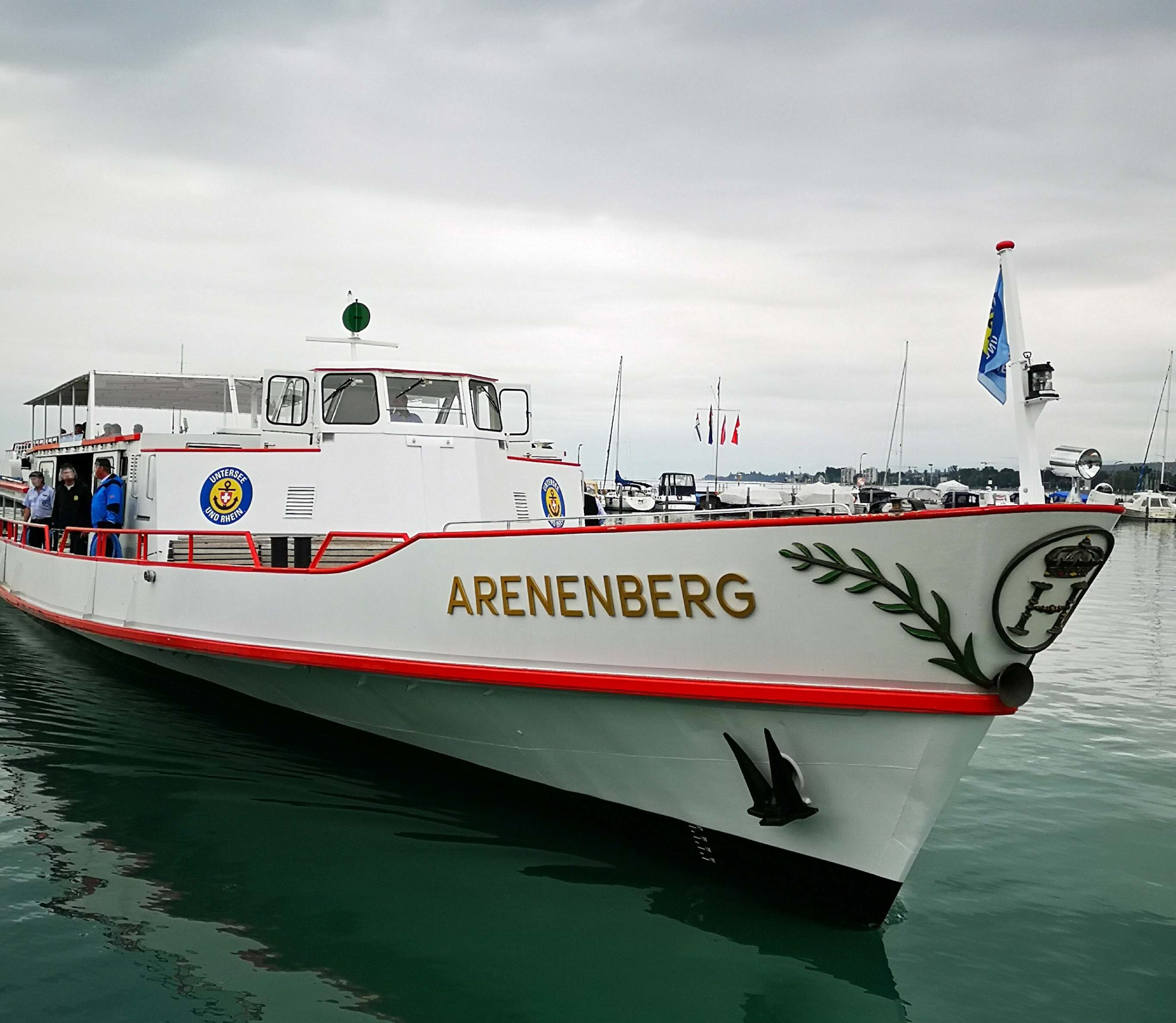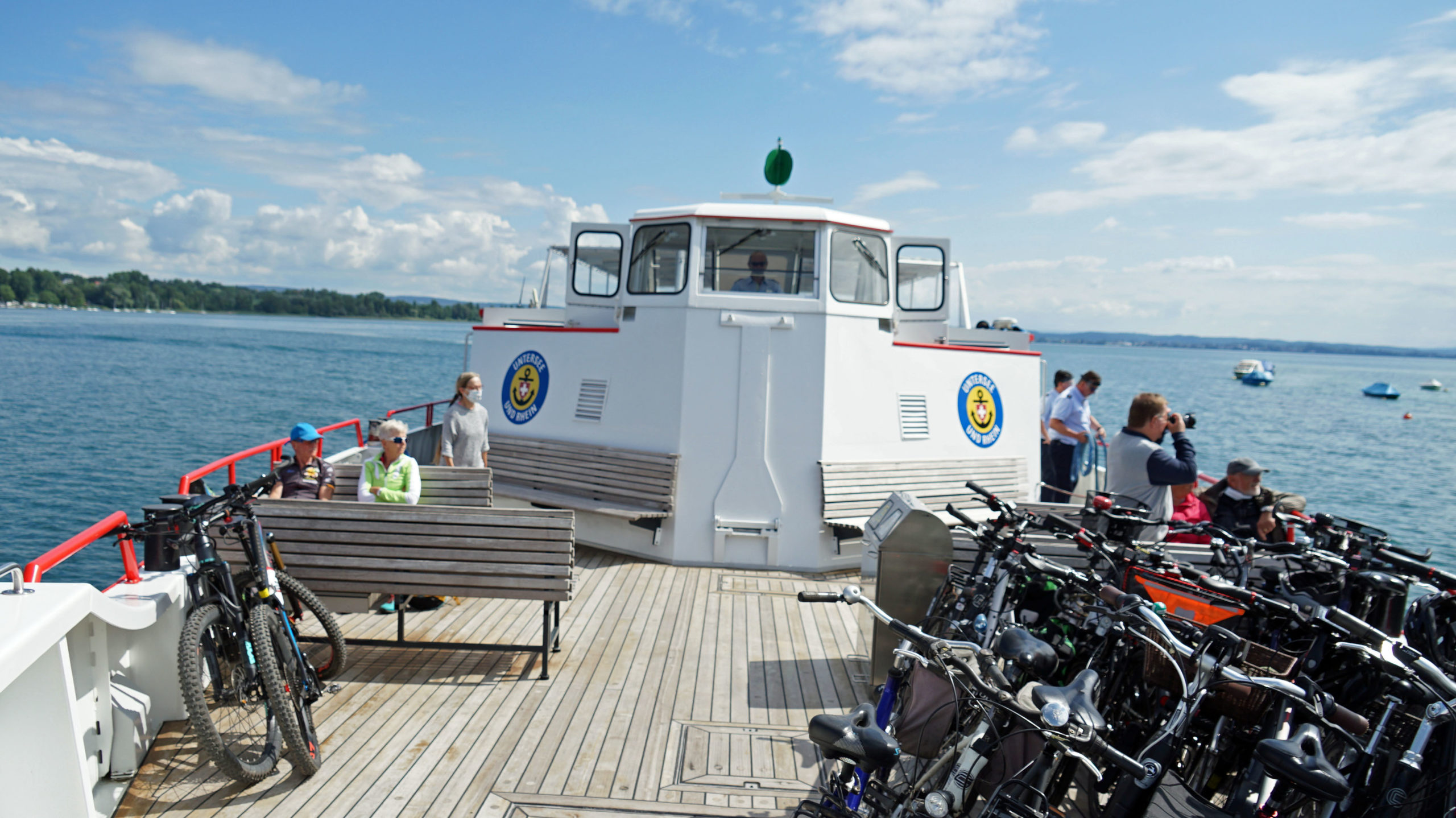 Das Wetter lässt nun doch sehr zu wünschen übrig. Am Schiffsanleger beginnt es sogar kurz zu regnen. Das Kursschiff ‚Untersee und Rhein‘, die „Arenenberg“, kommt pünktlich. Es herrscht Maskenpflicht an Bord, wird aber nicht so ganz beachtet. Unsere Räder werden professionell verstaut und los geht’s auf die dreieinhalbstündige Schiffstour. Und das Beste daran: heute ist der letzte Tag, an dem die Rädermitnahme kostenlos ist!! Das macht 15 € Ersparnis pro Person aus.