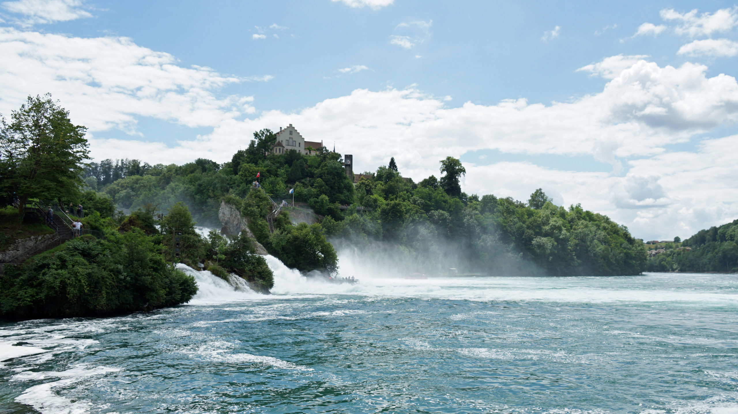 Wir starten jetzt den zweiten Teil unserer Tagestour. Die Räder kommen zum Einsatz. Es sind noch vier Kilometer zum Rheinfall in Neuhausen. Die Wassermassen des Hochrheins wälzen sich hier auf breiter Front über die Felsen hinab ins Wasserfallbecken am Schlössli Wörth. Der Rheinfall zählt zu den größten Natur-Sehenswürdigkeiten in der Bodensee-Region und ist der mächtigste Wasserfall Mitteleuropas mit einer Fallhöhe von 23 Metern. Auf einer Breite von 150 Metern gibt es hier einen Wasserdurchfluss von bis zu 700.000 Litern pro Sekunde. Ein imposantes Naturspektakel! Ich genieße dieses Schauspiel und fotografiere was das Zeug hält.