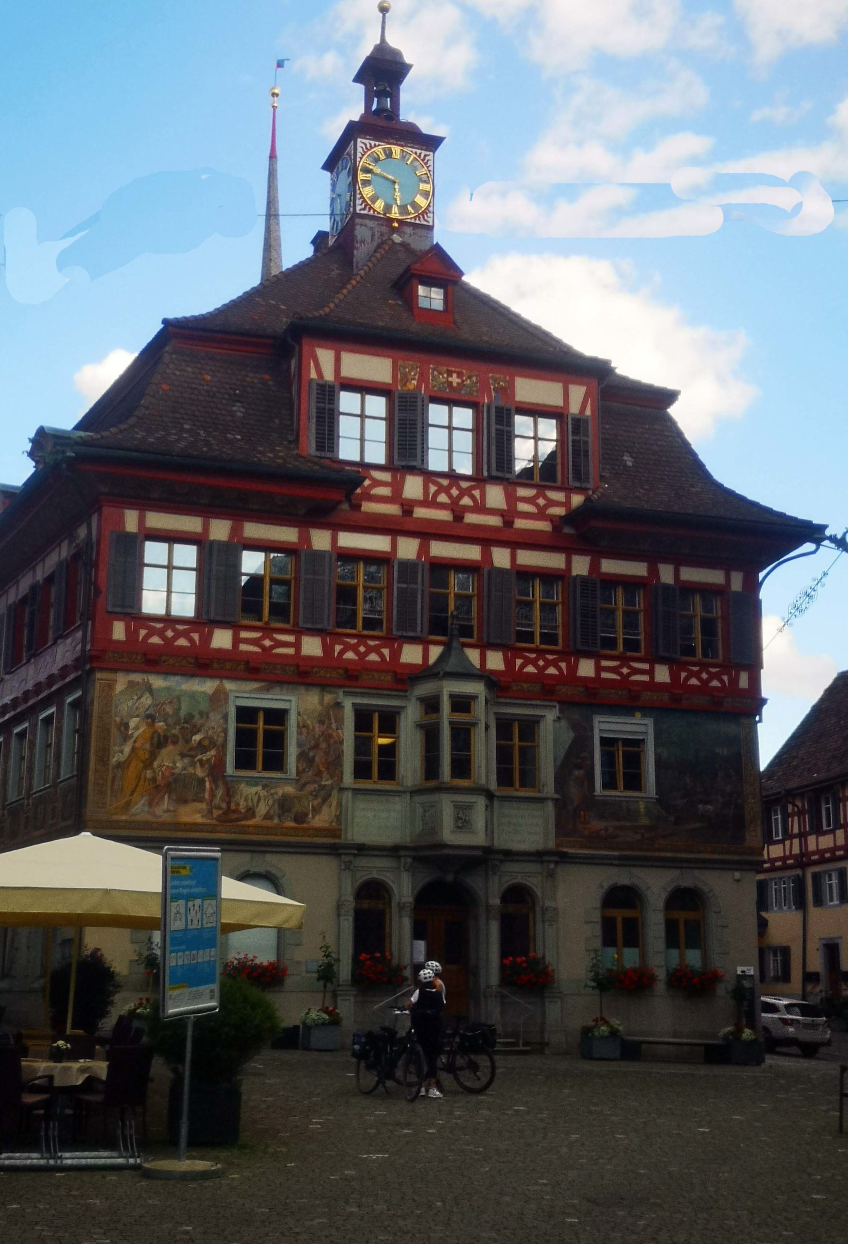 Nächster Stopp ist Stein am Rhein mit seinem tollen Rathausplatz. Für eine Besichtigung fehlt uns die Zeit. Hier fließt der Rhein wieder in den Bodensee. In Steckborn sehen wir malerische Fachwerkhäuser. Im nächsten Ort, in Ermatingen steht eines der ältesten Gasthäuser der Schweiz. Und er ist außerdem ziemlich berühmt, denn Napolion III hat hier übernachtet. Und