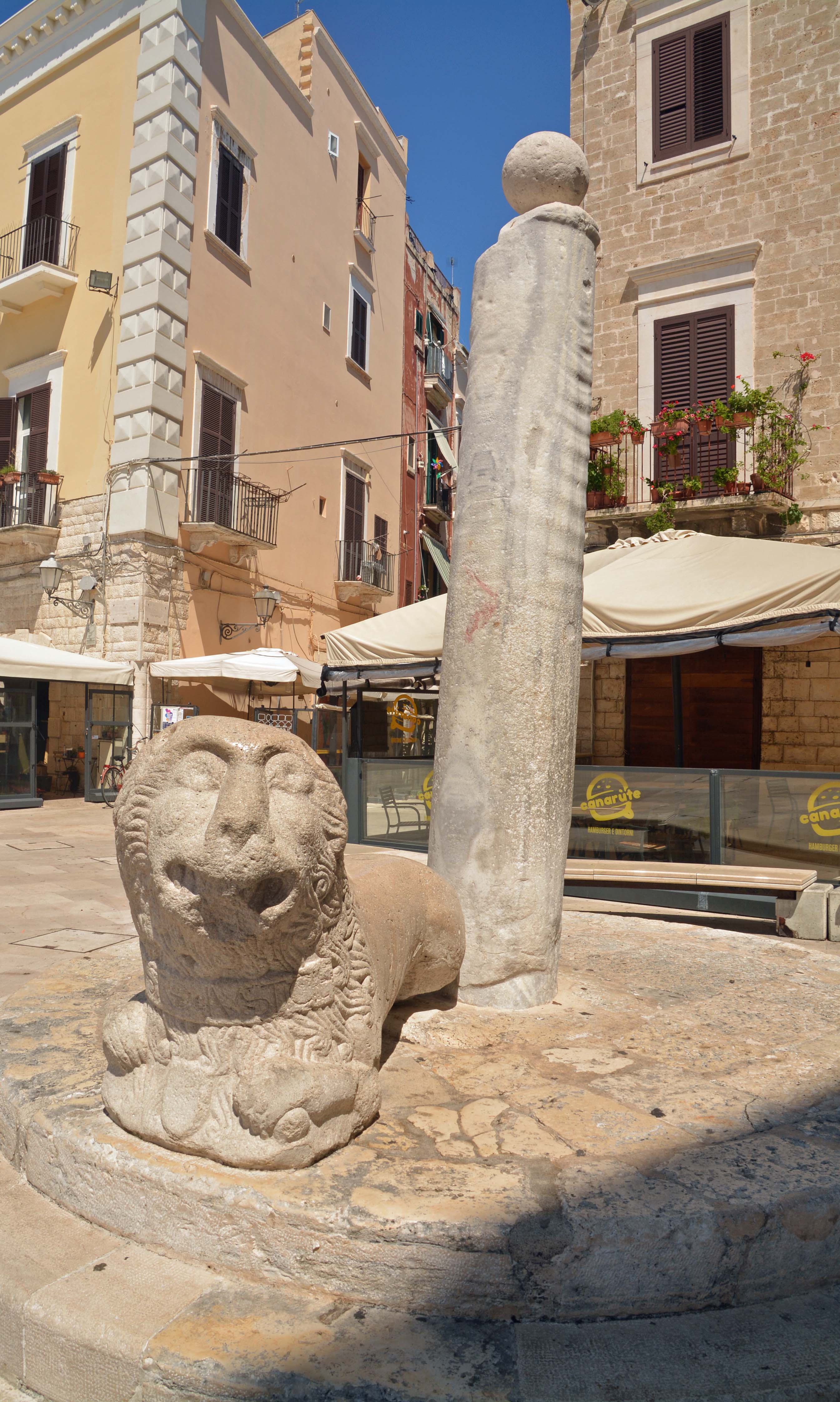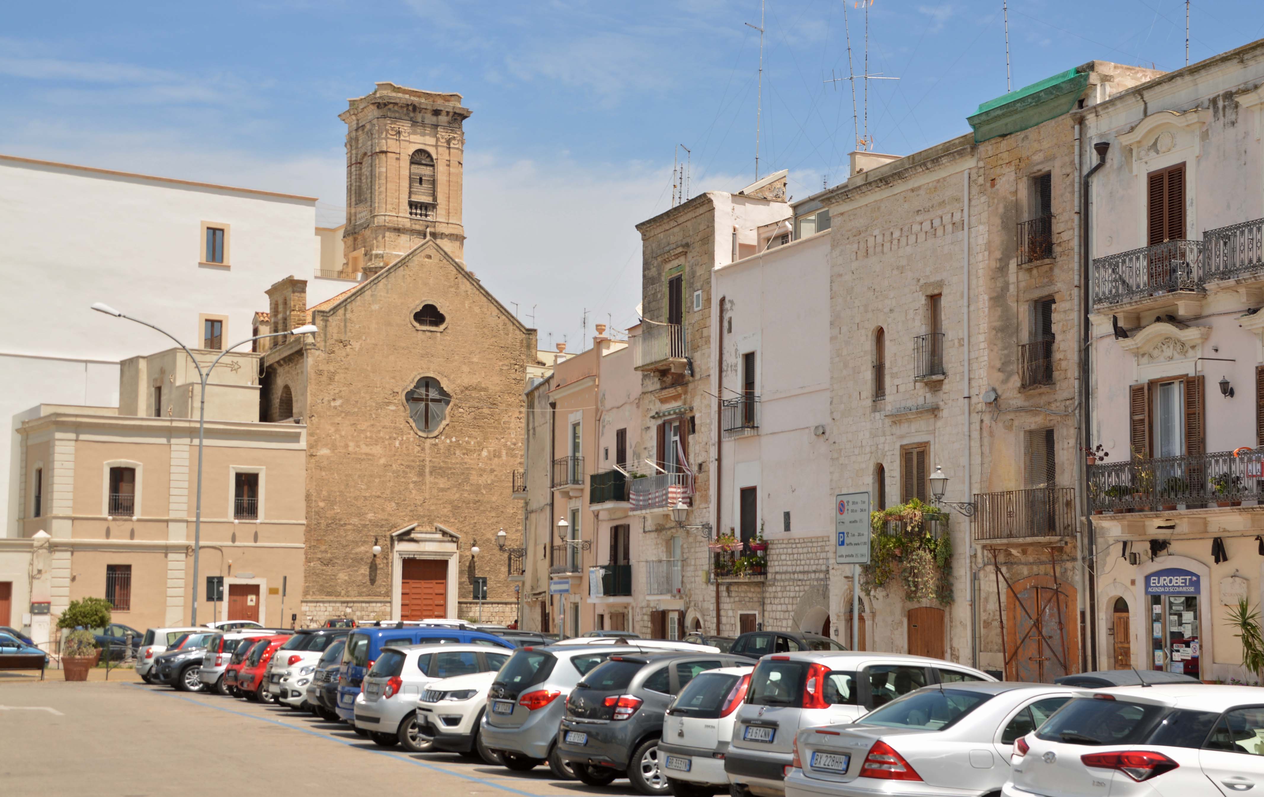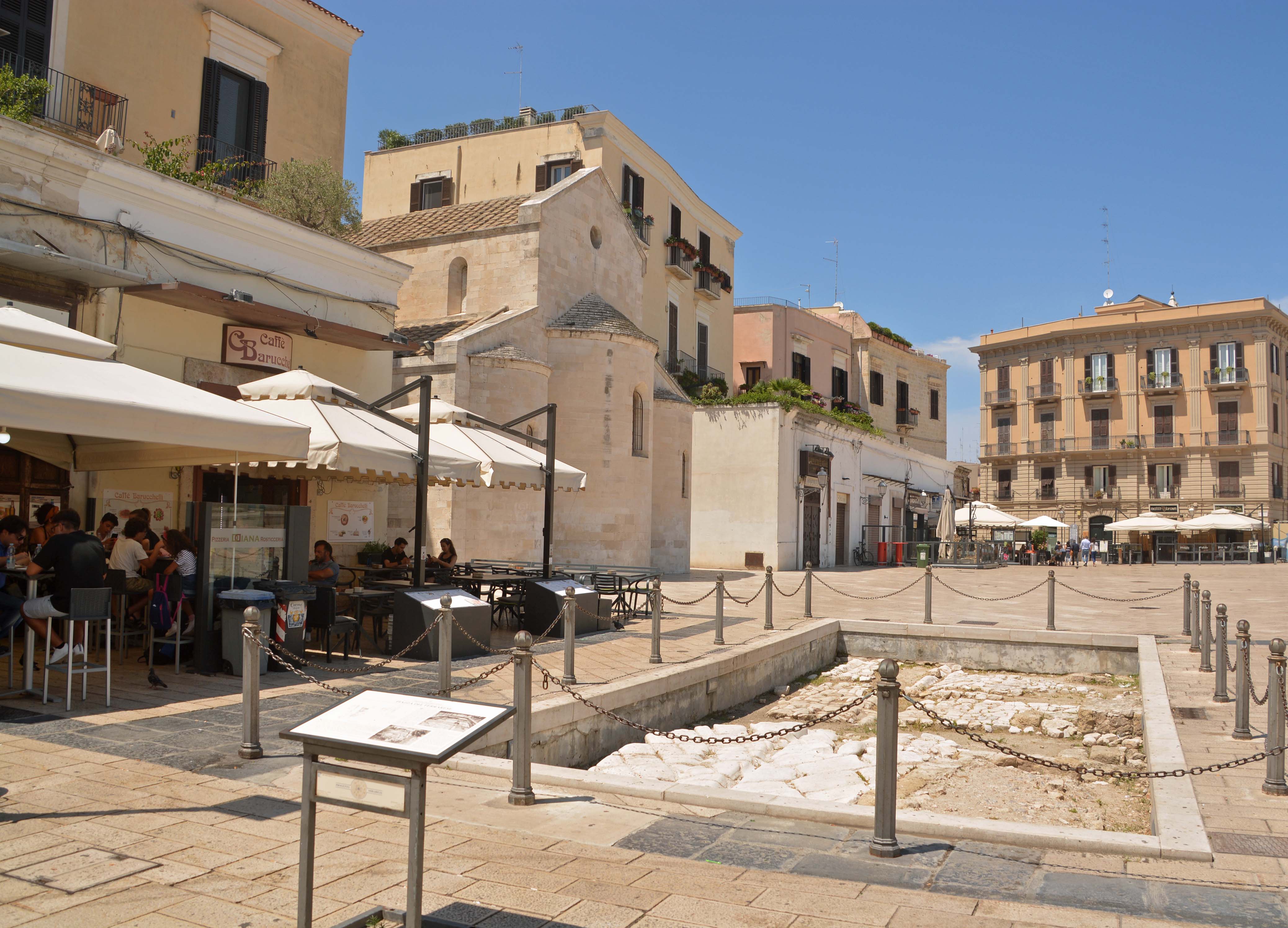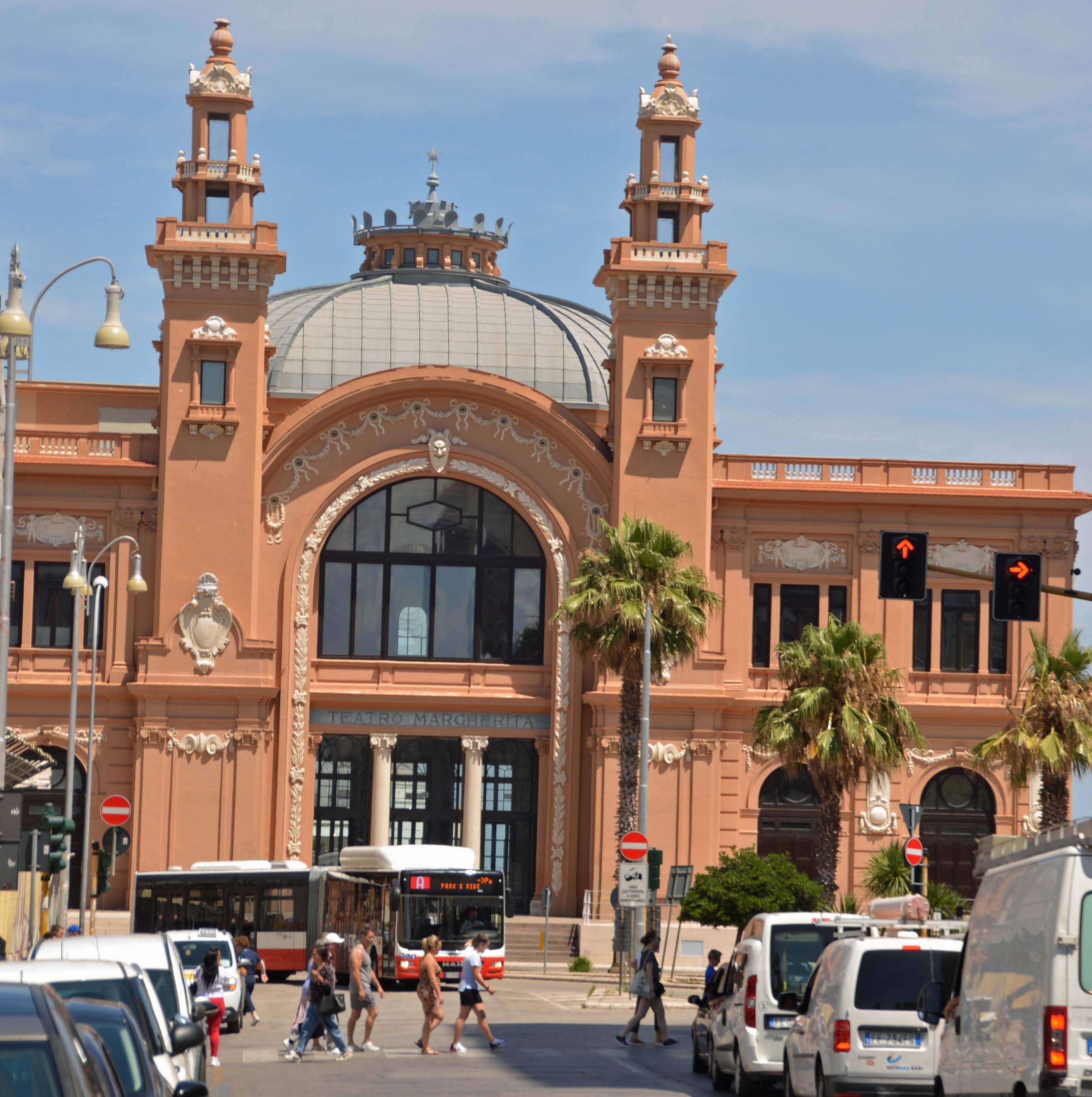 Ich komme auf meinem Rundgang zum Corso Vottorio Emanuelle II, der die Alt- von der Neustadt trennt, also auch arm von reich. Genau hier steht das  leuchtend rote Teatro Margherita. Ich komme über die Piazza del Ferrarese auf die Piazza Mercantile. Beide Plätze sind hipp und voller Lokalitäten. Bei ‚Il Sedile‘ mache ich Siesta, trinke ein großes Dunkles und esse meine Leibspeise: Parmeggiano alla Melanzane und zum Abschluss gibt’s noch einen cafè. Über die alte Stadtmauer mache ich mich auf den Rückweg zur Basilica. Hab noch ein paar Minuten Zeit, genieße nochmal die Gässchen und zahlreichen Kirchen und rufe dann Antonio an.