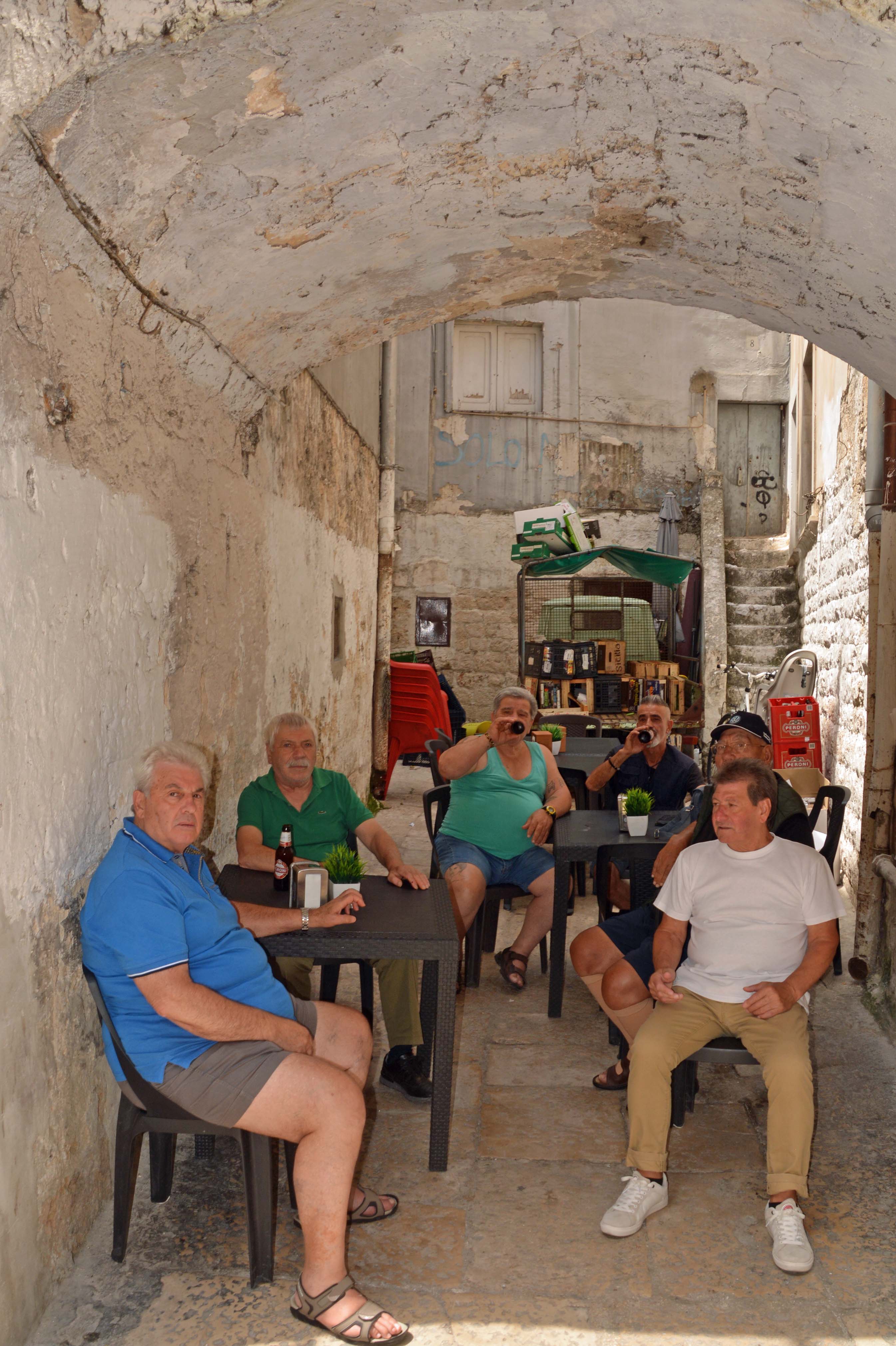 Die Cattedrale San Sabino ist nur wenige Schritte entfernt und das Leben in den schmalen Gässchen pulsiert. Kinder spielen, Touris kaufen Krimskrams, die Hausfrauen Obst und Gemüse, die Männer sitzen in ihren Plastikstühlen, nur die Nudelmacherinnen machen Siesta. Schade.