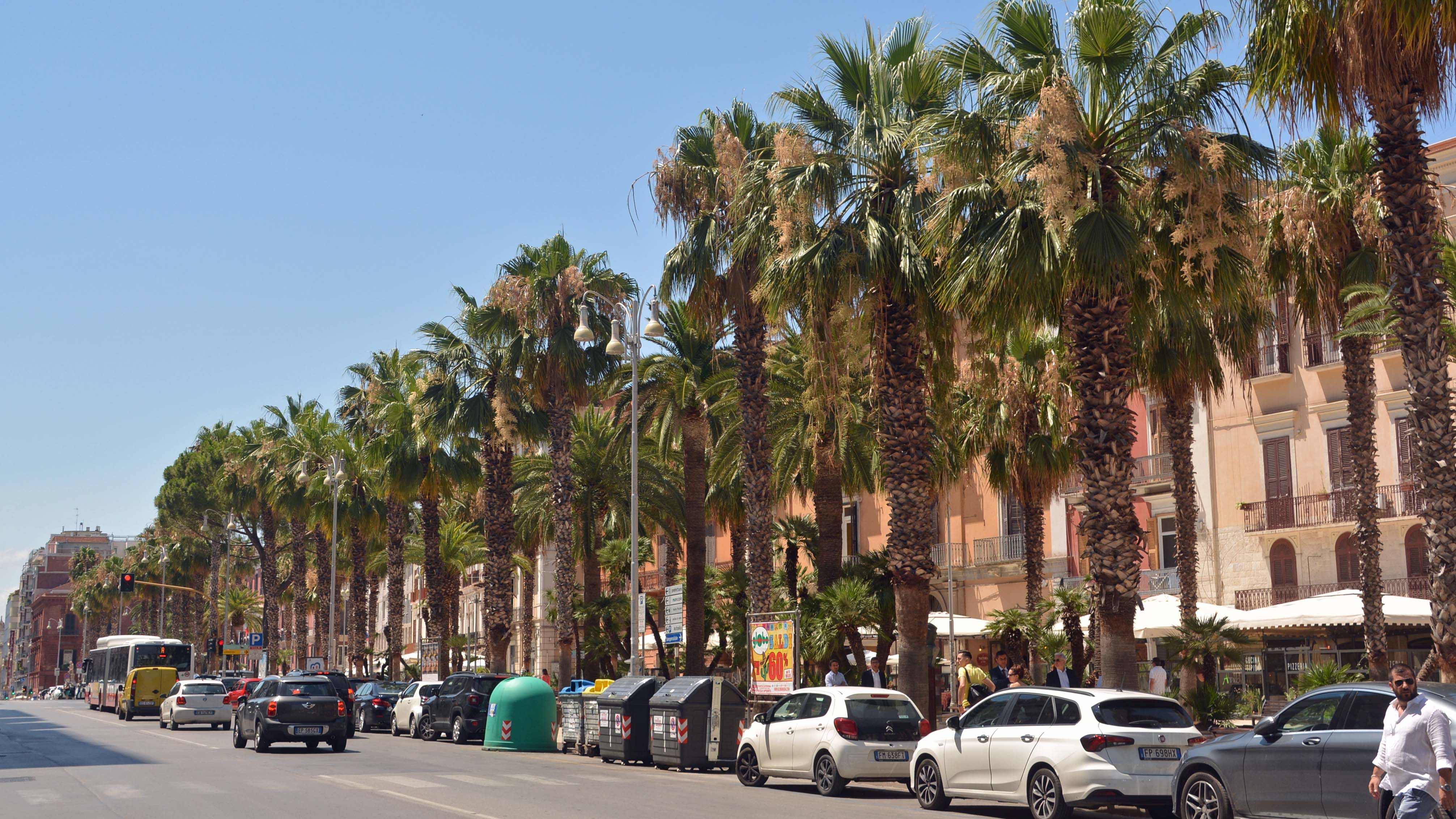 Es ist warm draußen, mehr Sonne als Wolken. Das richtige Wetter, um die Hauptstadt Apuliens, BARI, zu entdecken. Vom Bäckerwagen kaufe ich zwei Cornetti con crema und ein Brot, Weißmehl natürlich, dafür aber knusprig. Mal sehen, wie der Teig sich morgen entwickelt hat! Vor dem Frühstück lade ich für den Blog noch die gestrigen Bilder hoch. Dazu muss ich  direkt an den Ingresso. Hier kommt man perfekt ‚rein‘ ins Netz. Mein ‚Aufpasser entdeckt mich sofort, und öffnet extra einen Sonnenschirm für mich. Dann frühstücke ich gemütlich, zahle und frage nach Parkplätzen in Bari. ‚Parken sie auf keinen Fall am Lungomare, nur auf einem bewachten Platz und tragen sie ihren Rucksack vorne, Madame‘, sagt er mit fester Stimme. ‚Nehmen sie doch lieber den Bus von hier, das Womo können sie gerne kostenlos stehen lassen‘. Tolles Angebot. Ich überlege scharf. Da ich aber in die Kulturhauptstadt 2019, MATERA, fahren möchte, wage ich es und fahre mit Fiete II los.