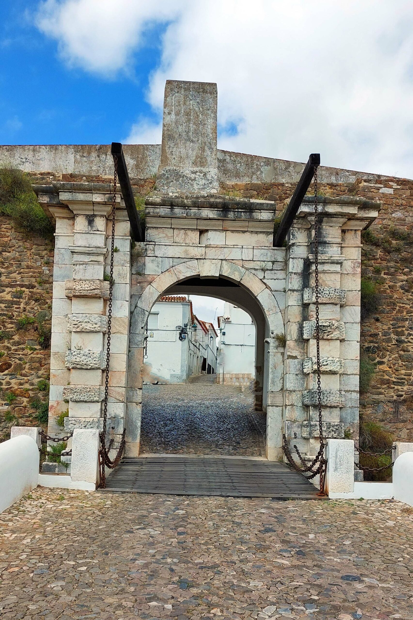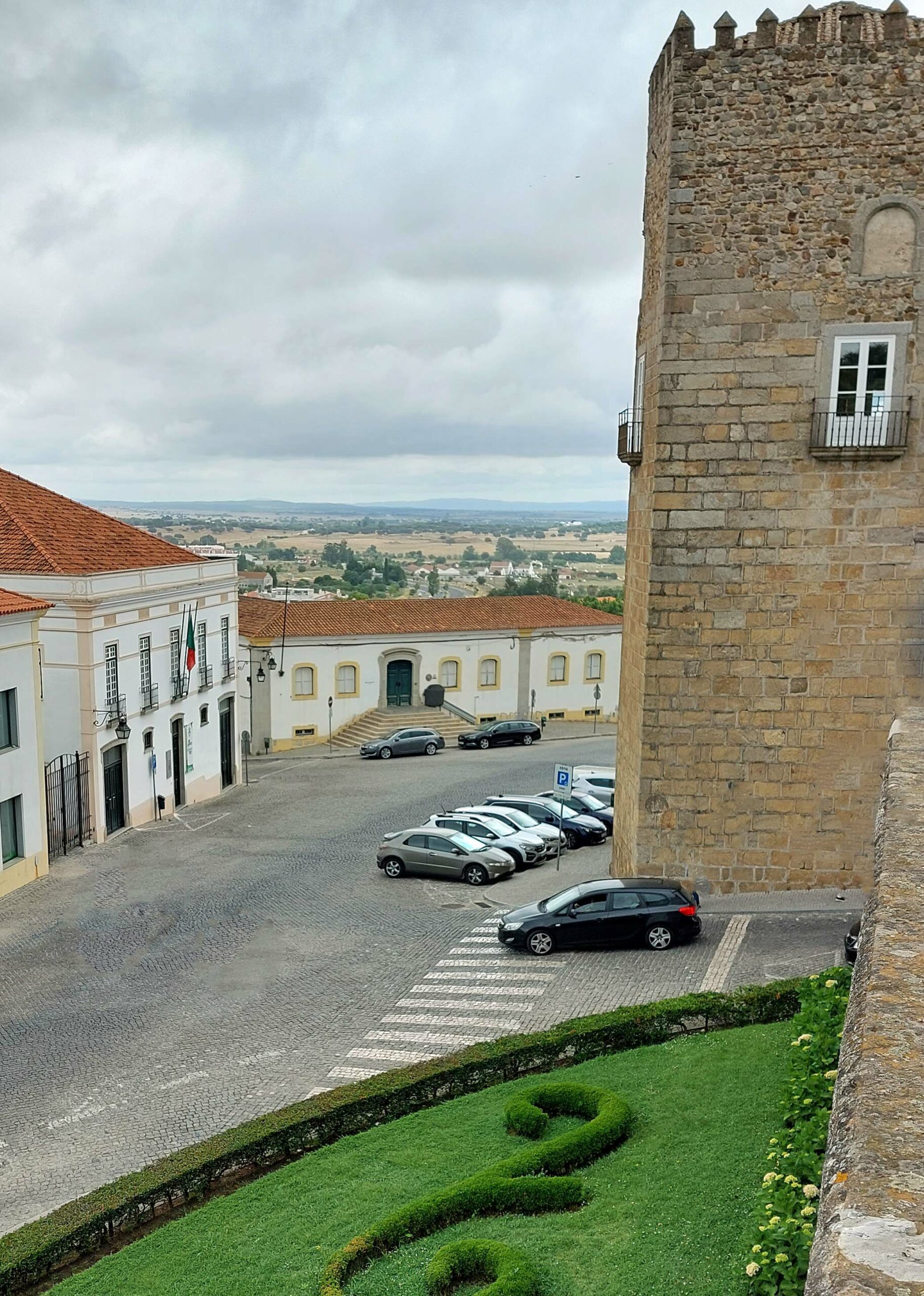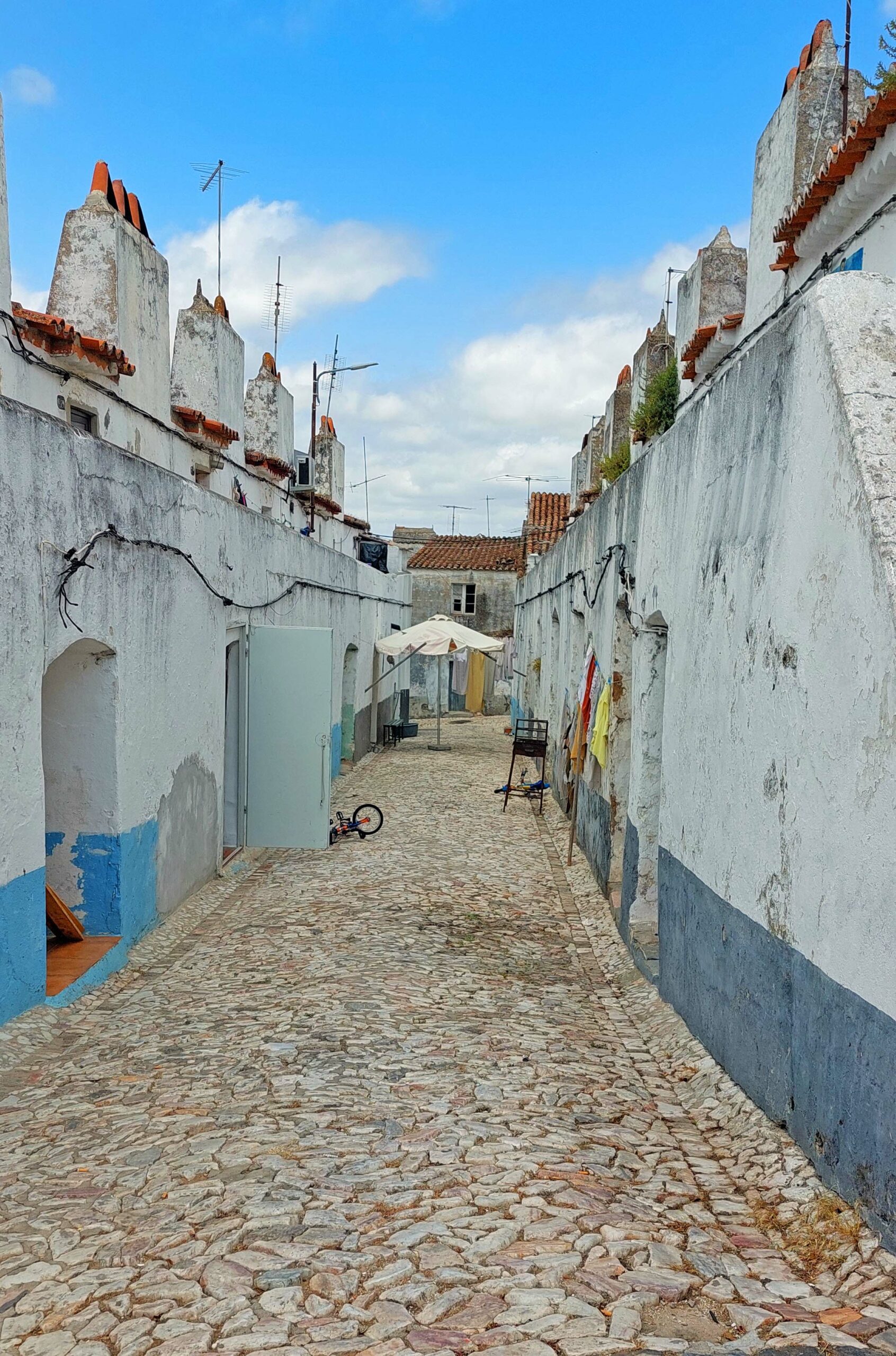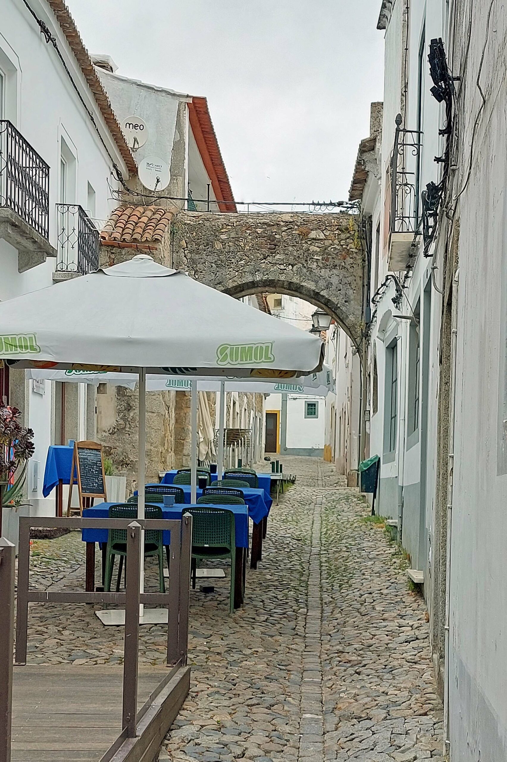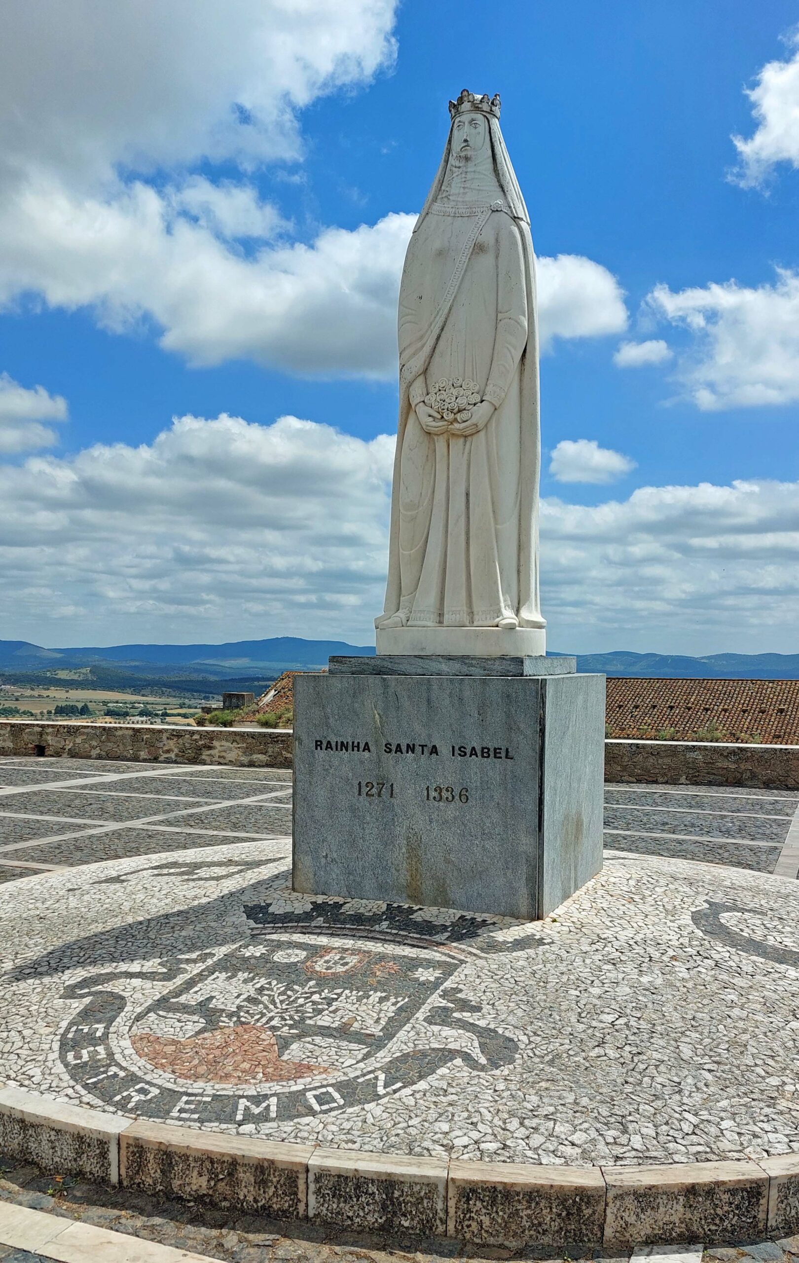 Ich parke direkt unterhalb der Altstadt vor einer Zugbrücke und laufe durch ein Stadttor in die ummauerte Stadt. Es ist kaum etwas los hier, alles ist friedlich und betulich. Ich steige die Gassen hoch bis zum Schloss mit dem von Zinnen umgebenen Marmorturm „Torre de Menagem“.1698 wurde er durch eine Explosion zerstört und später wieder aufgebaut. Das Schloss ist heute ein exklusives Hotel. Auf dem Platz steht ein marmornes Denkmal und erinnert an die 1336 verstorbene, sehr beliebte Königin Isabella.