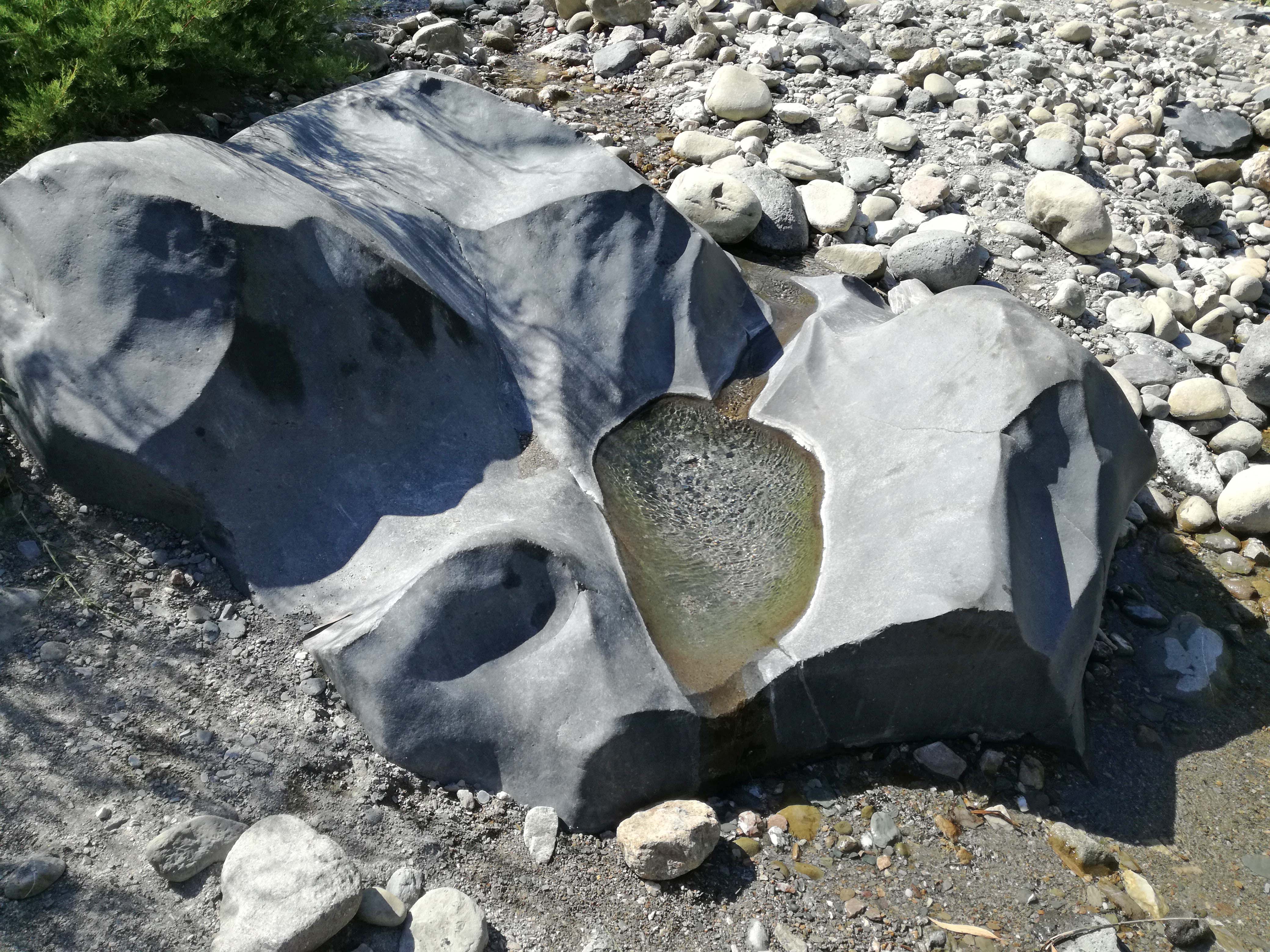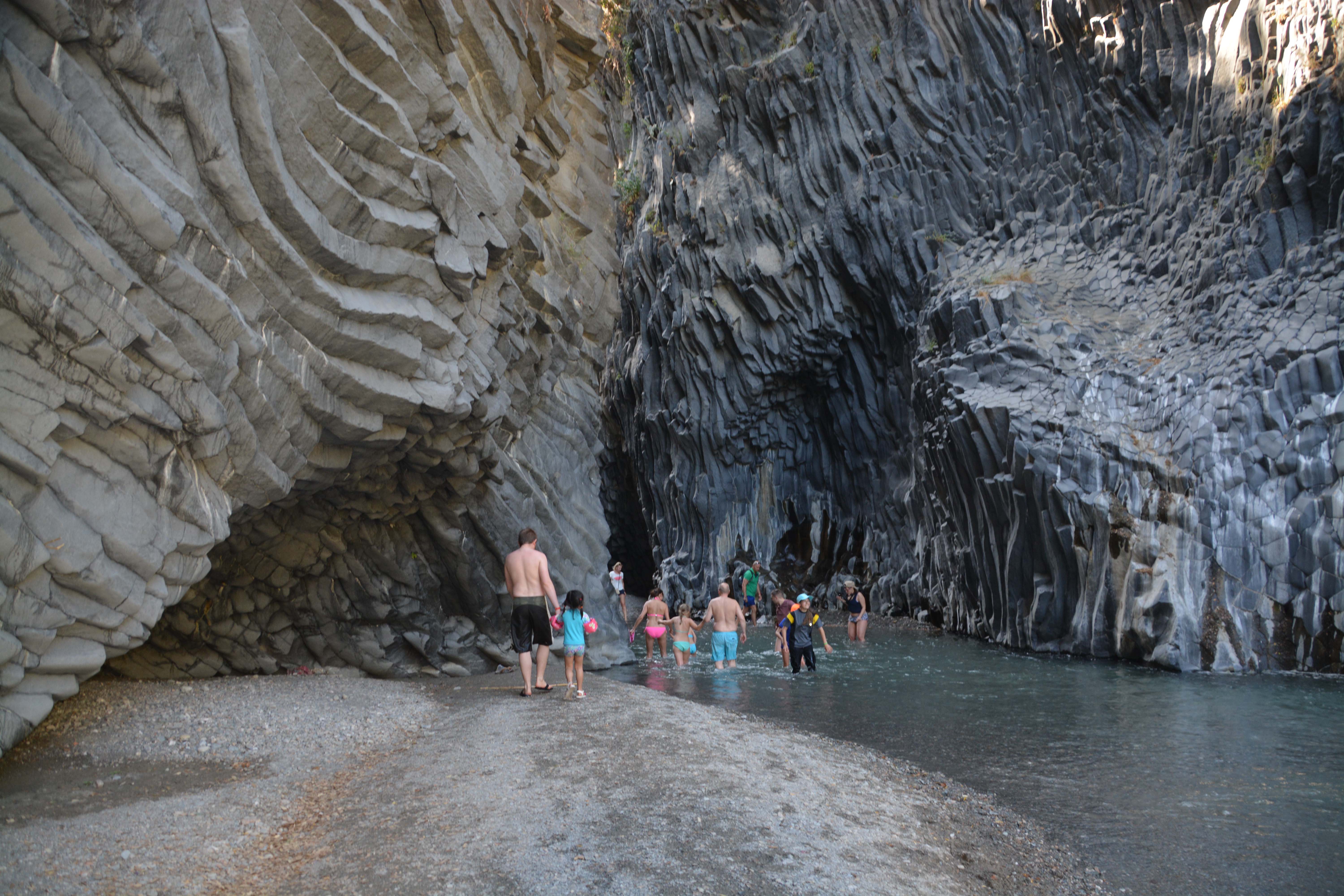 Wir erreichen die wildromatische Basaltschlucht Gole dell‘ Alcantara, deren Entstehung auf einen Vulkanausbruch 2400 v. Chr. zurückgeht. Wir parken Fiete bewacht gegen eine 5 € Spende. Wir können hier mit dem Aufzug hinunter in die Schlucht sausen oder aber eine öffentliche Treppe benutzen. Die ist aber nicht mehr öffentlich und kostet jetzt je 2 € Benutzungsgebühr. Dafür gelangen wir sehr bequem auf dem touristisch ausgebauten Weg hinunter in die Schlucht. Wow, ich sehe zum ersten Mal Säulenlava, die sich entlang der Basaltwände gebildet hat. Sie entstand vor einigen tausend Jahren, als das Flussbett durch einen Lavastrom des vulkanischen Schlackekegels bei Mojo Alcantara blockiert wird. Da die Lava durch Wasser sehr schnell abgekühlt, nahm sie beim Erstarren eine besondere Form an. Und die nennt man Säulenlava, die Säulenlava.