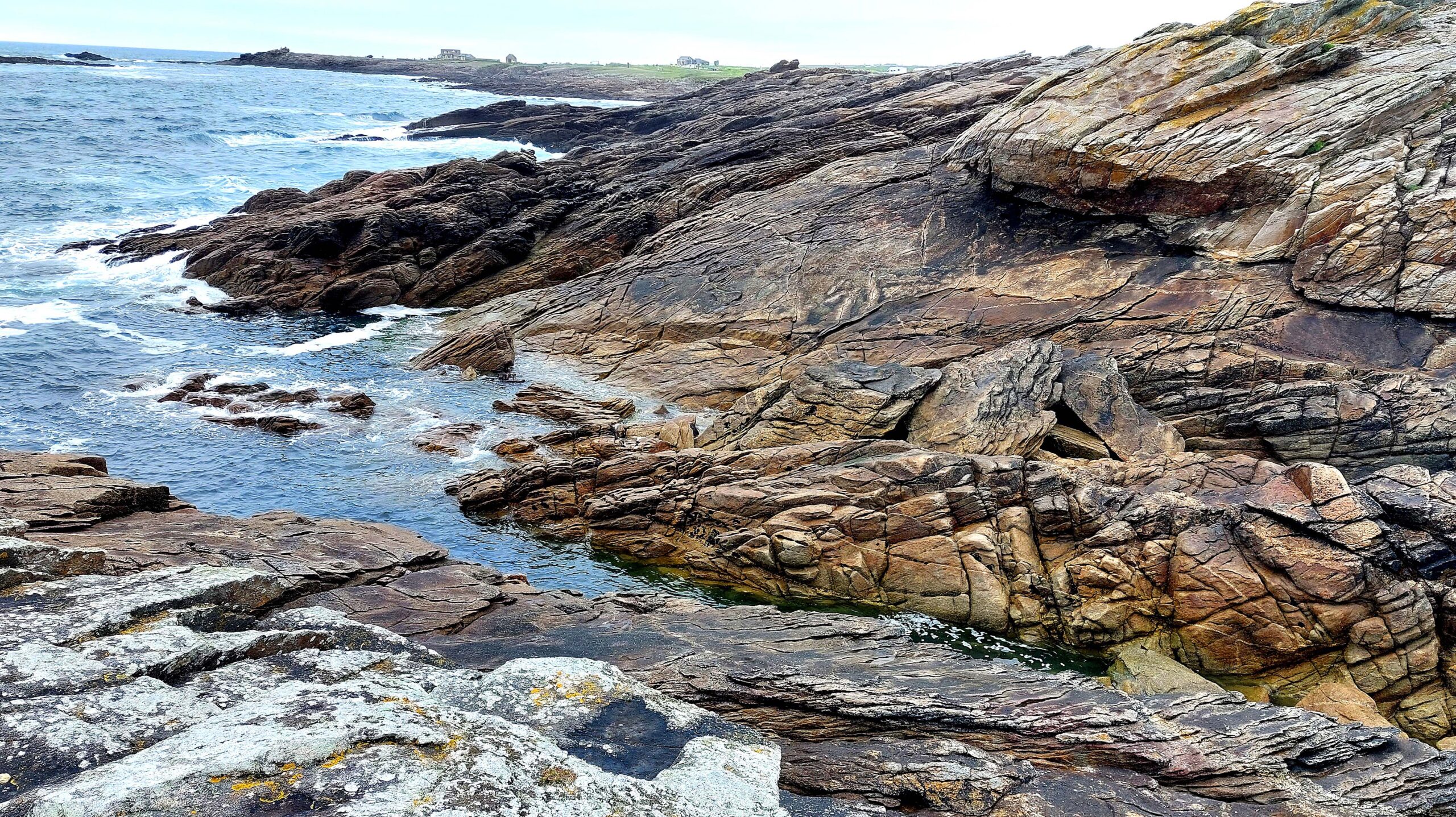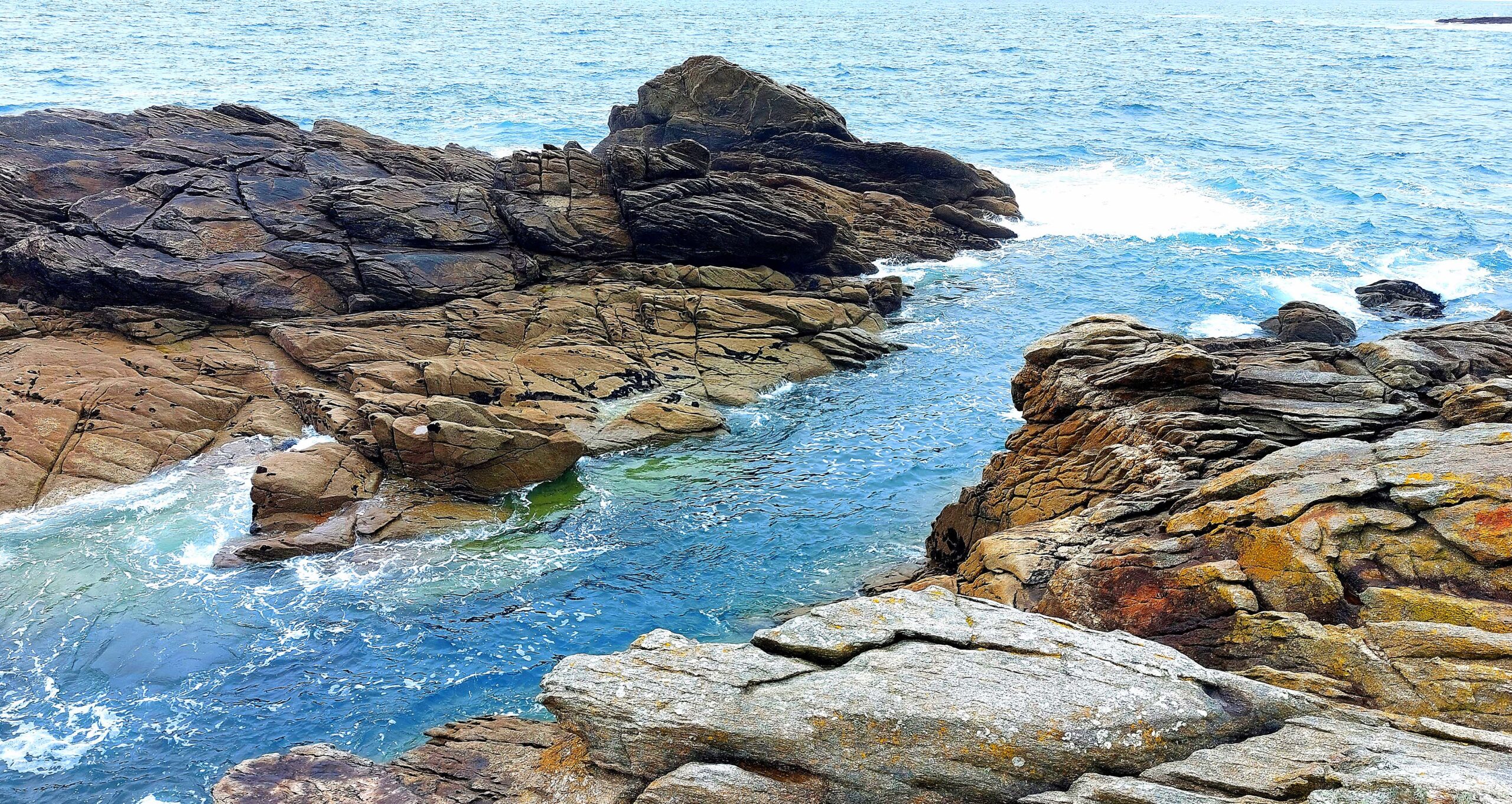 Der letzte Punkt auf meiner Besichtigungsliste ist die Insel Ouiberon mit ihrer wild zerklüfteten Küste an der Inselspitze. Der Verkehr schlängelt sich 8 Kilometer sehr langsam über eine lange Straße mit zahlreichen Kreiseln bis zum Norden der Insel. Das dauert. Geduld ist gefragt. Im gleichnamigen Städtchen haben sich alle versammelt, die einen Parkplatz ergattert haben. Denn die sind absolute Mangelware. Madame Google nervt, ich schalte sie aus und fahre nach Instinkt. Dabei gelange ich automatisch an die zerklüftete Felsküste Cote Sauvage. Irre Ansammlung von Felsen. Einfach nur Dastehen und den Ausblick auf das unruhige Meer genießen und den Wind in den Haaren spüren.