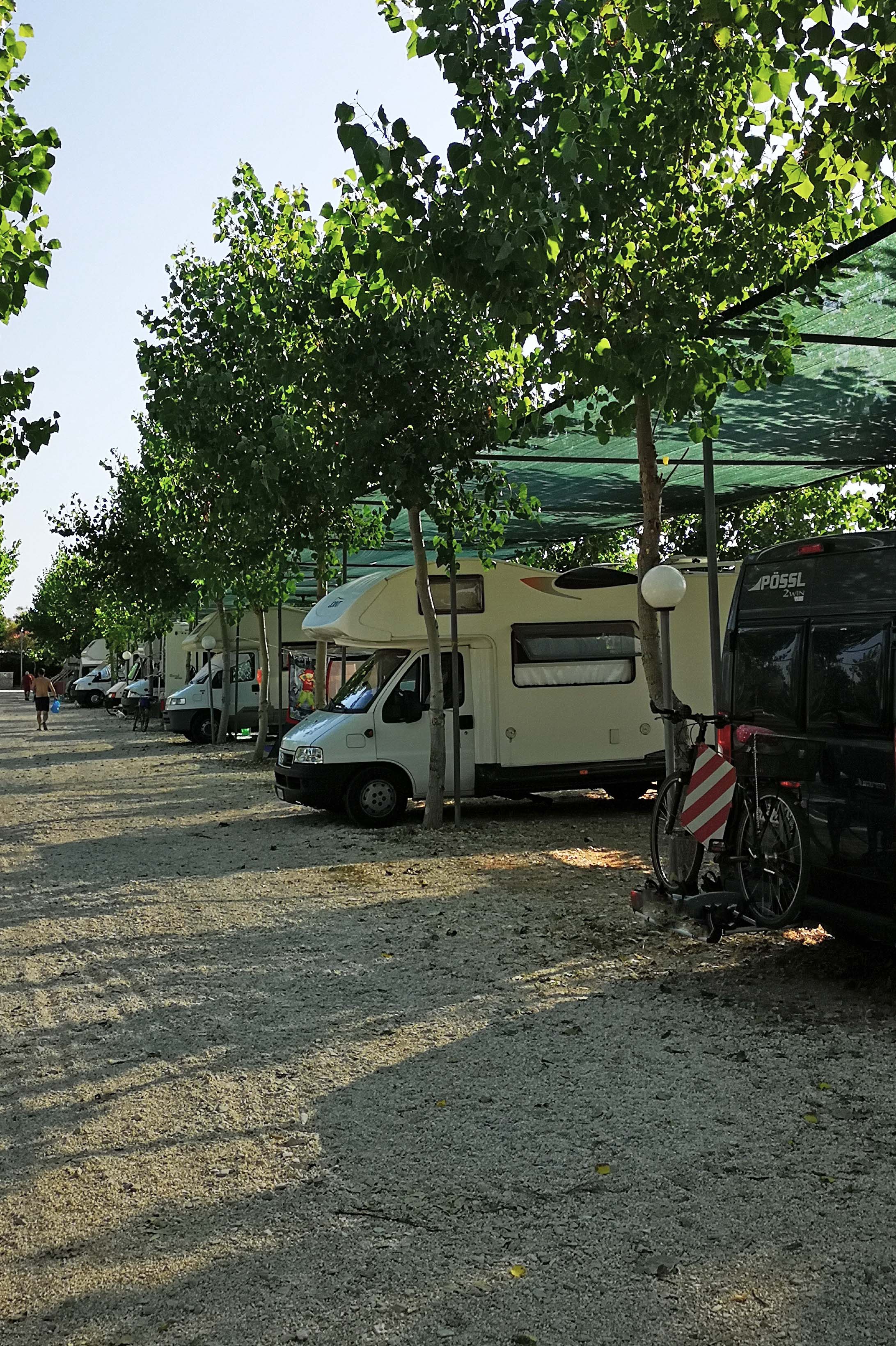 Es ist strahlend blauer Himmel, kein Wölkchen zu sehen und sehr warm. Die Over-Night-Stopper müssen um 9:00 Uhr abreisen. Ich – und by-the-way zwei weitere italienische Wohnmobile – schaffe es nicht ganz. Habe mich an die italienische Langsamkeit sehr gut angepasst.