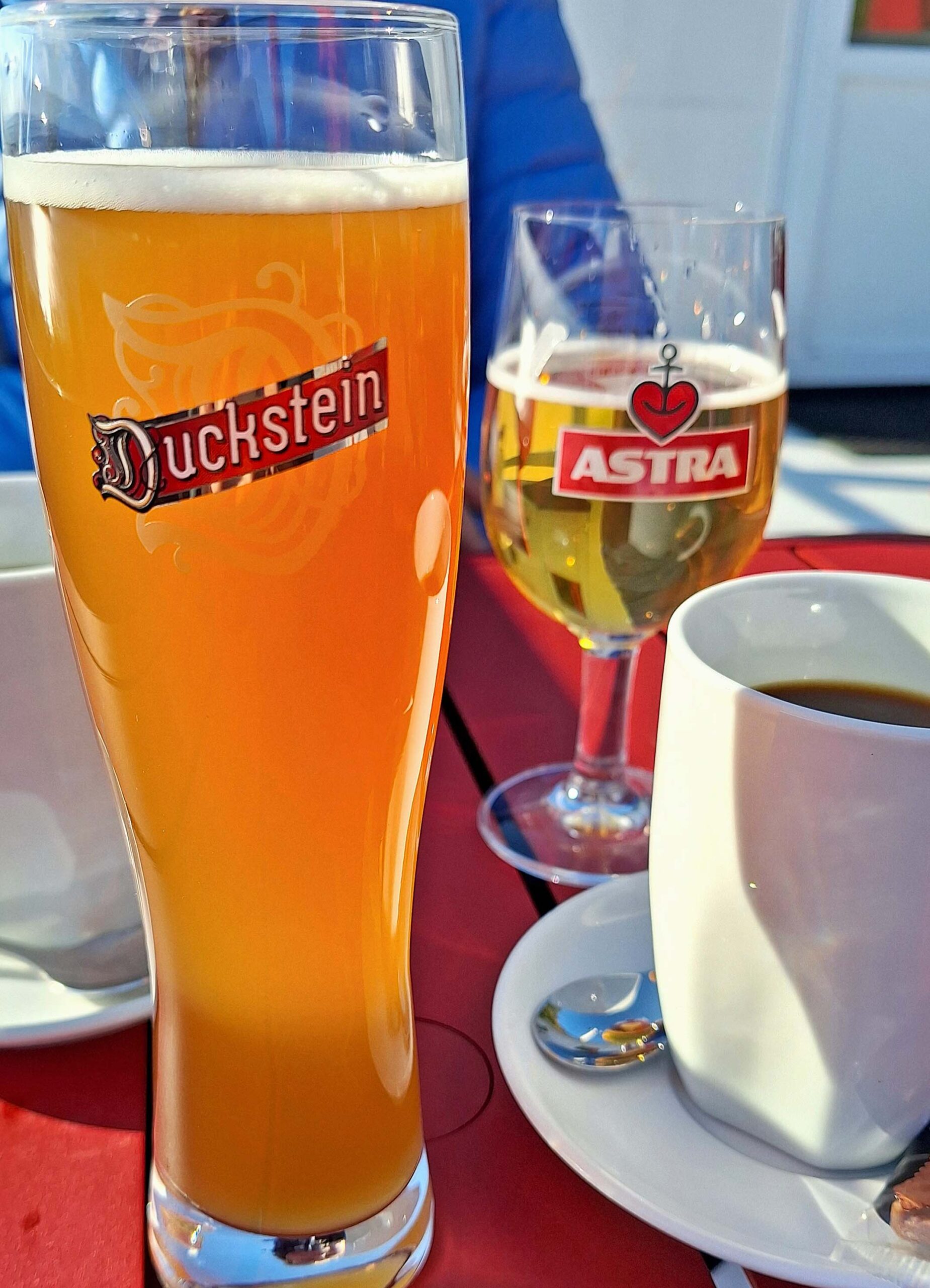Der Bus spuckt uns direkt neben der Strandtreppe aus, die unmittelbar zum Elbufer führt. Wir steigen die 170 Stufen hinab, vorbei an ehemaligen Fischerhäusern und reetgedeckten Fachwerkgebäuden mit liebevoll gestalteten klitzekleinen Vorgärten. „Das hat etwas von Kleingartencharakter“ schießt es mir spontan in den Kopf. Wir laufen den Strandweg entlang bis zu einem kleinen Aussichtsturm. Hier haben wir eine phänomenale Aussicht auf Elbe, Hafen, den Hausberg und den vierthöchsten Leuchtturm Deutschlands. In einem kleinen Segelclub schlabbern wir auf der Sonnenterrasse Kaffee und Duckstein-Bier! 🍺 ☕Das Leben kann soooo schön sein! Wir genießen diesen Augenblick der gelassenen Lebensfreude!