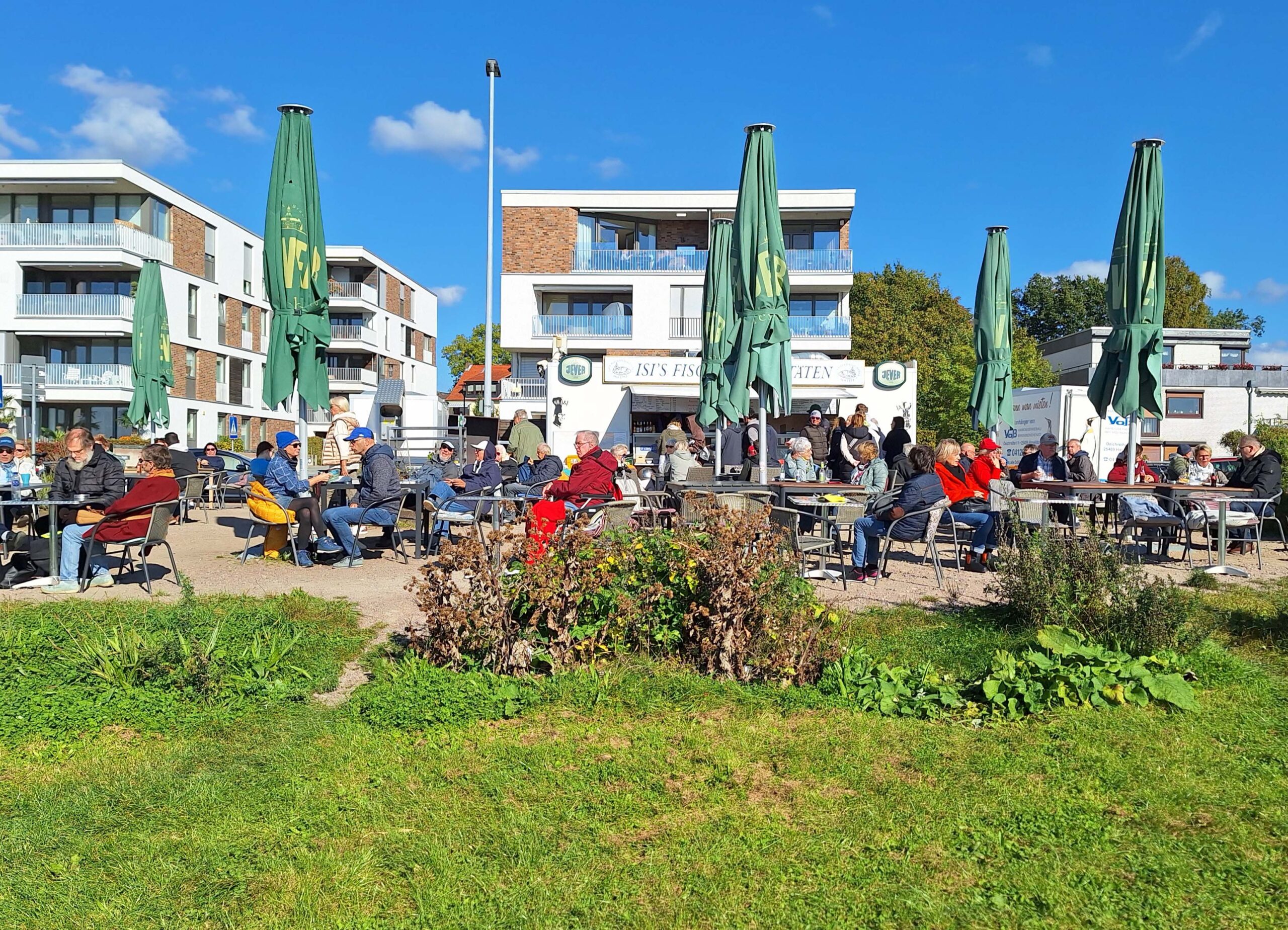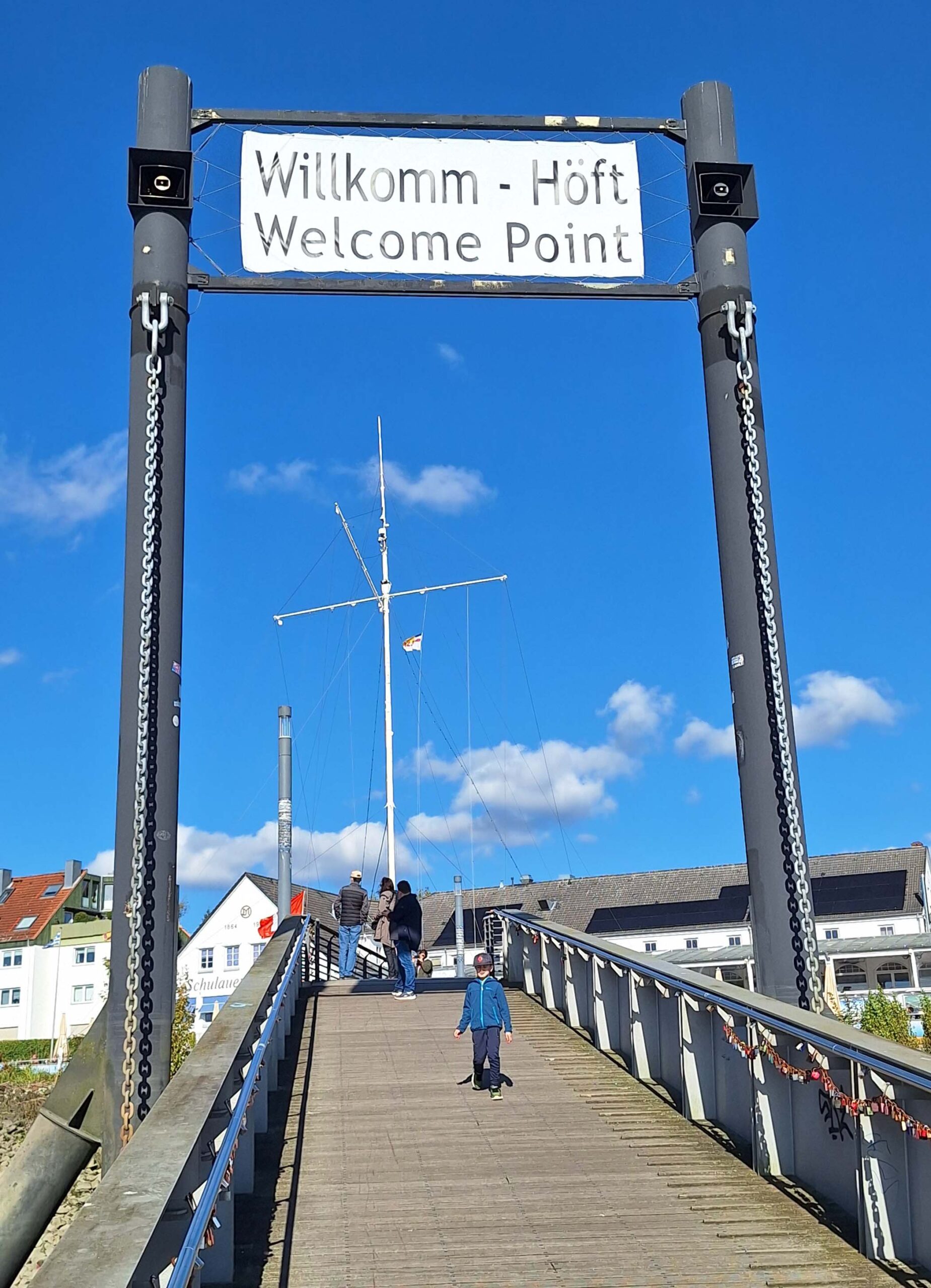 Wir erreichen unser Ziel nach einem kurzen Fußmarsch. Weil wir Fischhunger haben, steuern wir auf die besonders von Bikern gehypte Isis‘s Fischbude zu. 🐟🐠🐡 Unseren frischen Fisch genießen wir in der ersten Stuhlreihe mit direktem Blick auf die Elbe. Jetzt könnte mal endlich ein Schiff kommen. Tut’s aber nicht. Nada, keins ist im Anmarsch. Mit uns warten auf den umliegenden Bänken weitere Neugierige auf das Begrüßungsspektakel.