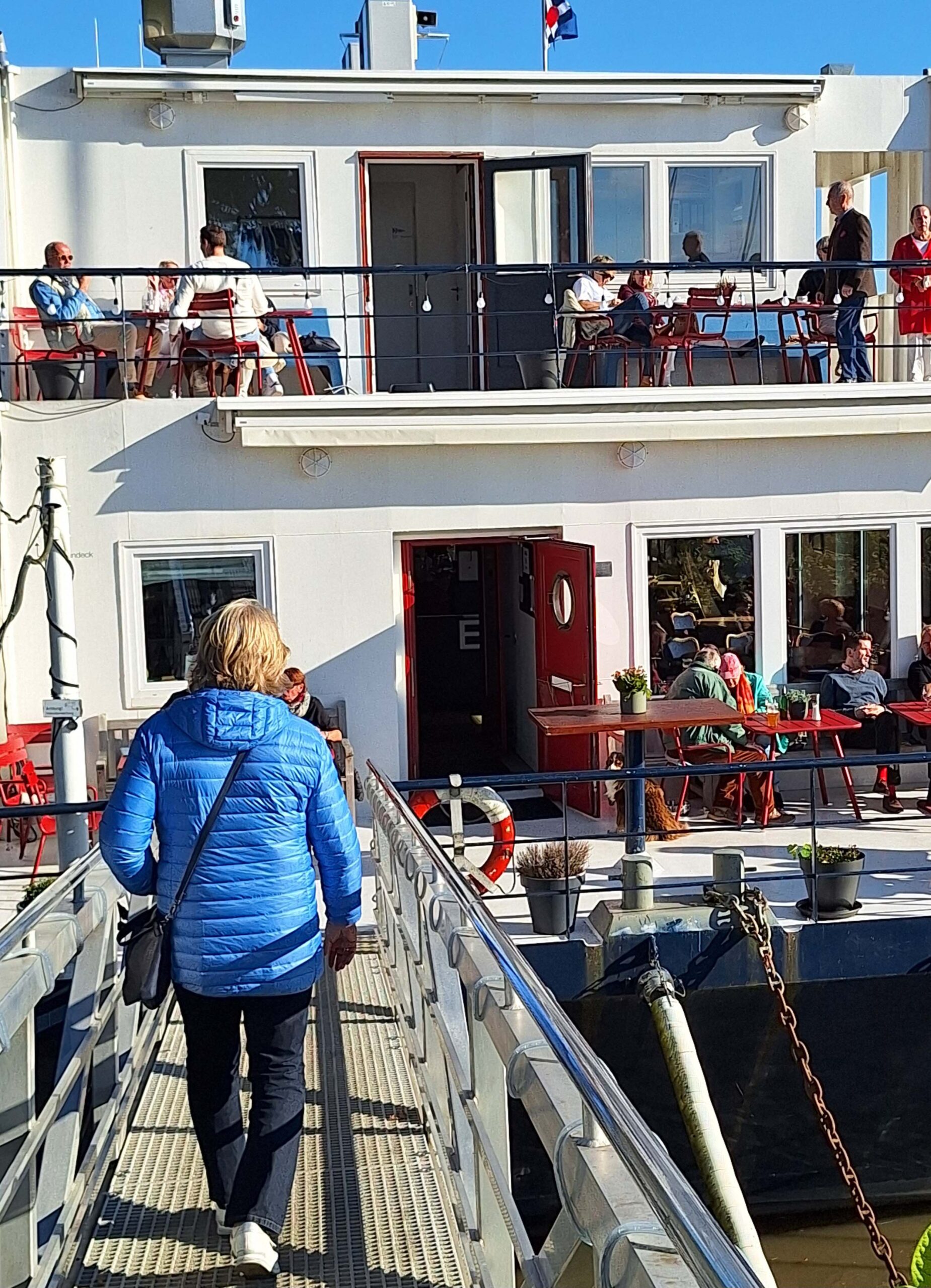 Ich nutze deshalb die Wartezeit und verschwinde im nahegelegenen Restaurant, finde die Begrüßungskajüte und verwickle Captain Adler in ein Gespräch. Er versichert mir, dass in wenigen Minuten zwei dicke Pötte erwartet werden. Er habe deshalb jetzt zu tun, unterbricht das Gespräch und wendet sich geschäftig seinen Aufgaben zu. Wieder draußen werde ich von Karen schon winkend und lachend empfangen! „Du hast gerade eine Willkommensaktion versäumt!“ Das nenne ich mal einen verdammt blöden Zufall! 🙈