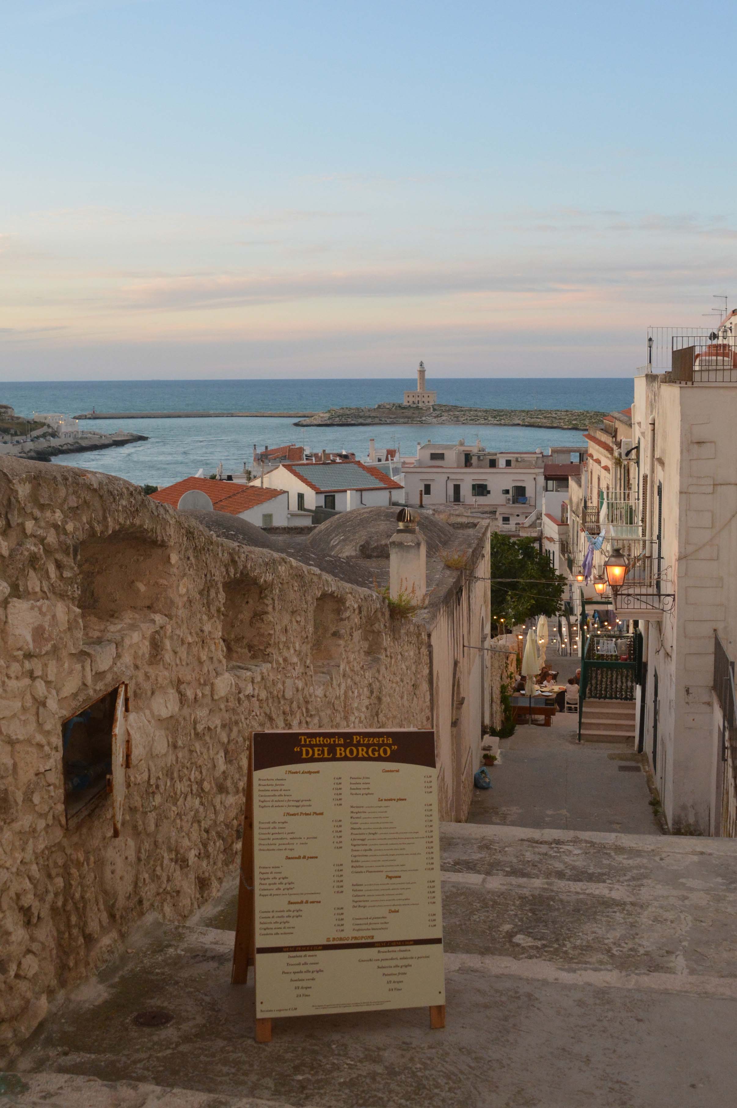 Vieste ist ein uraltes, auf einer Felszunge gelegenes Hafenstädtchen mit unzähligen verwinkelten Gassen, Treppen ohne Ende, einem Castello und einer Basilica. Es ist Zentrum des Garganotourismus. Ich schlabbere ein vorzügliches Eis und schlendere mit hunderten Anderer durch die Sträßchen. Überall wird gegessen, geredet und Wein getrunken. Außerdem kann heute Abend Wein probiert werden.