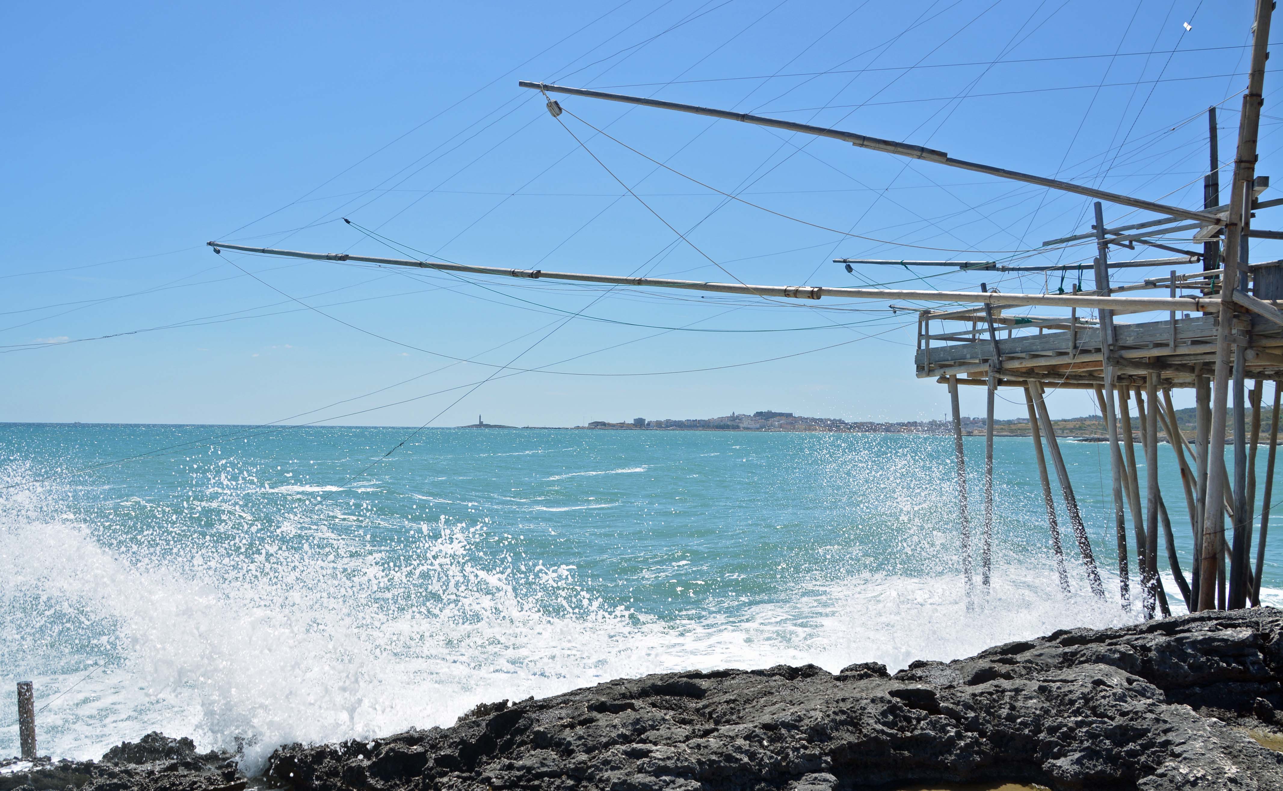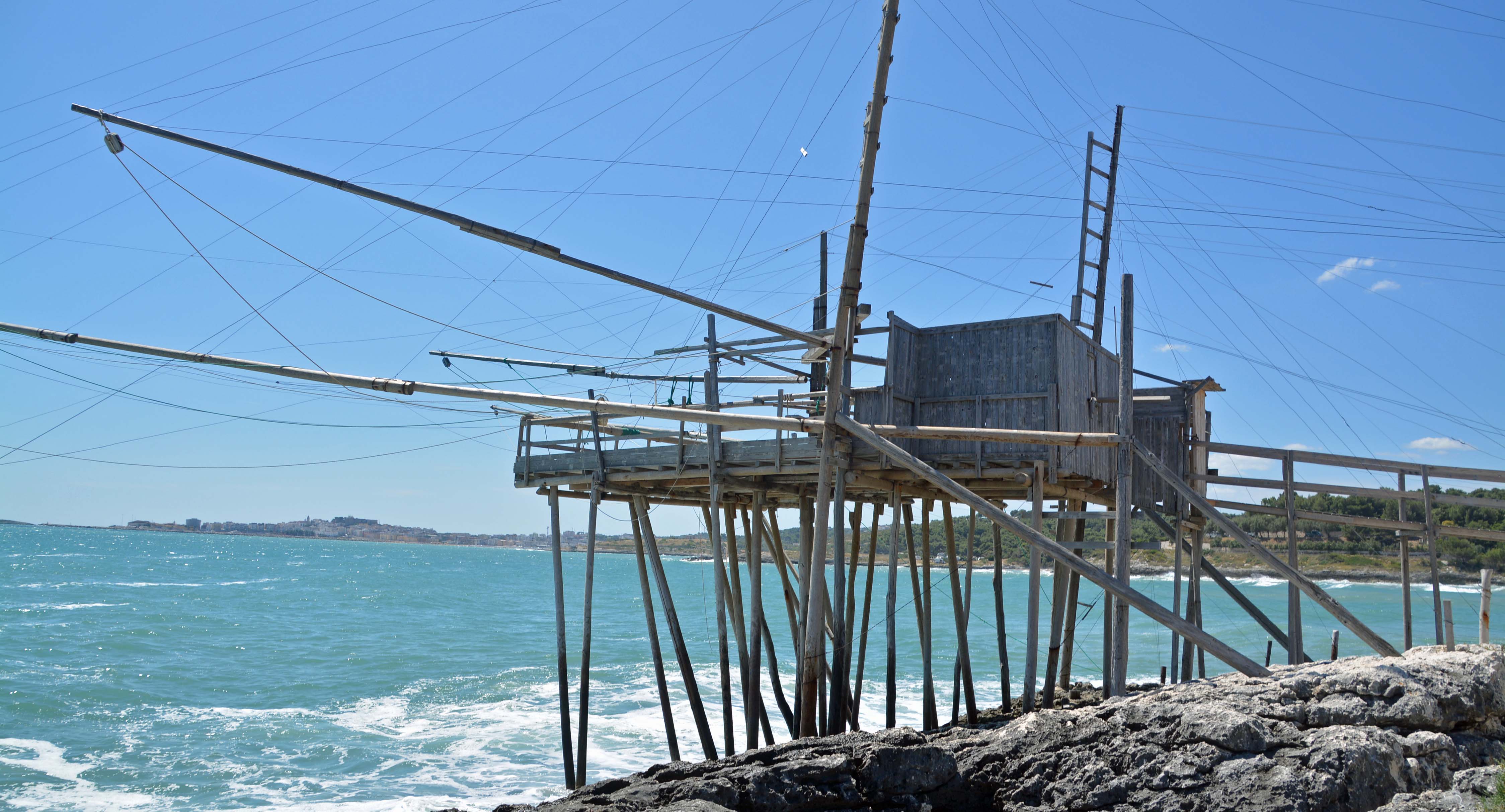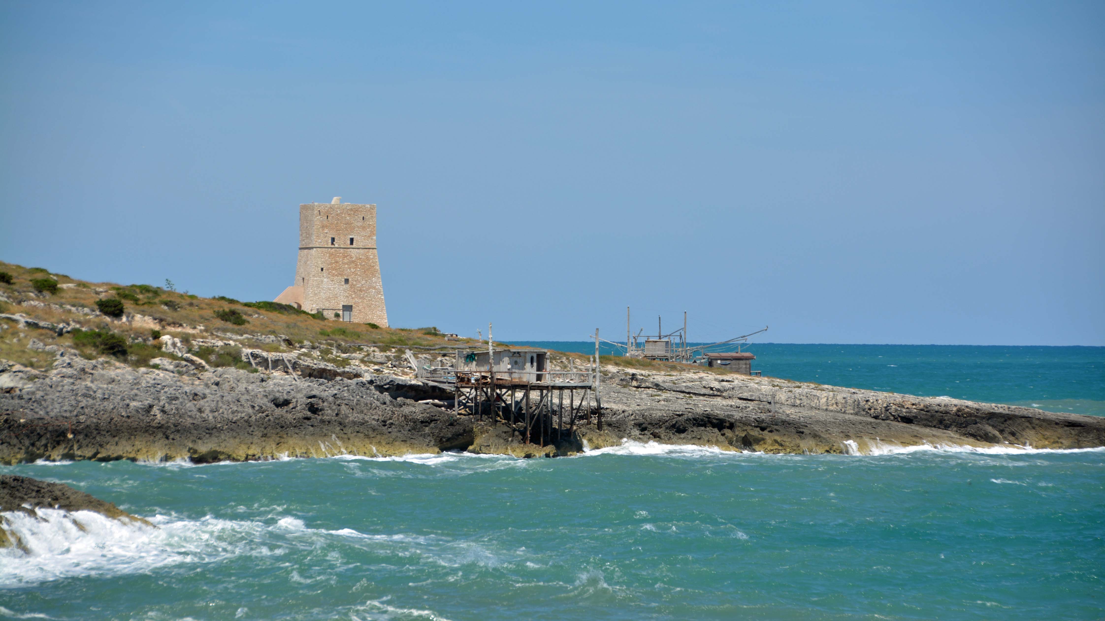 Andererseits zieht es mich zu dem auf einem Felsvorsprung liegenden ‚Trabucco‘, einer genialen Apparatur, um trockenen Fußes zu fischen. Typisch für den Gargano und fast schon ein Wahrzeichen. Ich schnappe mir die Badesachen und gehe auf Fototour. Nur kurz über die kleine Straße und schon laufe ich durch den bräunlich-pudrigen Sand direkt zum Meer. Es hat immer noch herrliche Wellen, das Baden ist eingeschränkt, aber möglich.