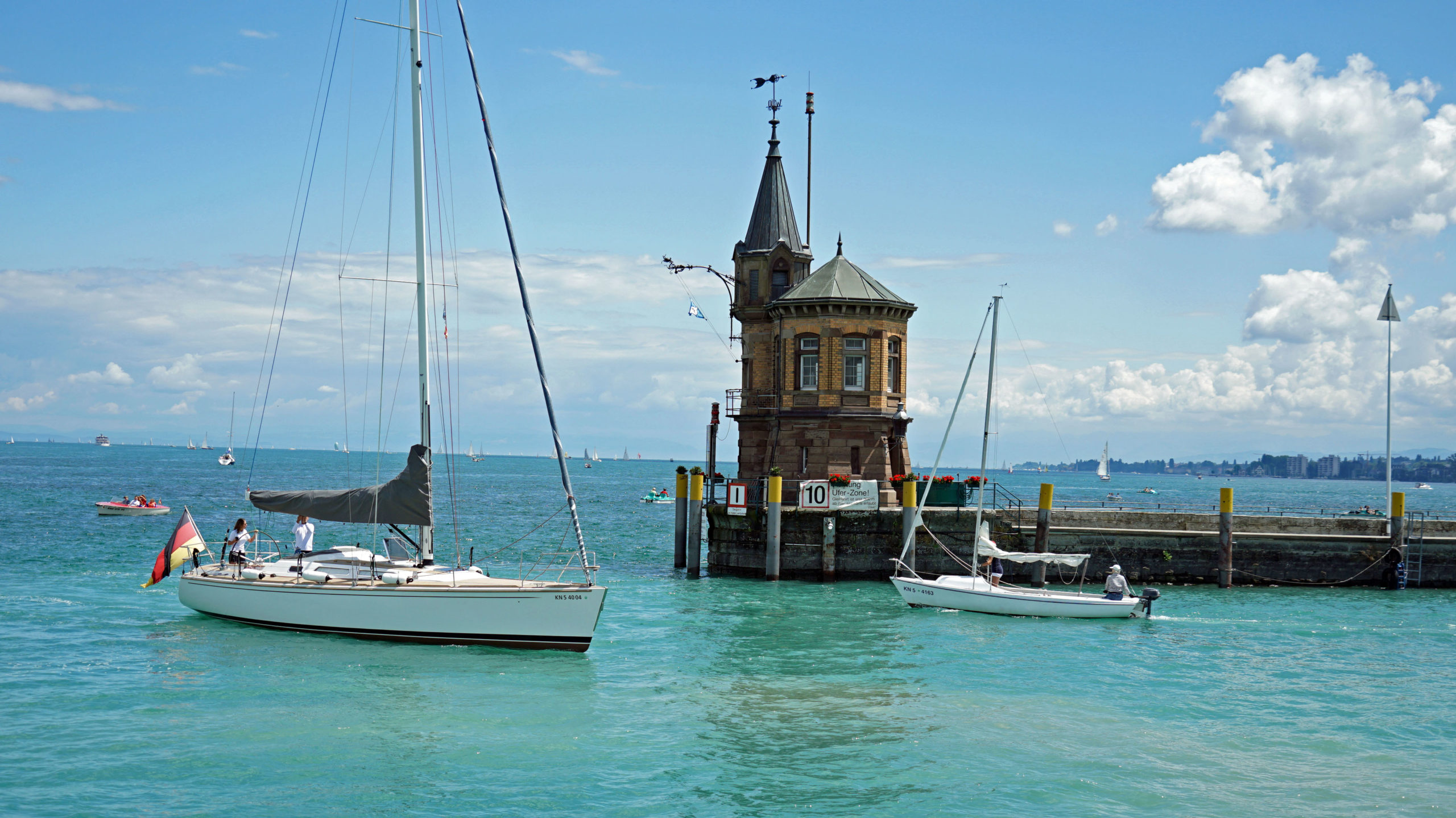 Danach laufe ich zur Madame Imperia an der Hafeneinfahrt. Sie ist das weltweit größte Denkmal einer Kurtisane und wirkt auf mich fast wie eine Art Freiheitsstatue. Die neun Meter hohe aus Beton gegossene Figur wiegt 18 Tonnen und dreht sich innerhalb von vier Minuten um ihre eigene Achse. Leider ist der Mechanismus derzeit defekt. Madame Imperia ist eine sarkastische Anspielung auf die Mätressenherrschaft zur Zeit des Konstanzer Konzils. Sie nimmt mit Narrenkrone, dem Papst und dem Kaiser in ihren Händen die Machthaber vergangener Jahrhunderte auf die Schippe.