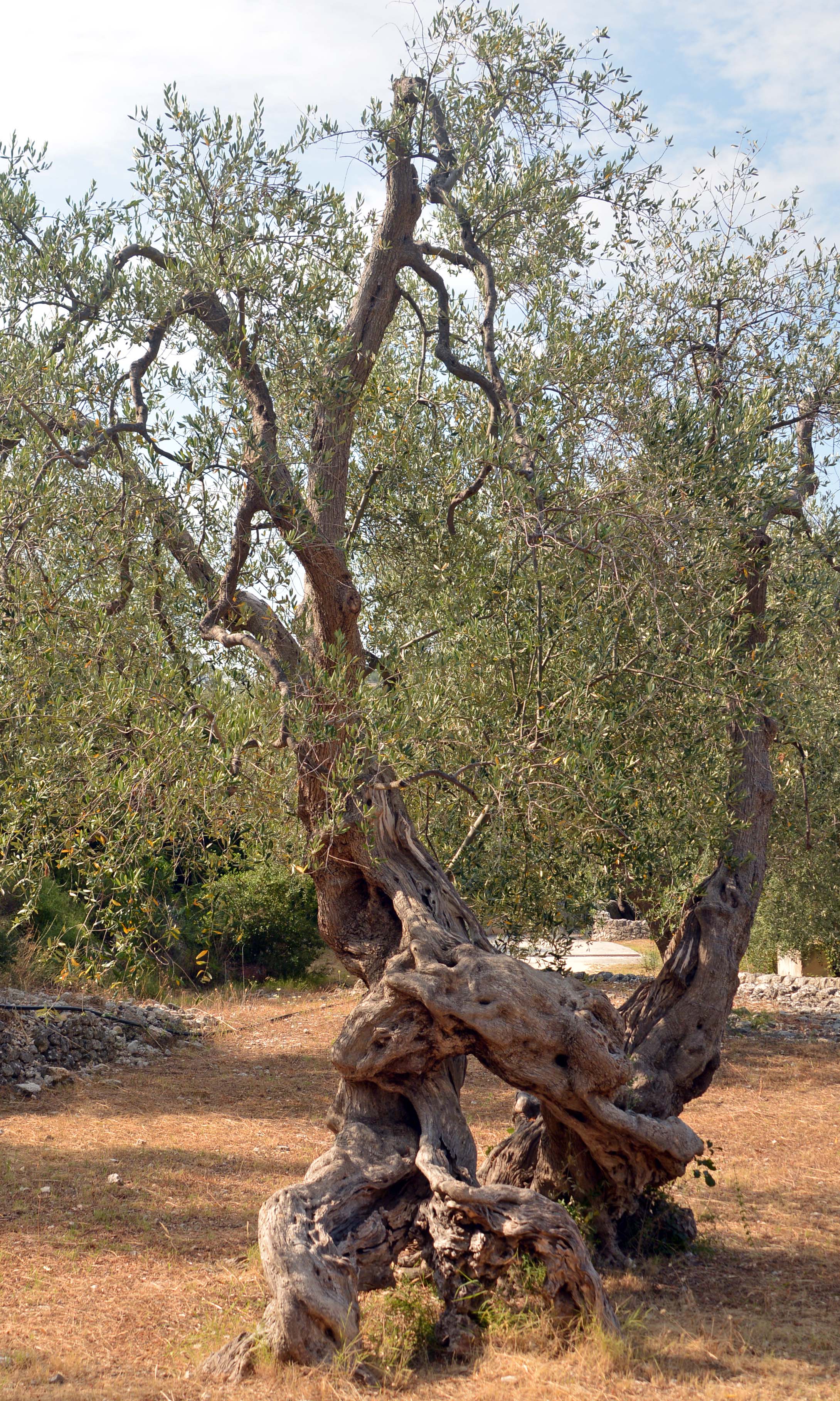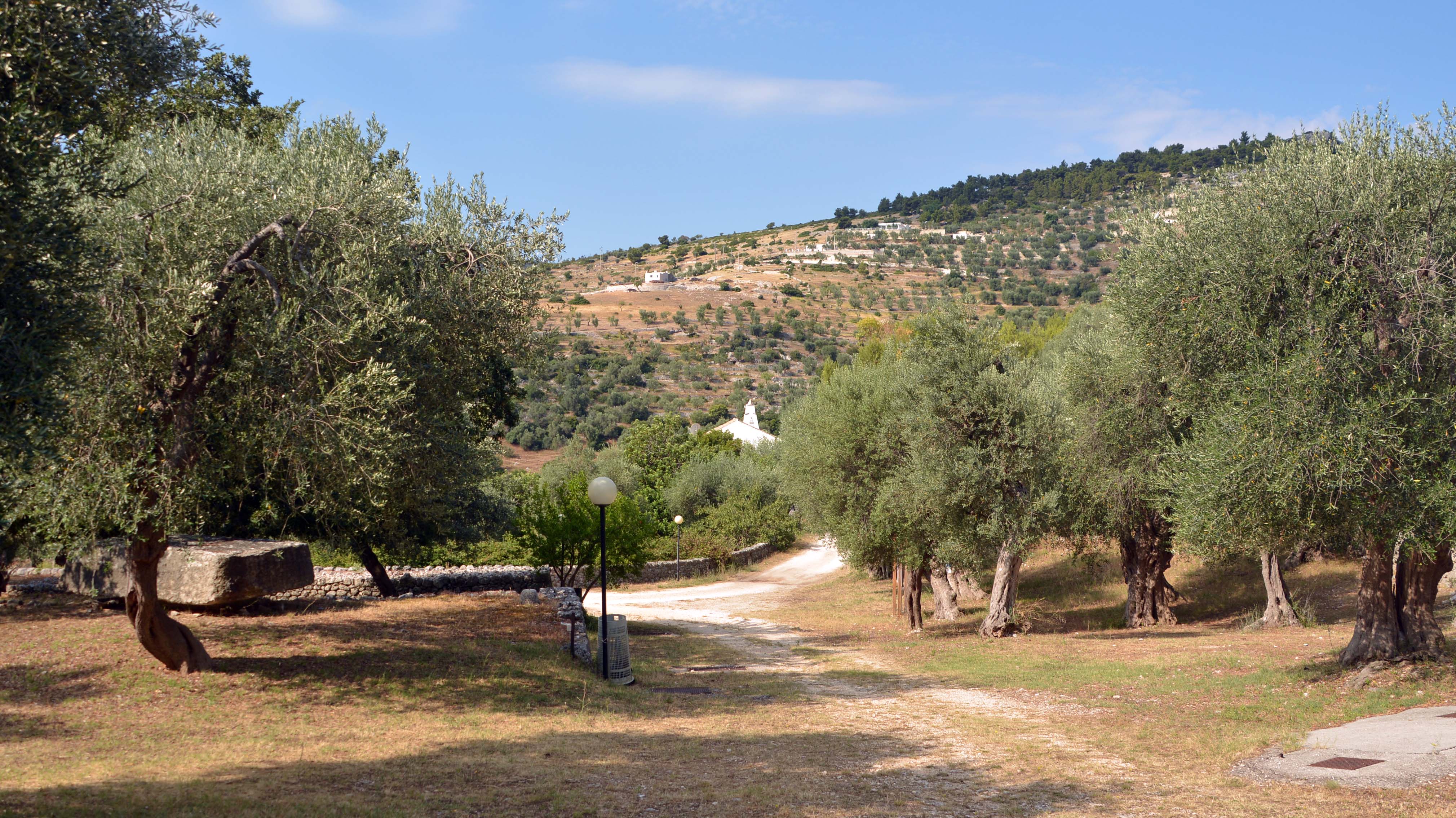 Diesmal erreiche ich den Brezza tra gli Ulivi auf den Meter genau und wir sind schon zu Zweit. Ein Italiener leistet mir Gesellschaft auf dem sehr großen, gepflegten Olivenhain. Der Pool ist wegen des Wetters heute geschlossen, leider. Ansonsten gibt es Öl aus eigener Produktion und ein nettes Restaurant. Ich chille ein bisschen, mache mich landfein fürs Restaurant und treffe dort auf einen deutschsprachigen Kellner. Ich speise vorzüglich, bekomme noch eine apulische Spezialität Pattoli (kleine frittierte Kugeln aus Mehl, Wasser und Salz) geschenkt und ein Fläschchen hauseigenes Öl, weil heute wegen einer großen Geburtstagsfeier keine Probe möglich ist. Das nenne ich doch mal ganz großes Service-Kino! Überhaupt was das Essen ausgezeichnet: ein wunderbarer gemischter Salat, Malenzane überbacken und eine besonders leckere Pizza Napoli mit Kapern und Sardellen. Dazu natürlich mal einen Vino Bianco.
